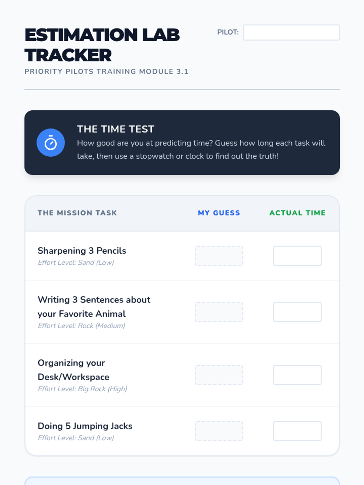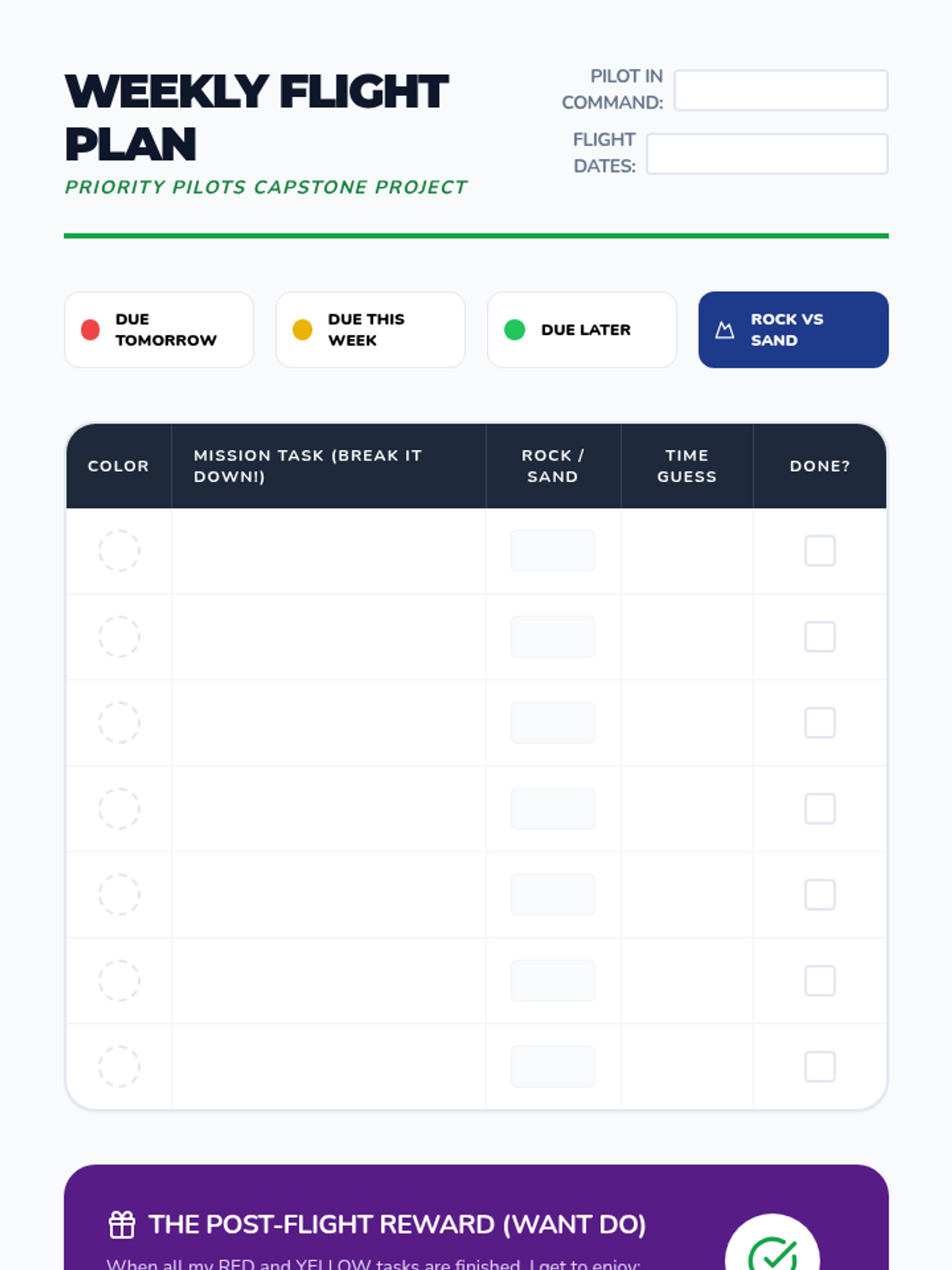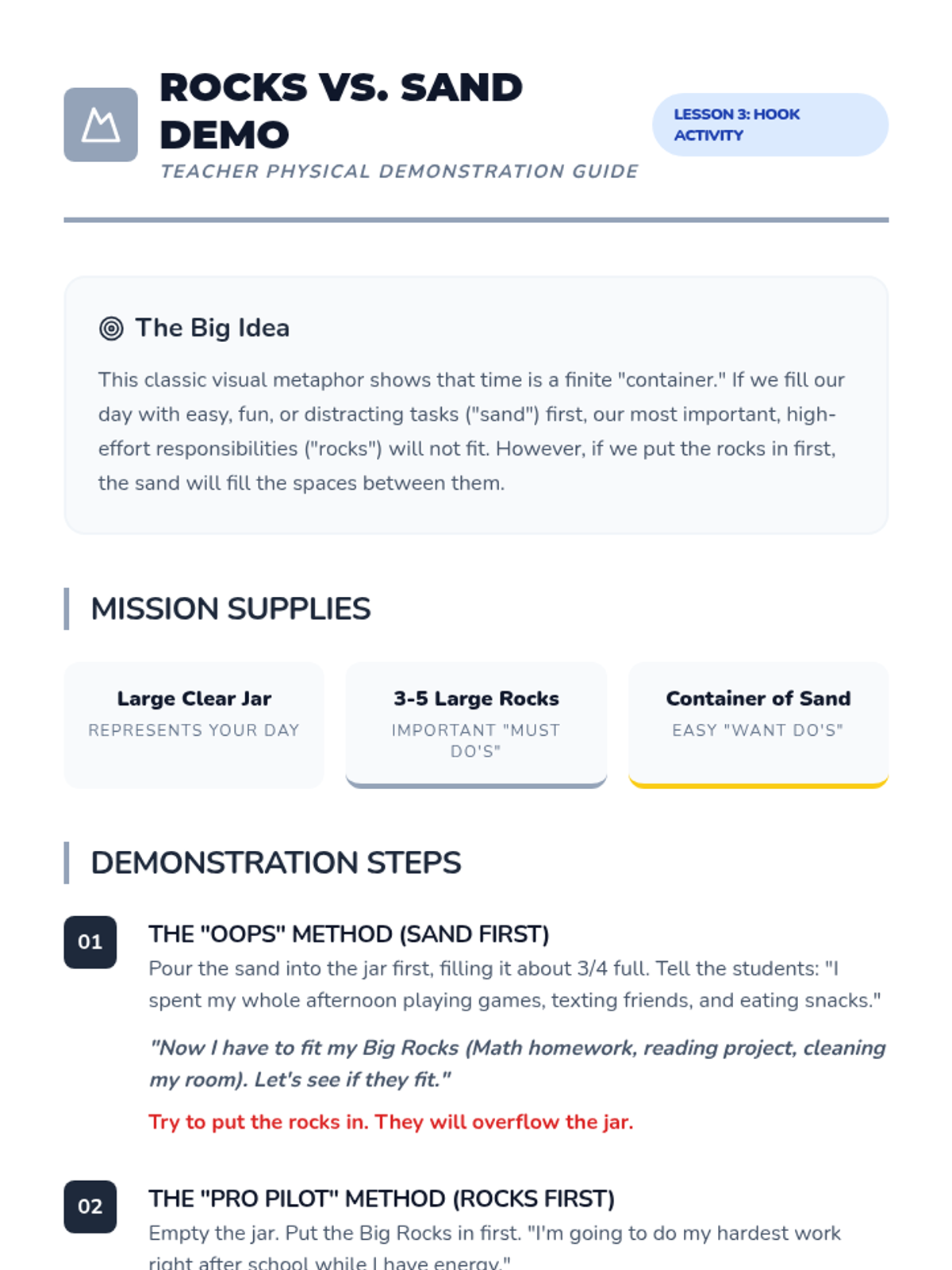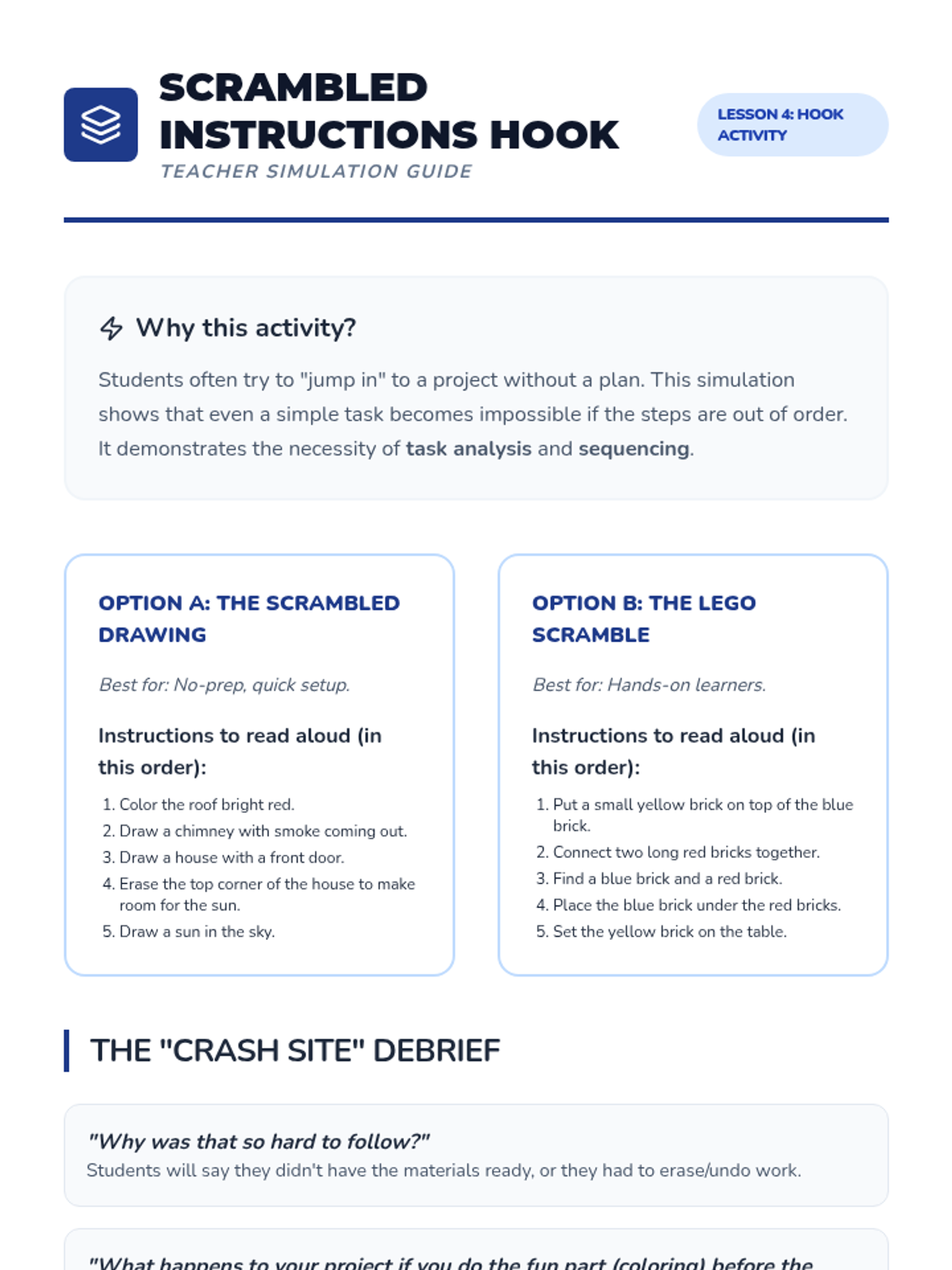 This sequence teaches 5th-grade students essential executive functioning skills for task prioritization. Students learn to distinguish between obligations and leisure, use a traffic light system for urgency, estimate time and effort, sequence multi-step projects, and create their own weekly plans using an aviation-inspired theme.