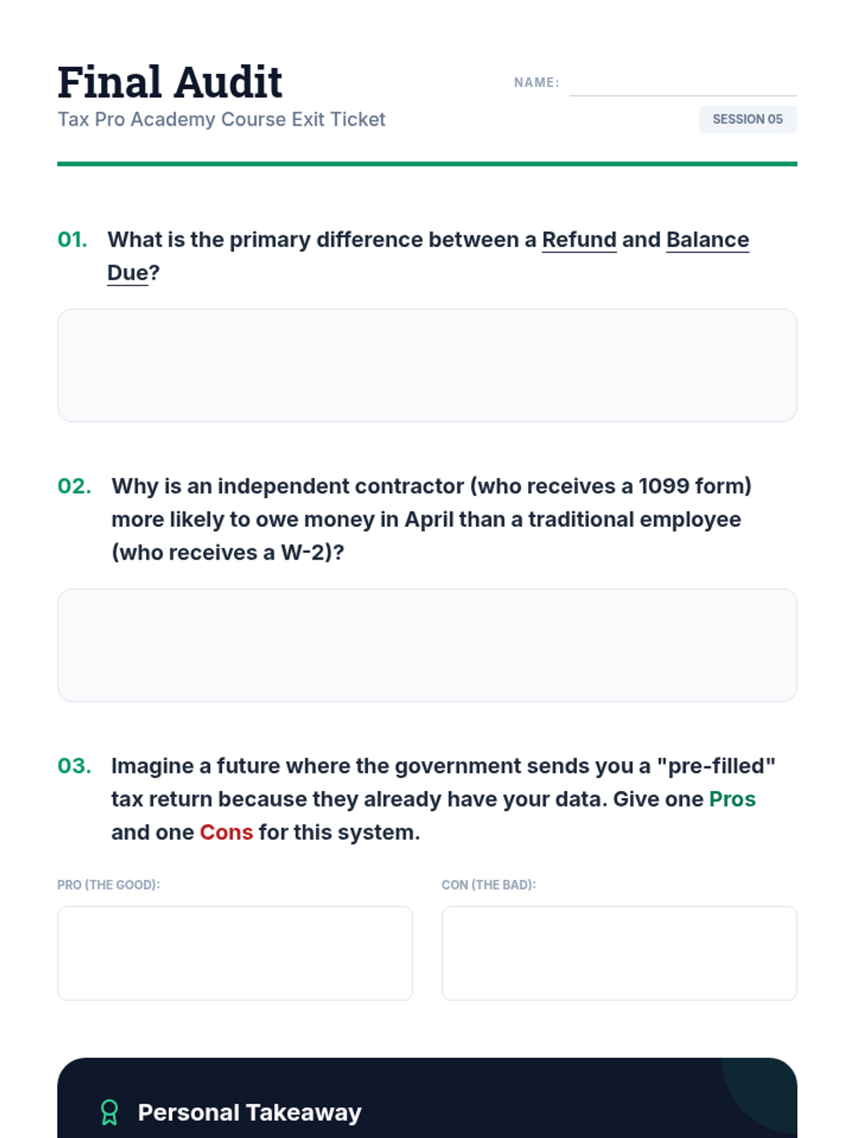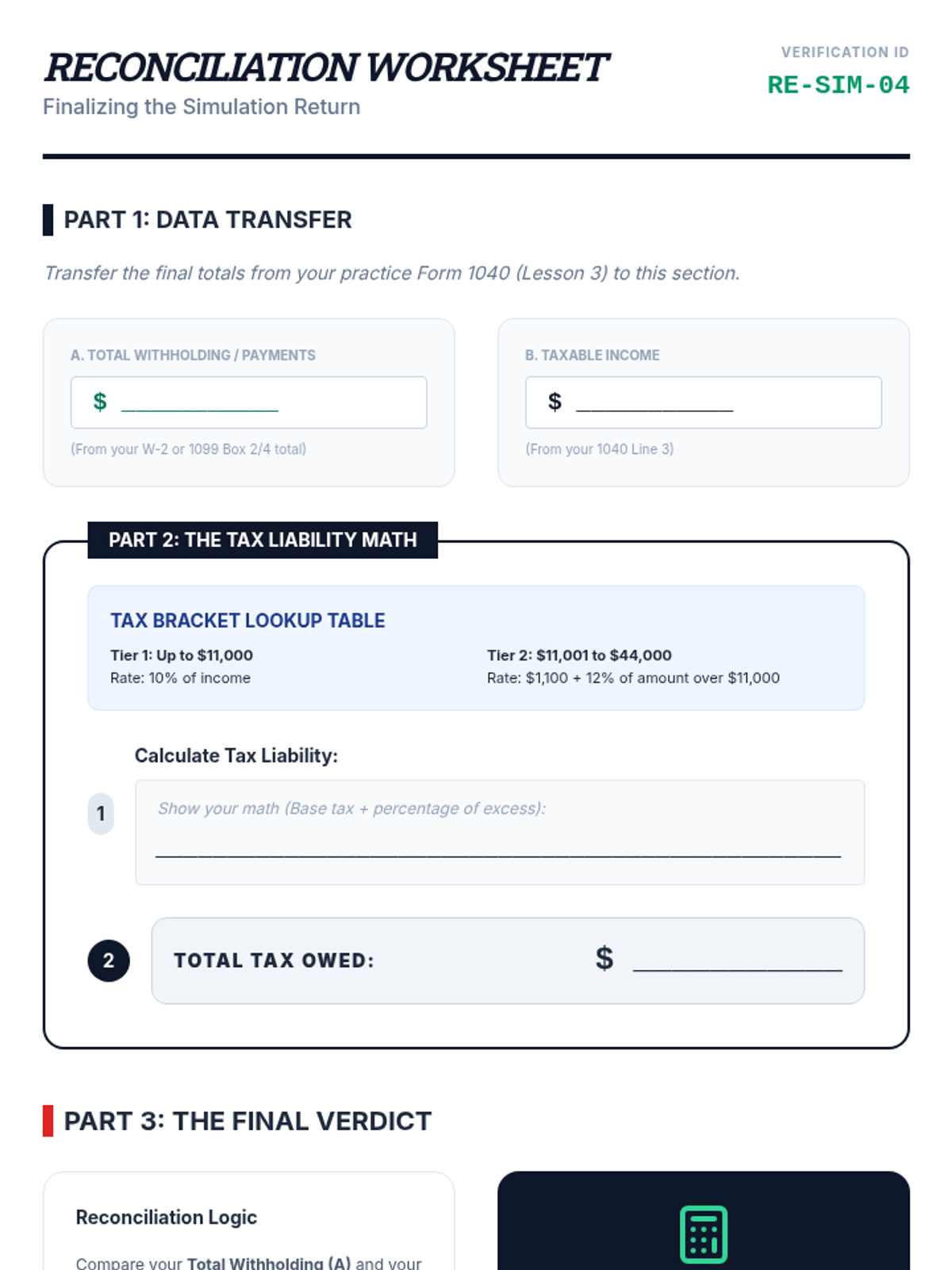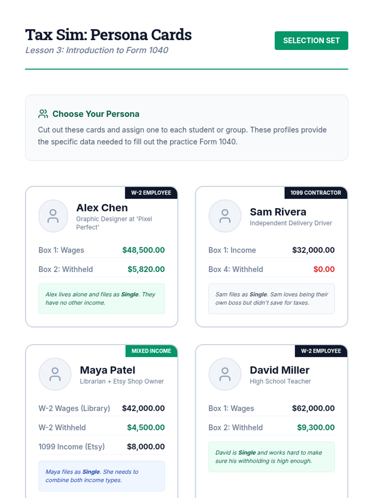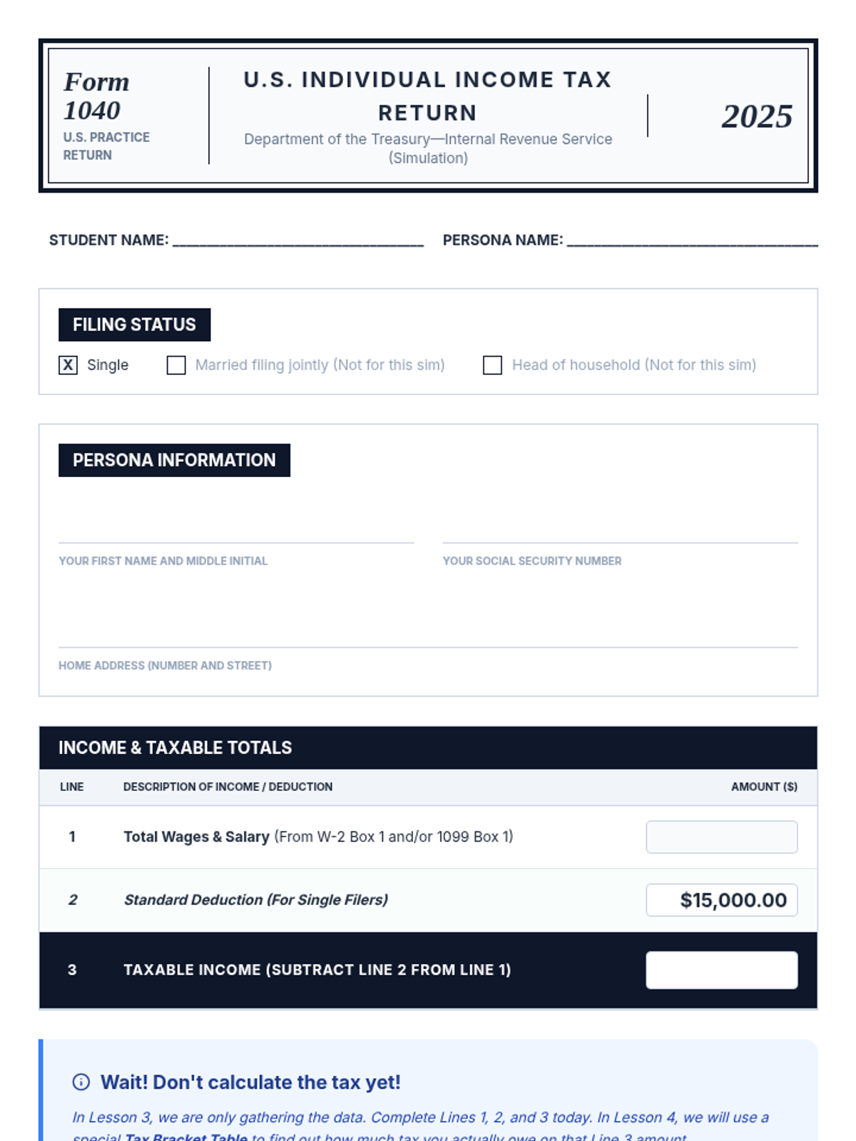A simulation-based sequence where students learn the end-to-end process of filing federal income taxes. Students adopt personas, analyze wage documents, and complete a simplified Form 1040 to determine if they receive a refund or owe money.
