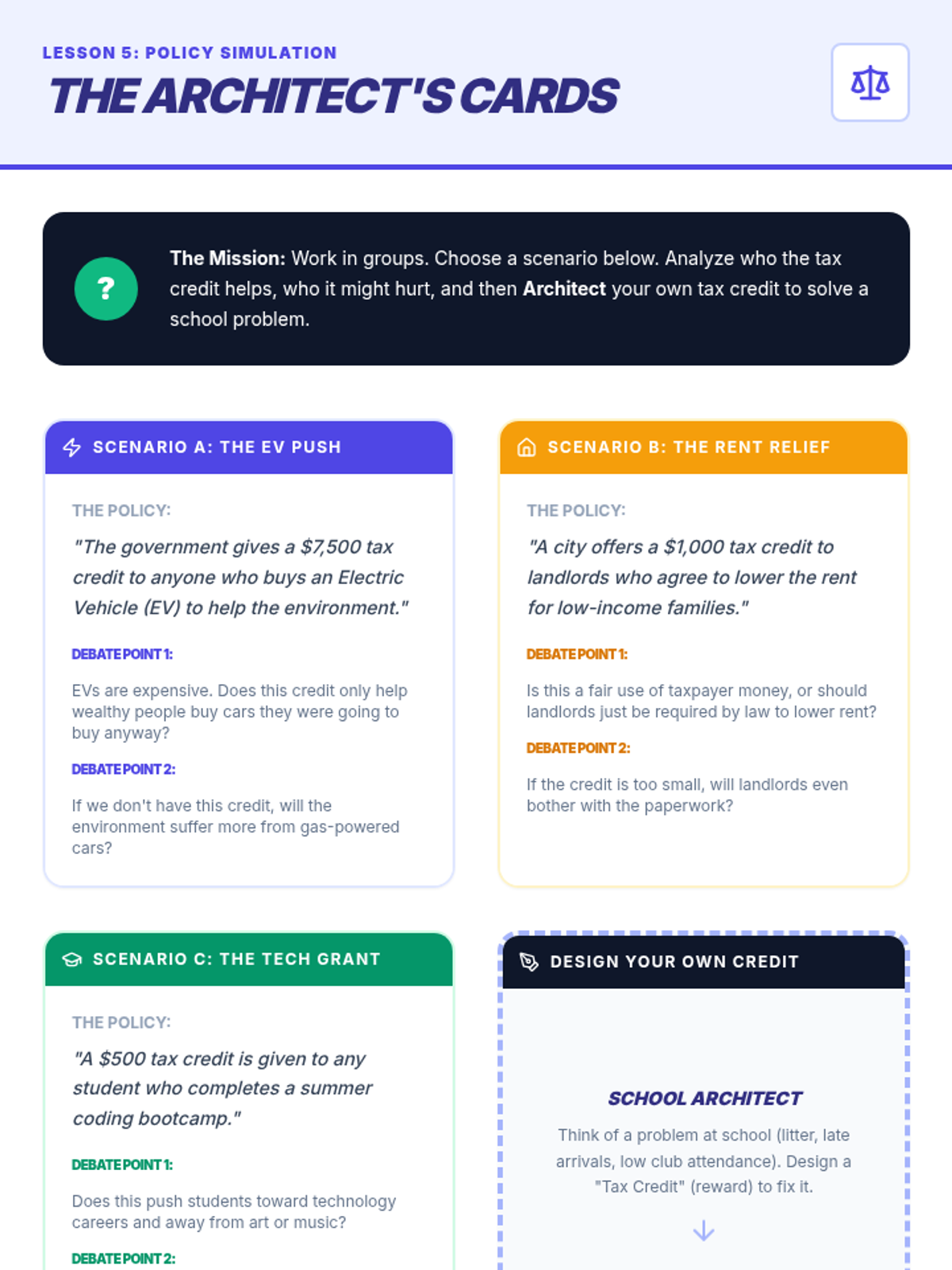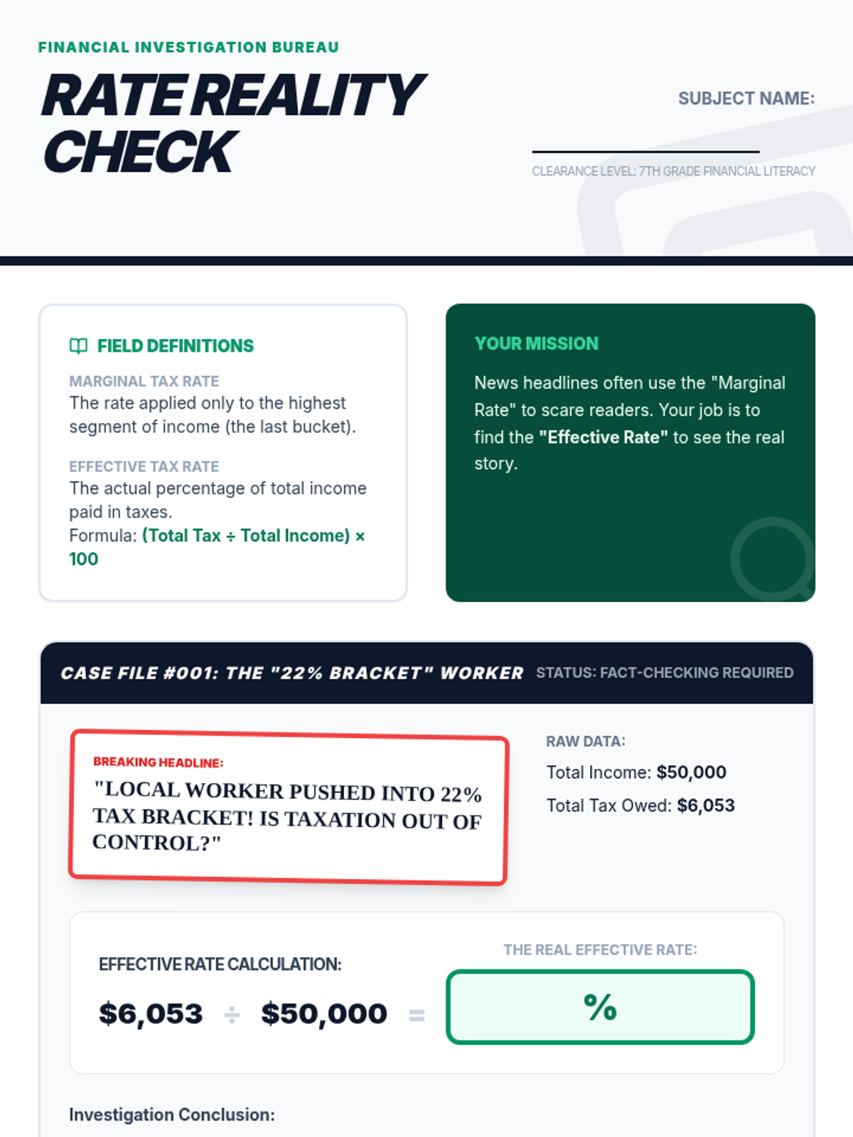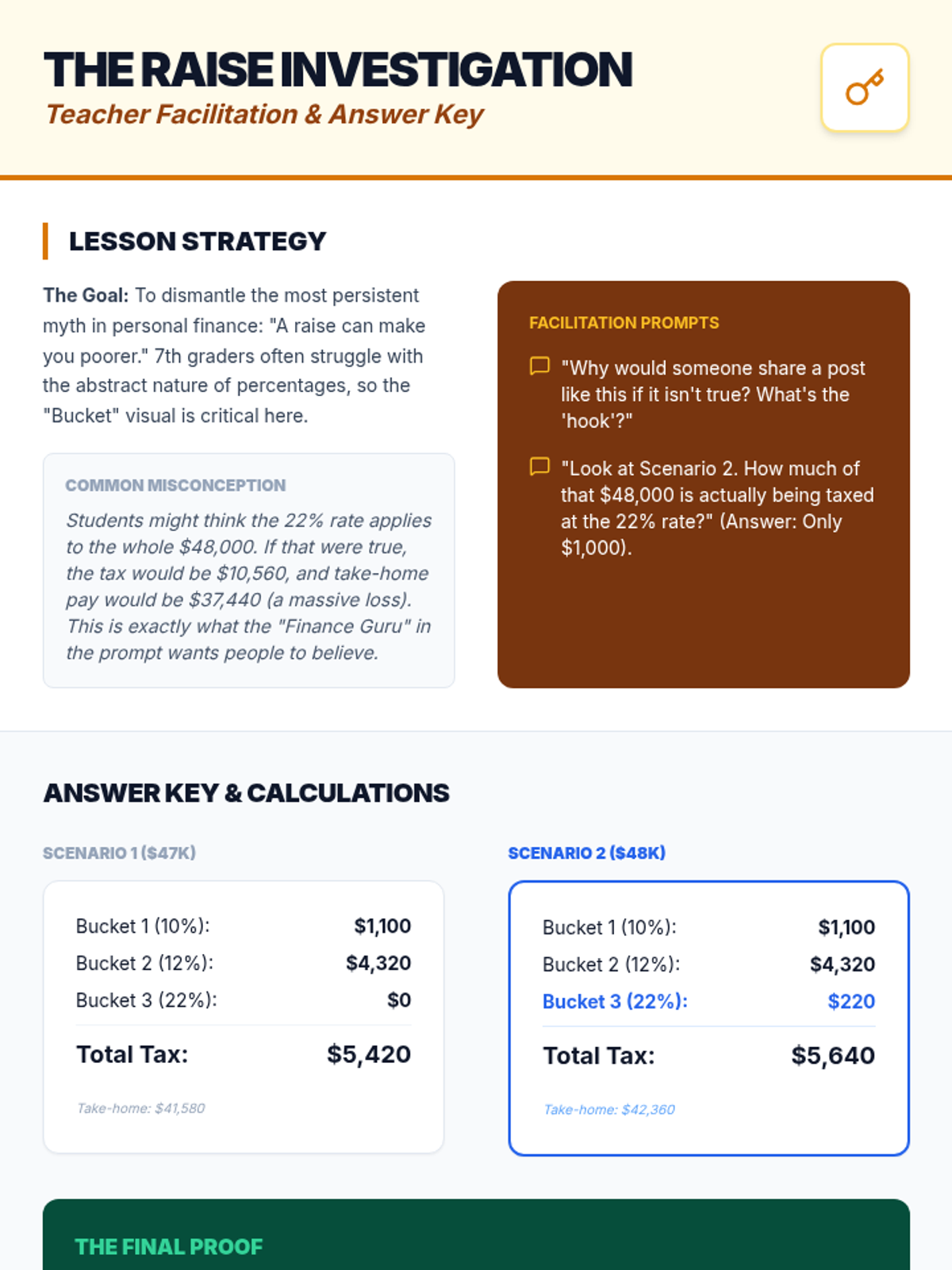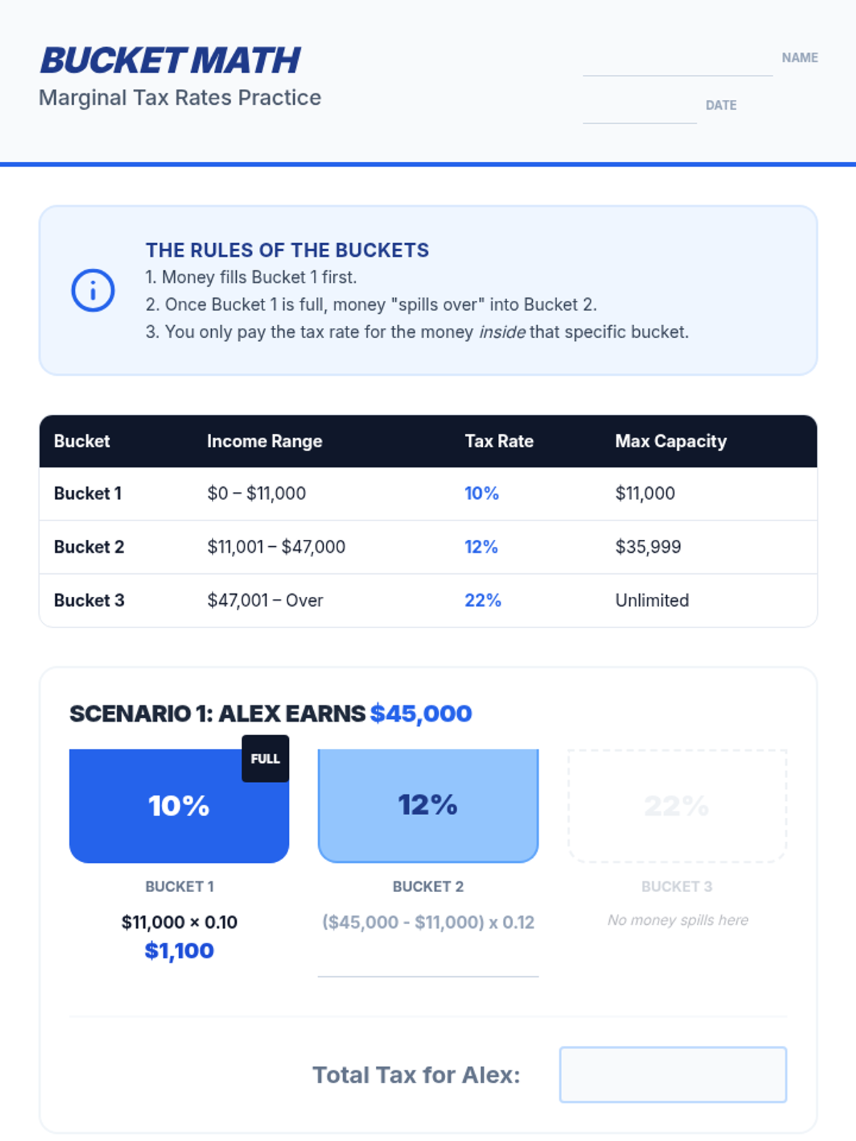 A comprehensive exploration of tax systems, marginal rates, and financial decision-making for 7th-grade students. This sequence moves from identifying types of taxes to mastering the math of tax brackets and evaluating the impact of tax policy on individuals and society.