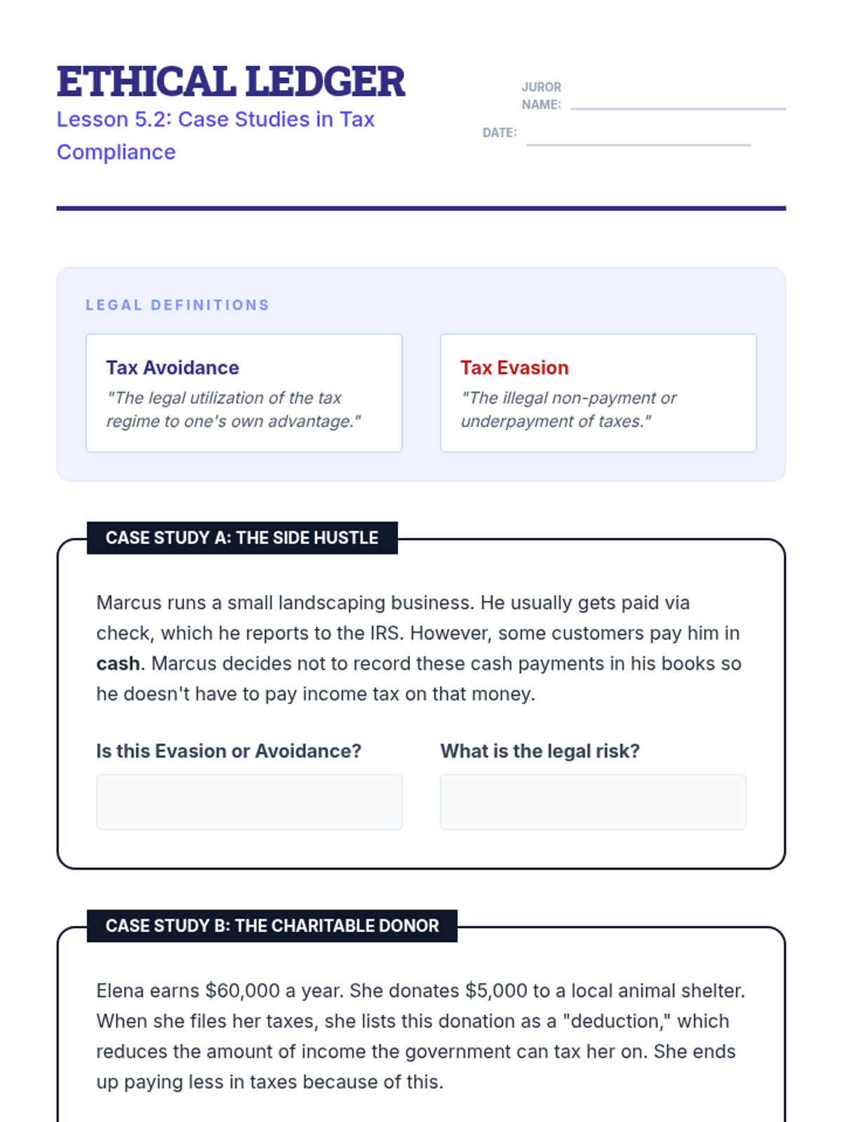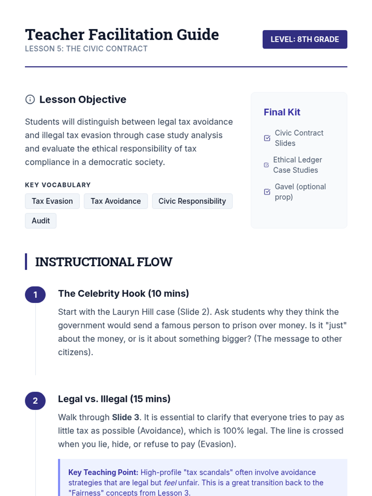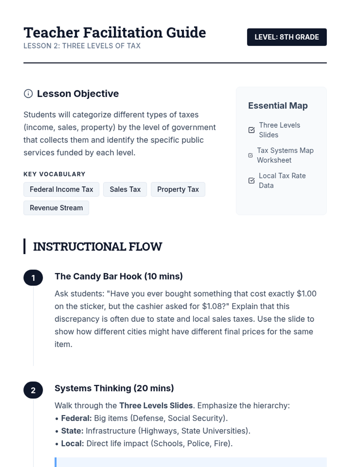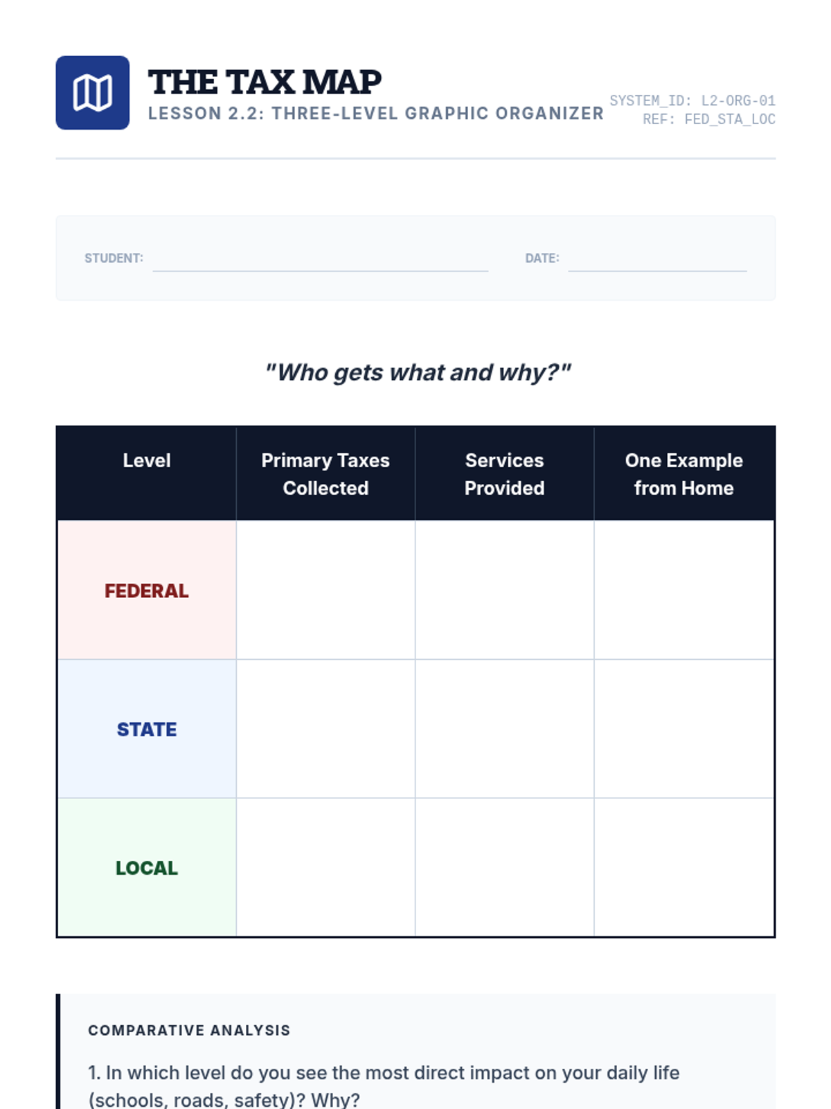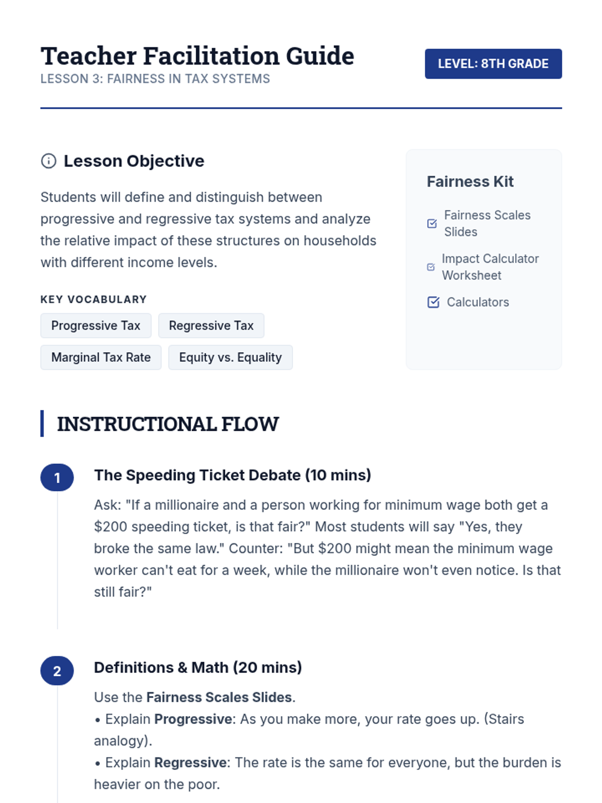 An introductory sequence for 8th graders exploring the purpose, structure, and ethical dimensions of the U.S. tax system. Students will learn how tax revenue funds public goods across federal, state, and local levels while debating the fairness of different tax structures.