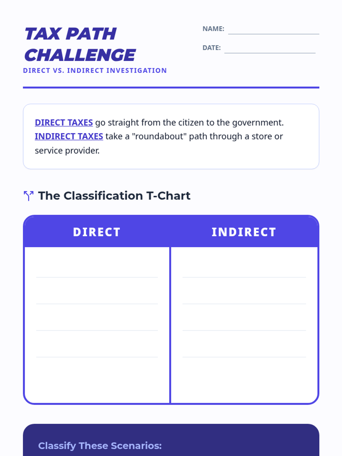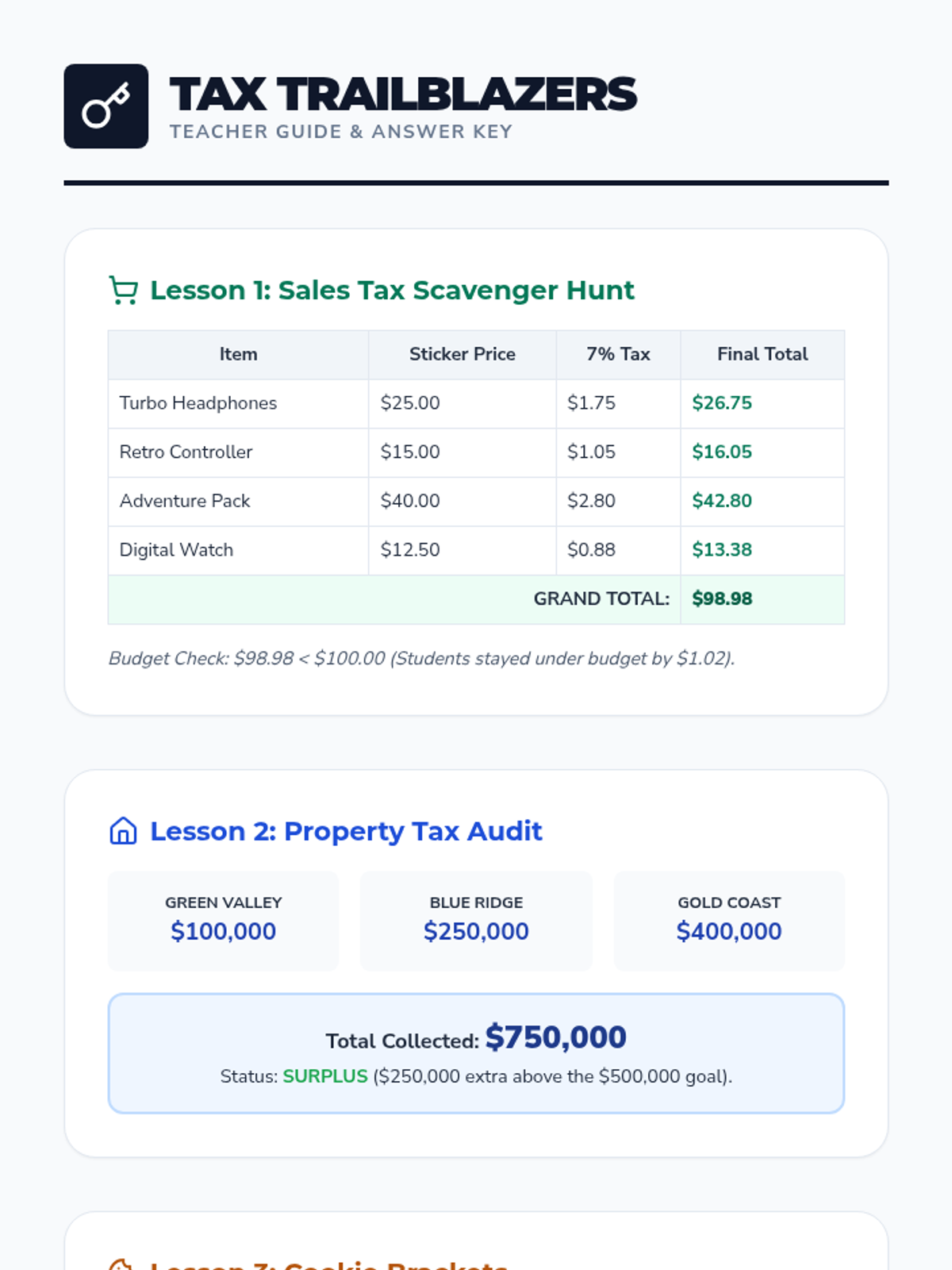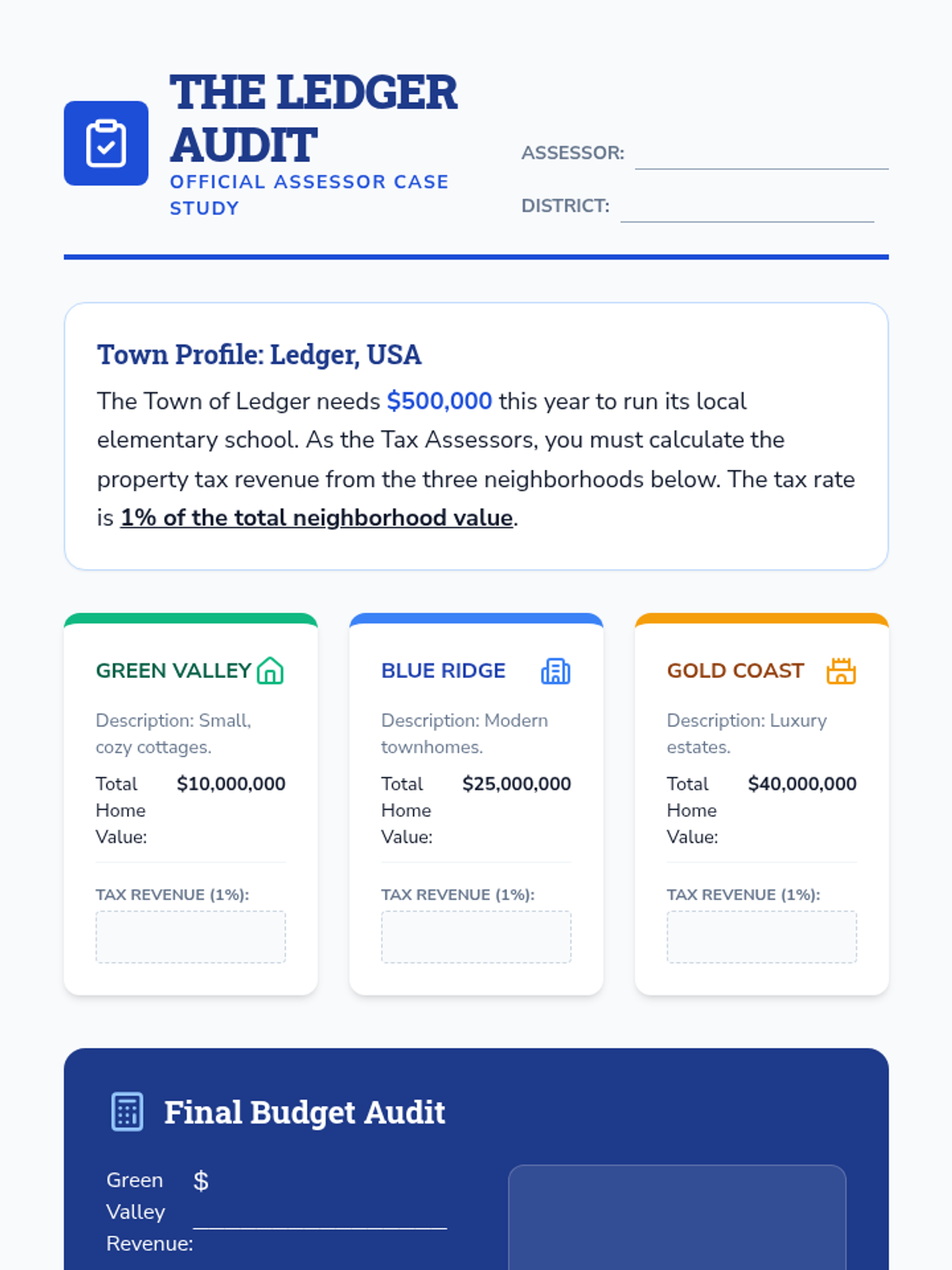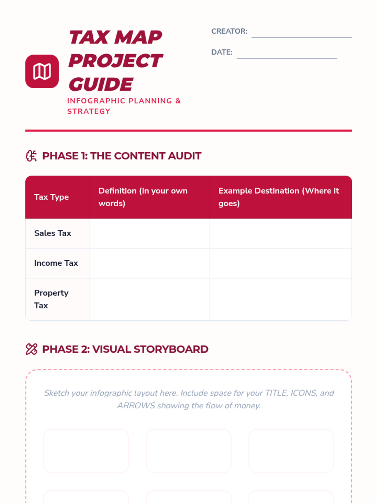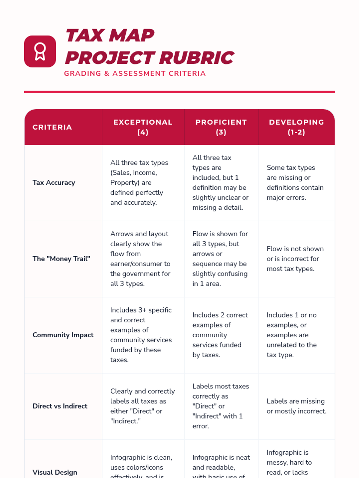 A comprehensive unit for 6th-grade students to understand the three primary types of taxes in the US: income, sales, and property tax. Students explore how these taxes fund community services and how they are calculated, concluding with a project-based infographic.
