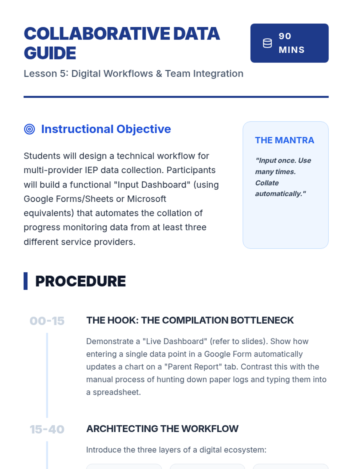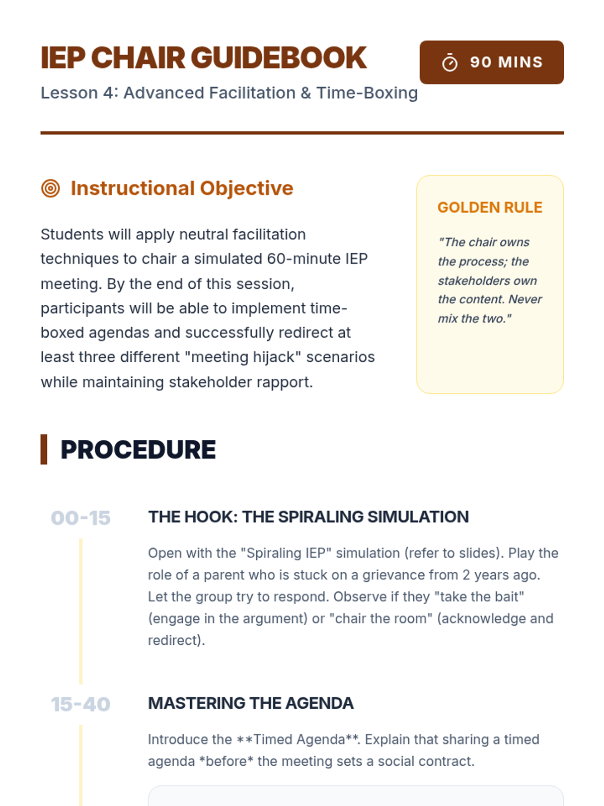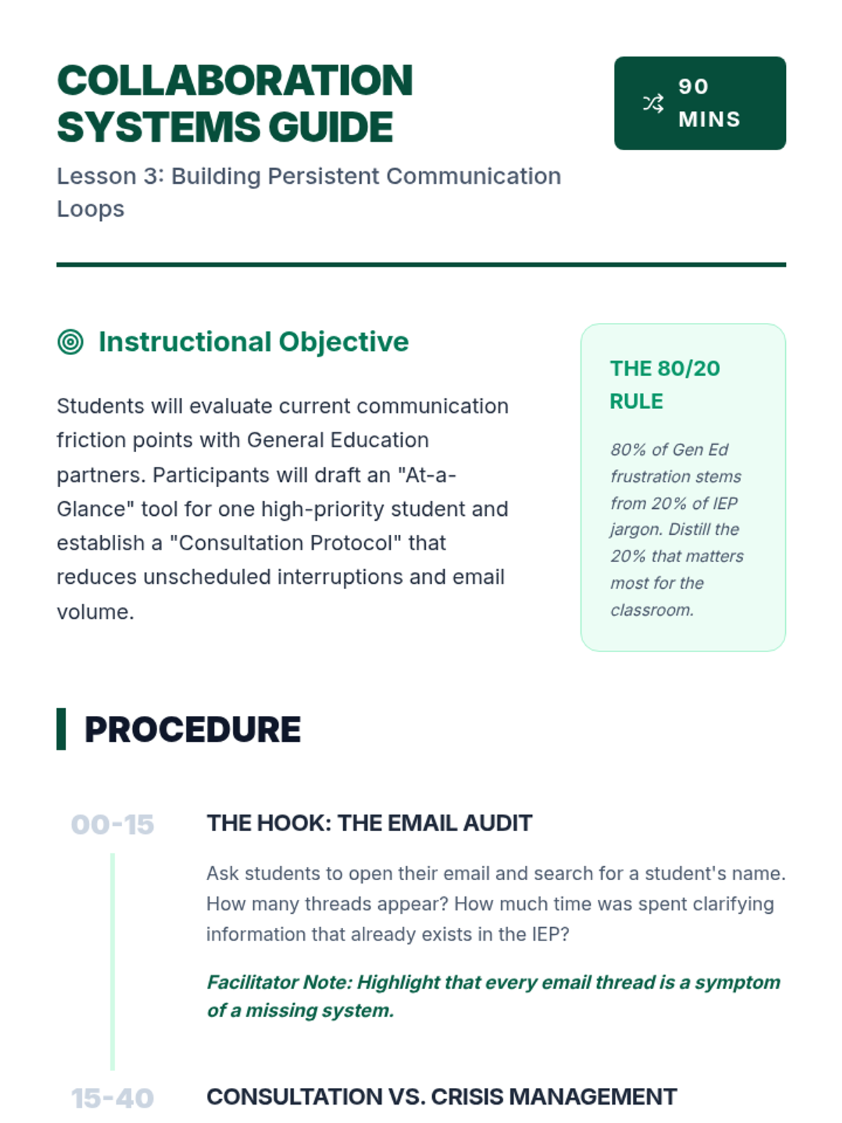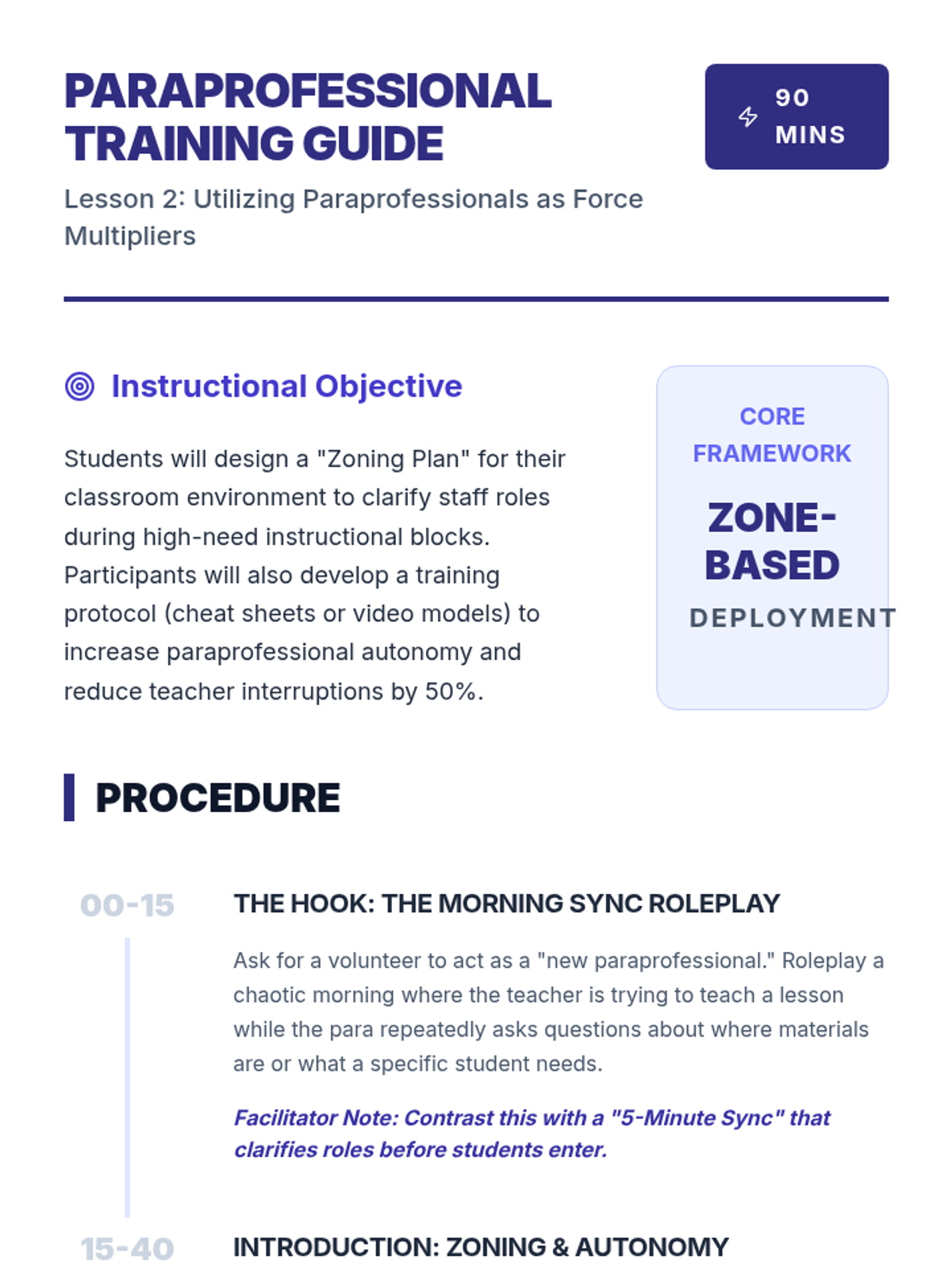 A professional development sequence for graduate-level special educators focused on transitioning from individual contributors to team leaders. The sequence emphasizes delegation, paraprofessional management, interdisciplinary collaboration, and meeting efficiency to maximize time and instructional impact.
