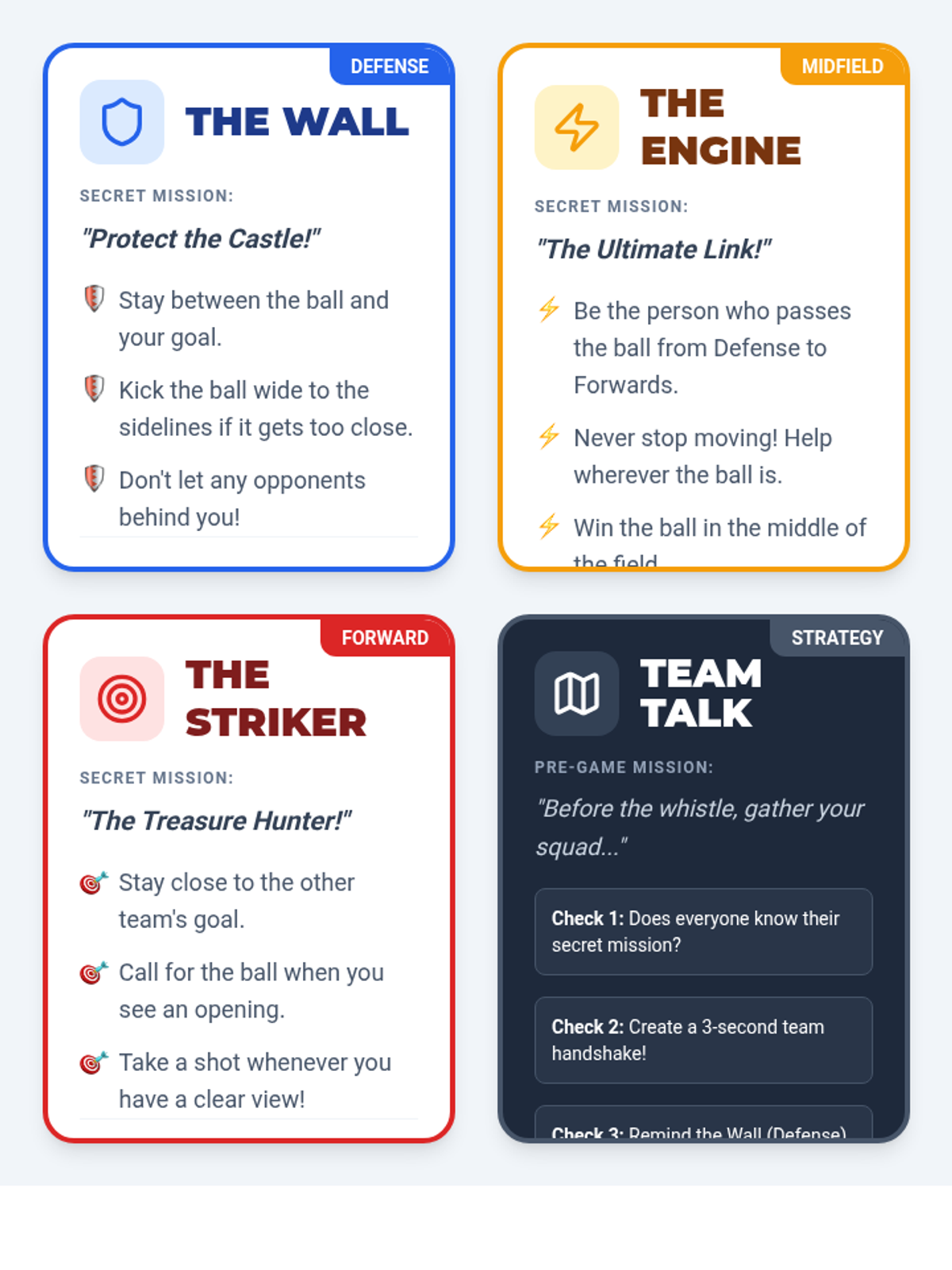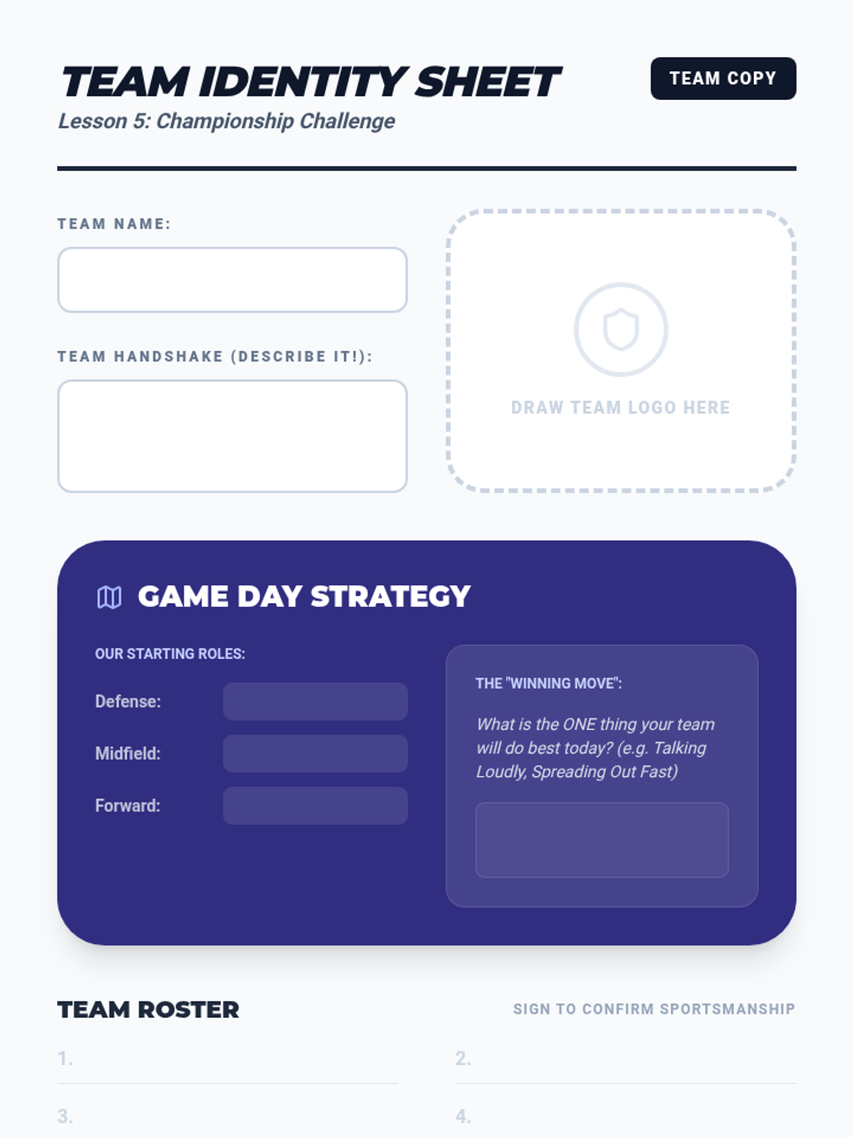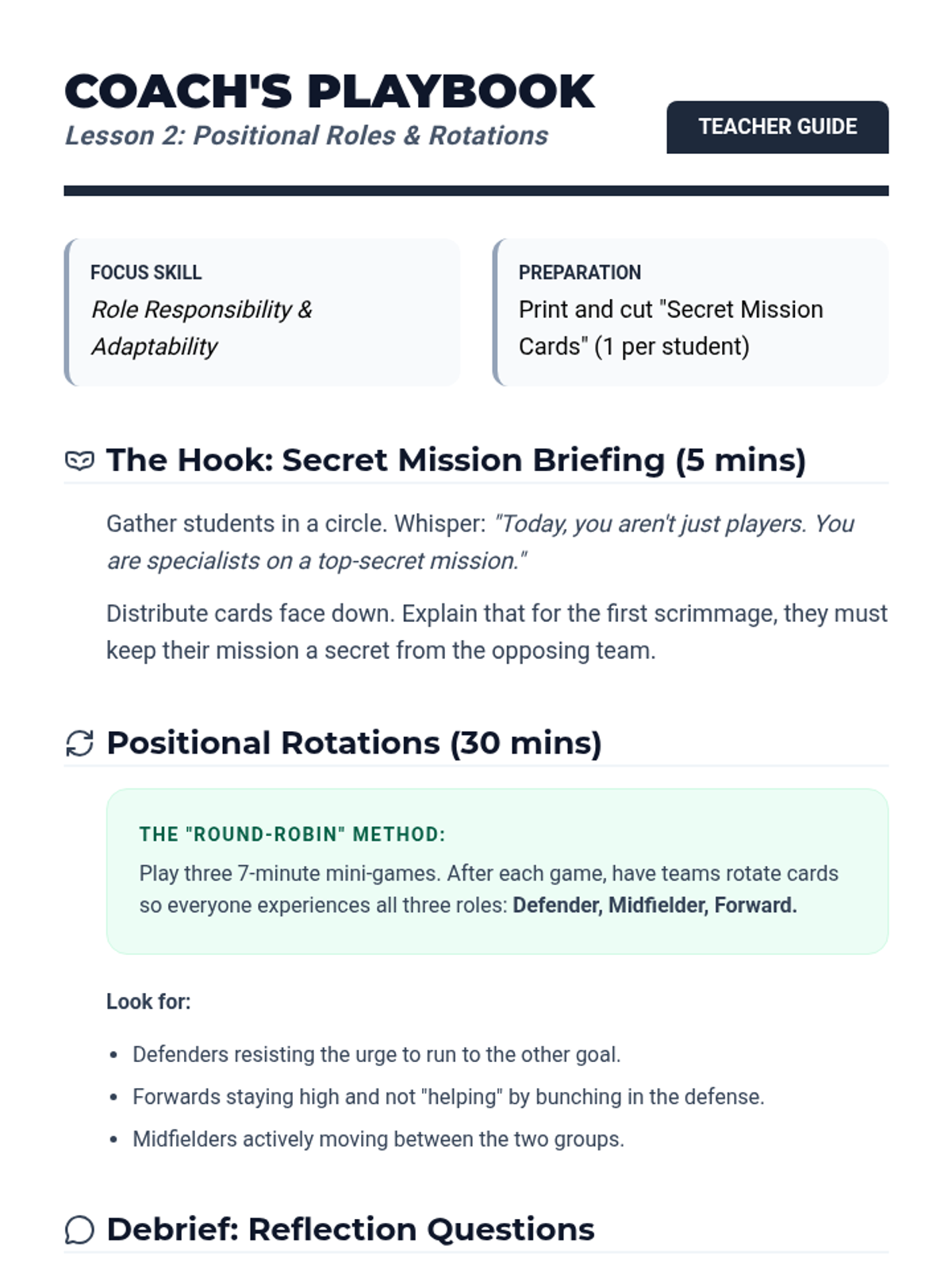 A 3rd-grade soccer unit focusing on spatial awareness, positional roles, game rules, and teamwork. Students move from understanding individual positioning to participating in a full-class tournament with an emphasis on sportsmanship.