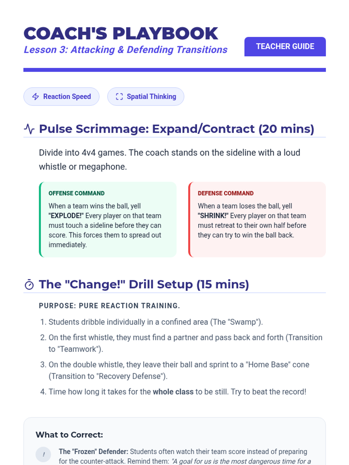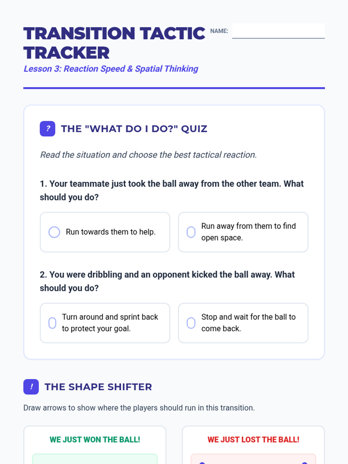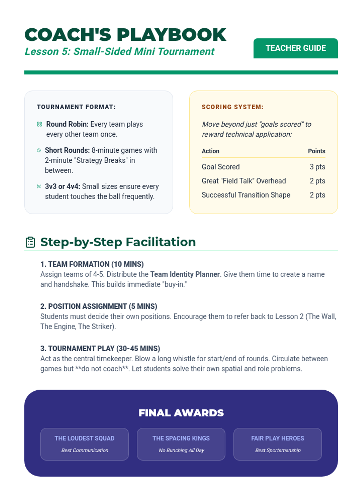 A comprehensive 3rd-grade soccer unit focusing on tactical gameplay, spatial awareness, and team coordination. Students move from individual ball control to understanding team positions, transitions, and communication in a tournament setting.