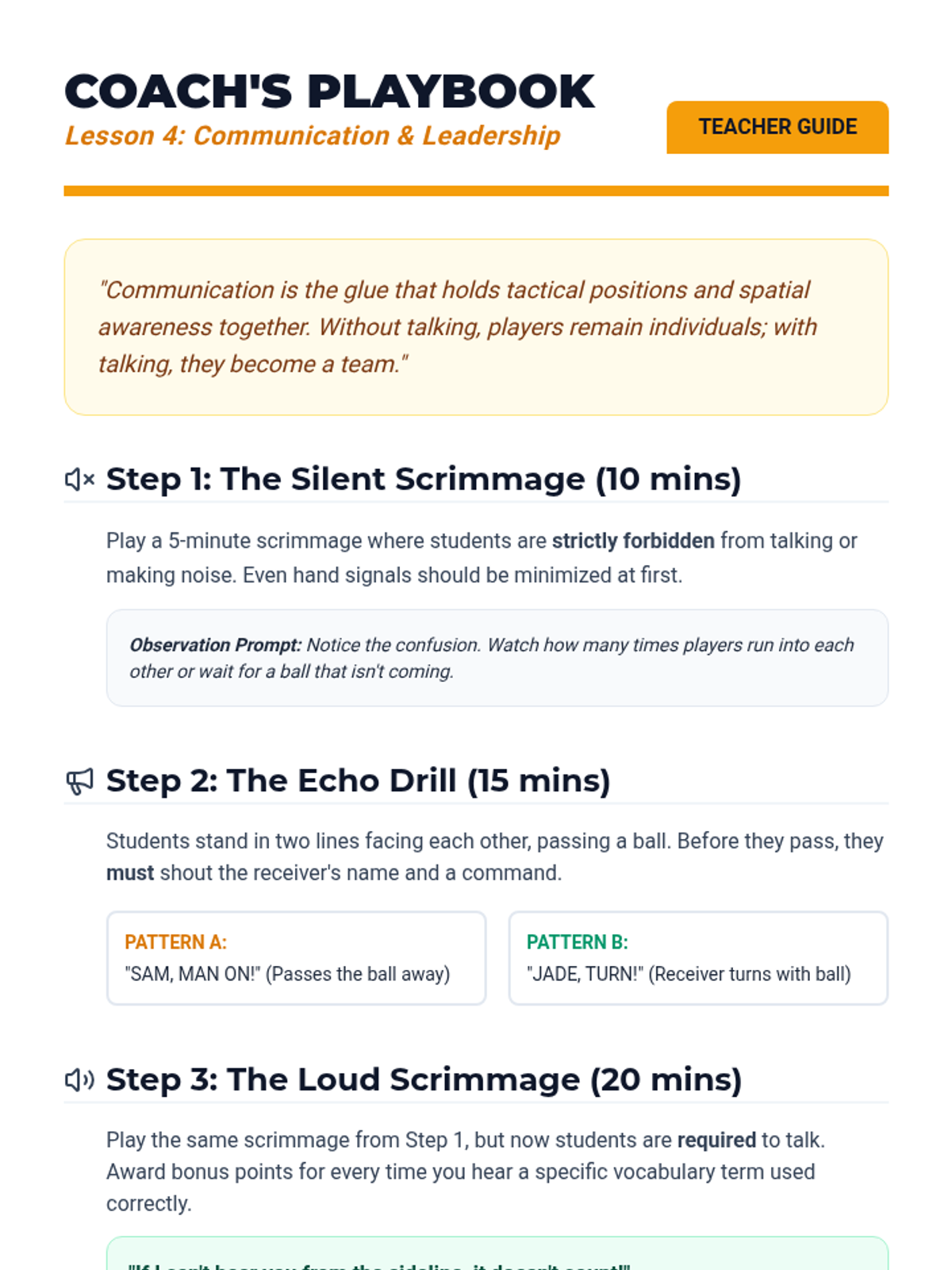 This sequence focuses on developing essential communication skills for 3rd-grade students through physical team-building activities. Students progress from basic verbal instructions to complex non-verbal cues and group synchronization, culminating in a complex problem-solving challenge.