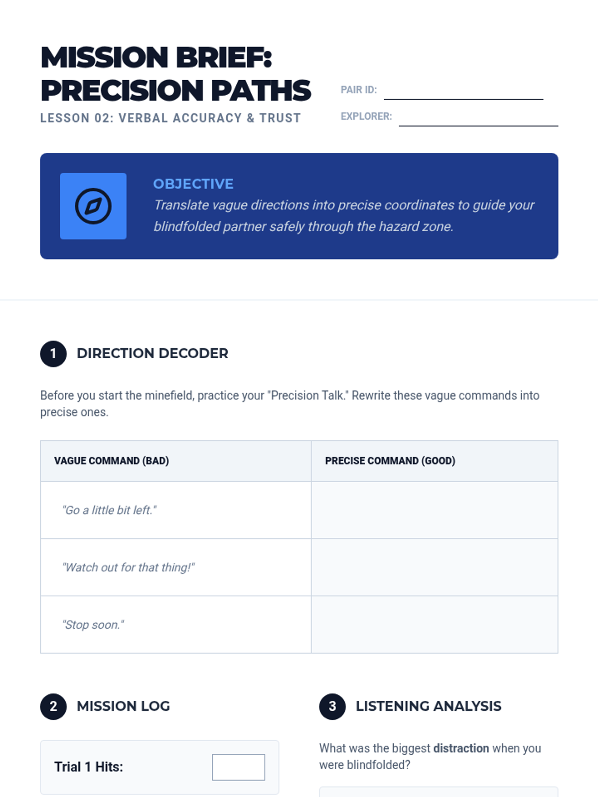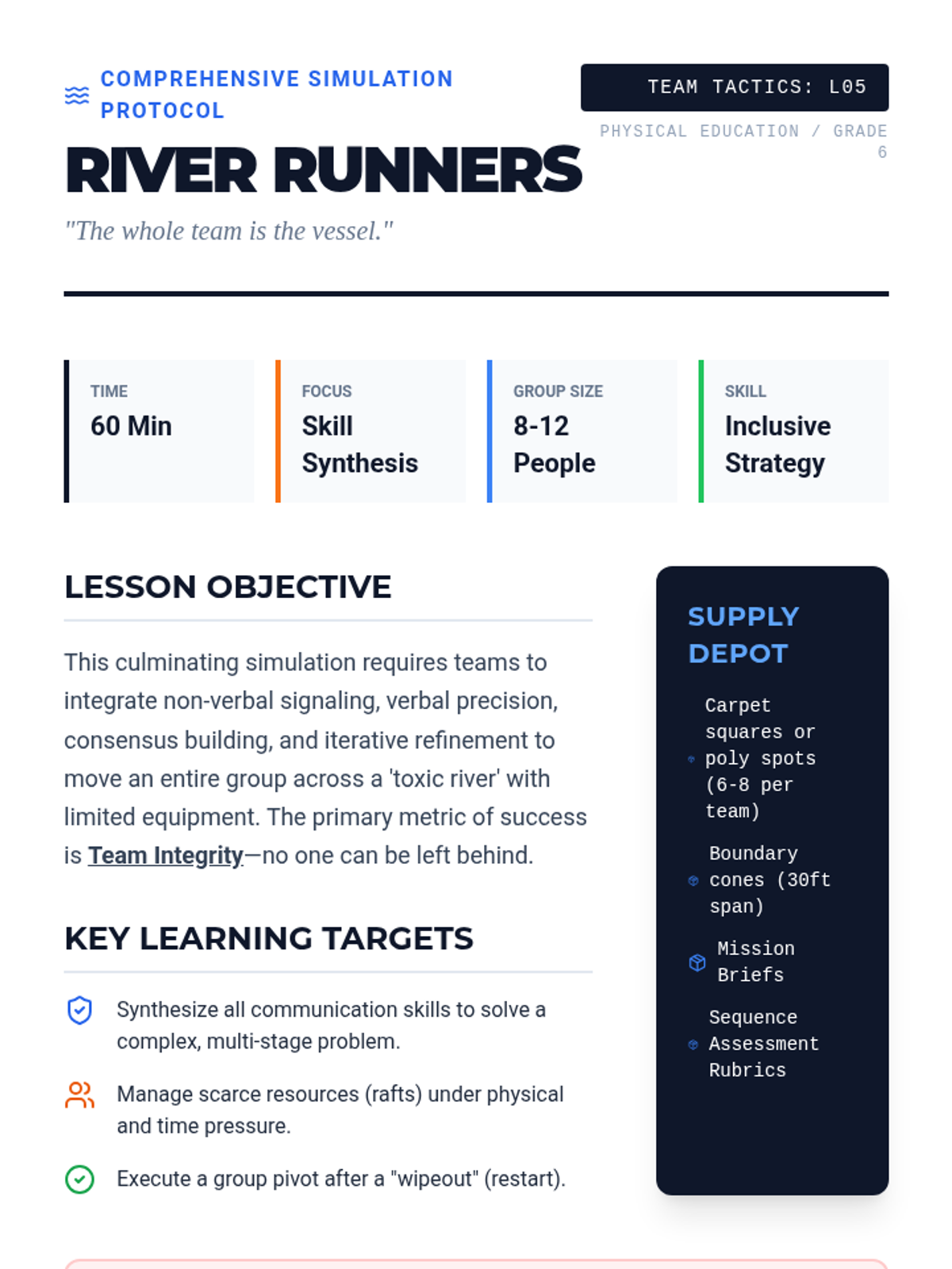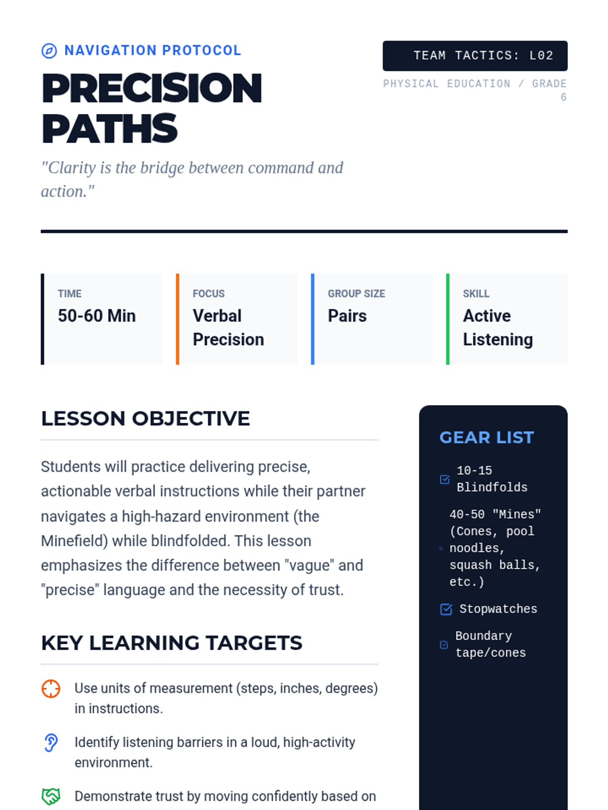 This sequence explores the critical role of communication in group success. Students progress from non-verbal coordination to complex, multi-stage problem-solving, learning to diagnose and fix communication breakdowns in physical challenges.
