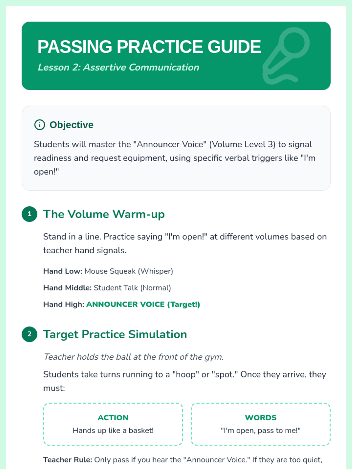 A Kindergarten Physical Education sequence focused on verbal coordination, positive encouragement, and basic team strategy. Students learn to use their voices to connect with peers and improve group play.
