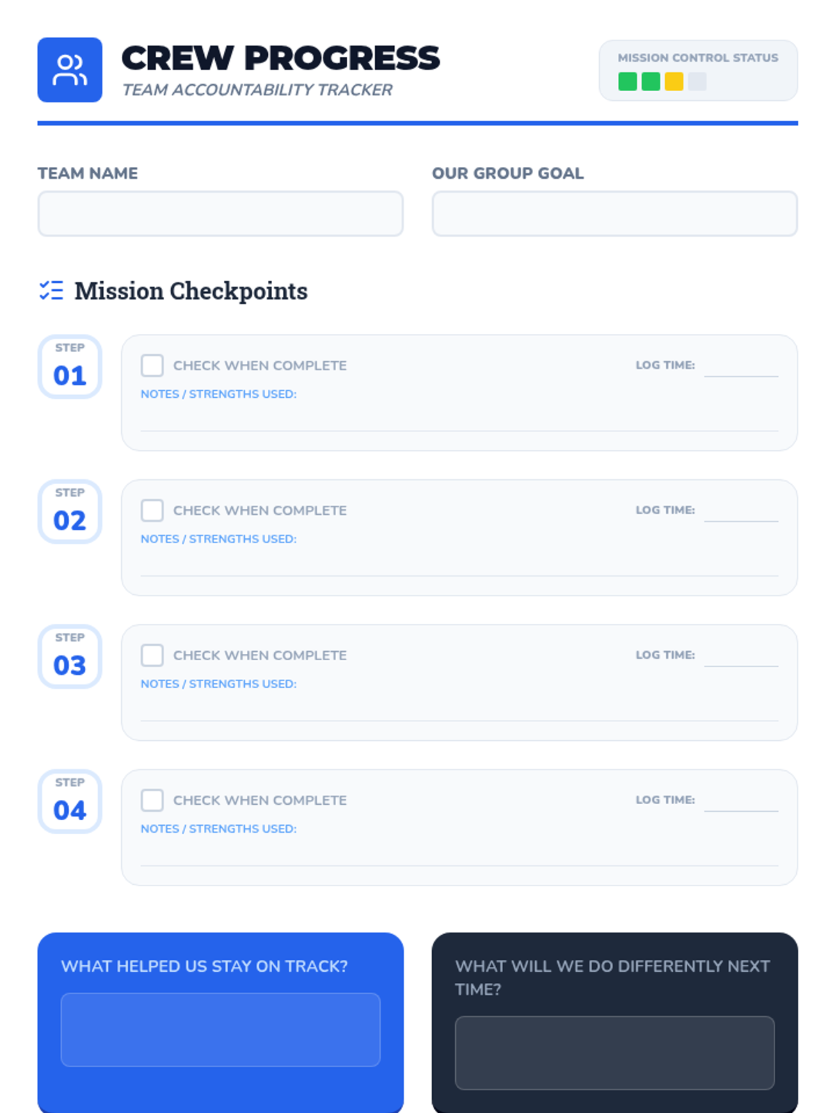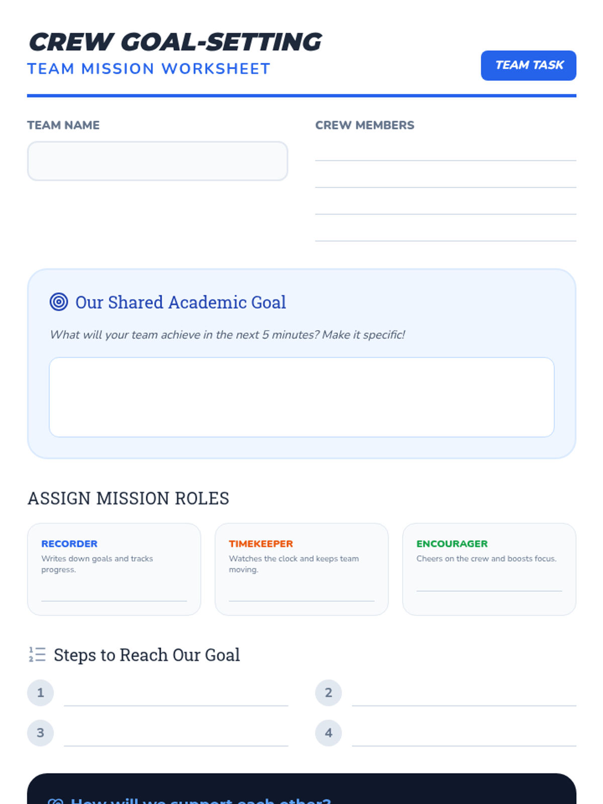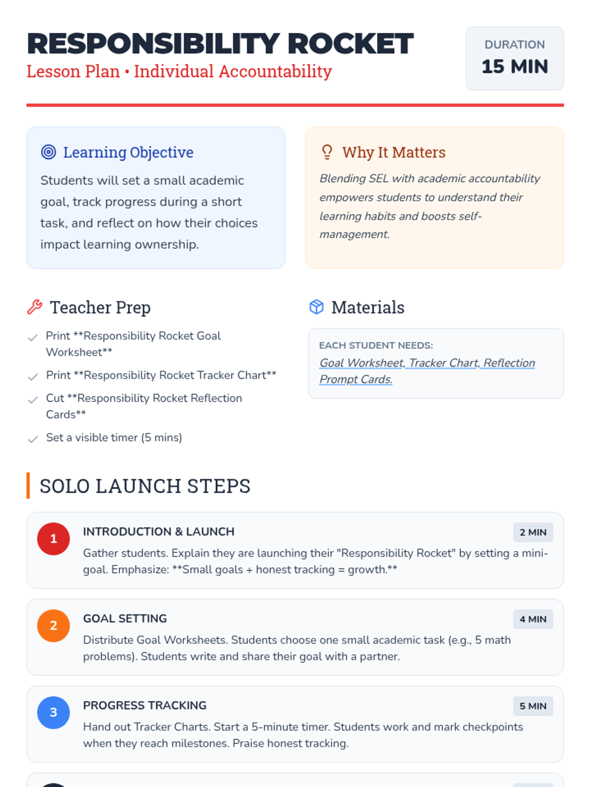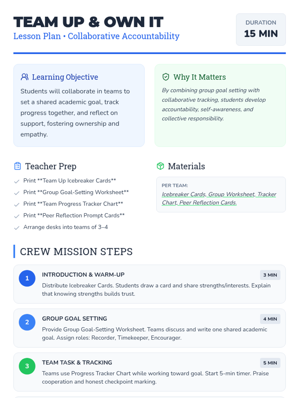 A 4th-grade social-emotional learning sequence that teaches academic accountability through the lens of teamwork and personal ownership. Students move from individual goal-setting to collaborative team missions.