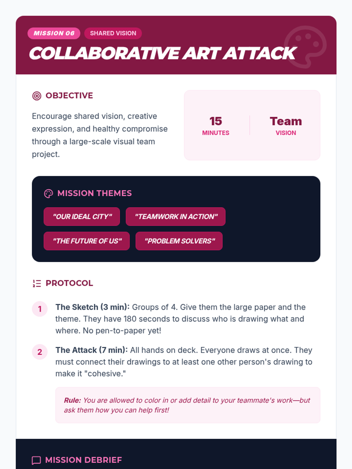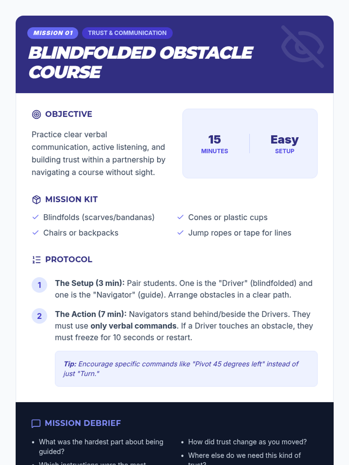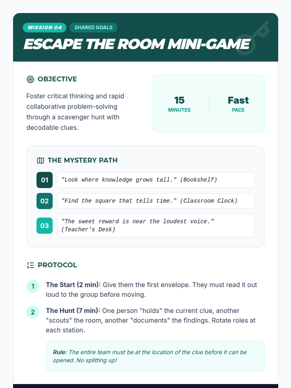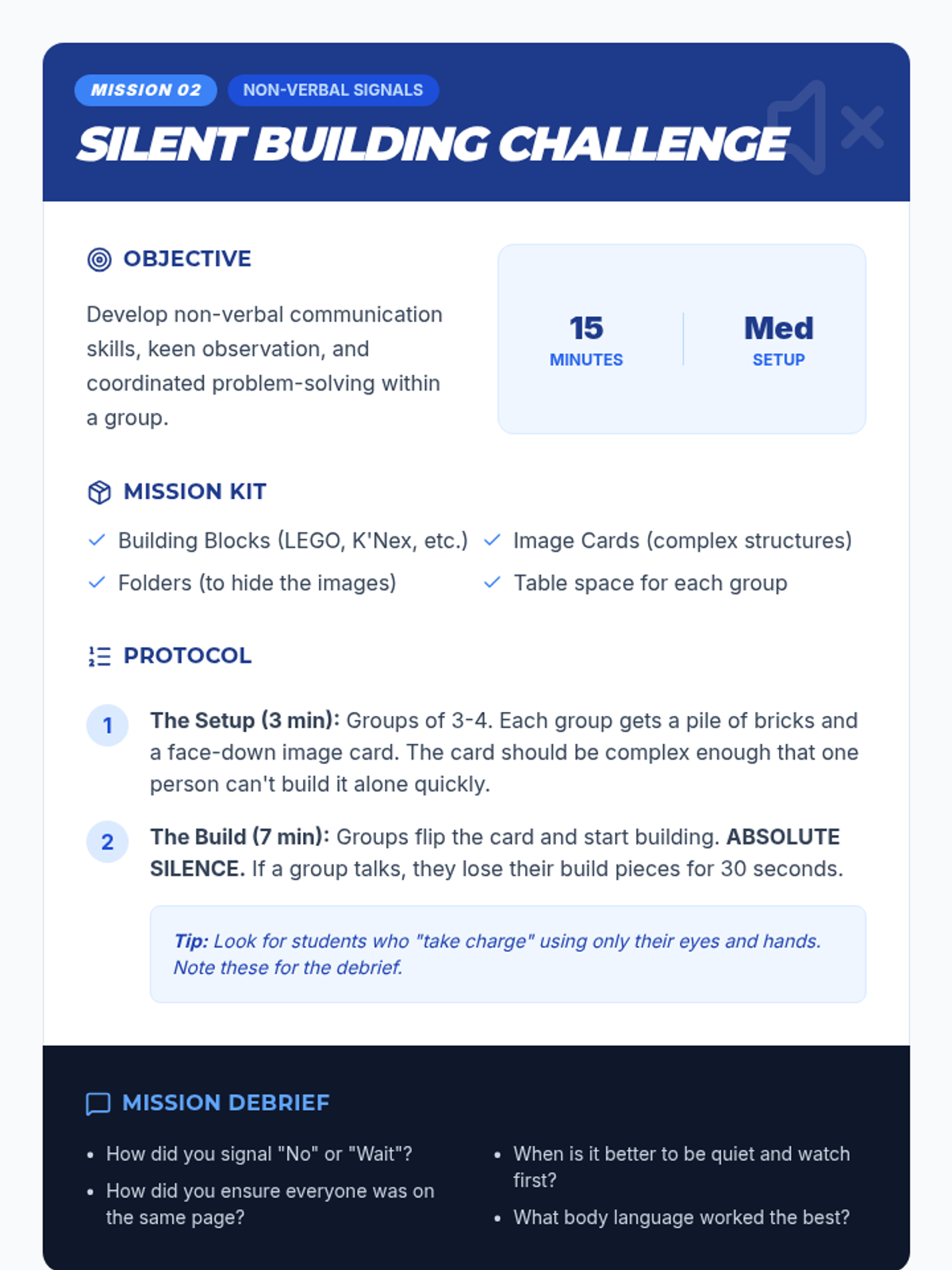A 6-session Tier 2 intervention sequence for 8th-grade boys focused on developing collaboration, communication, and problem-solving skills through fast-paced, interactive games.