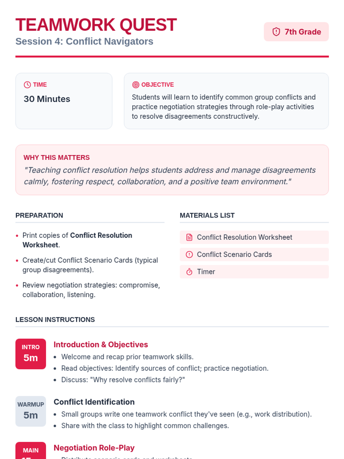 In this 6-session series, 7th graders explore and practice essential group learning social skills such as communication, cooperation, conflict resolution, and leadership to build a supportive classroom culture.