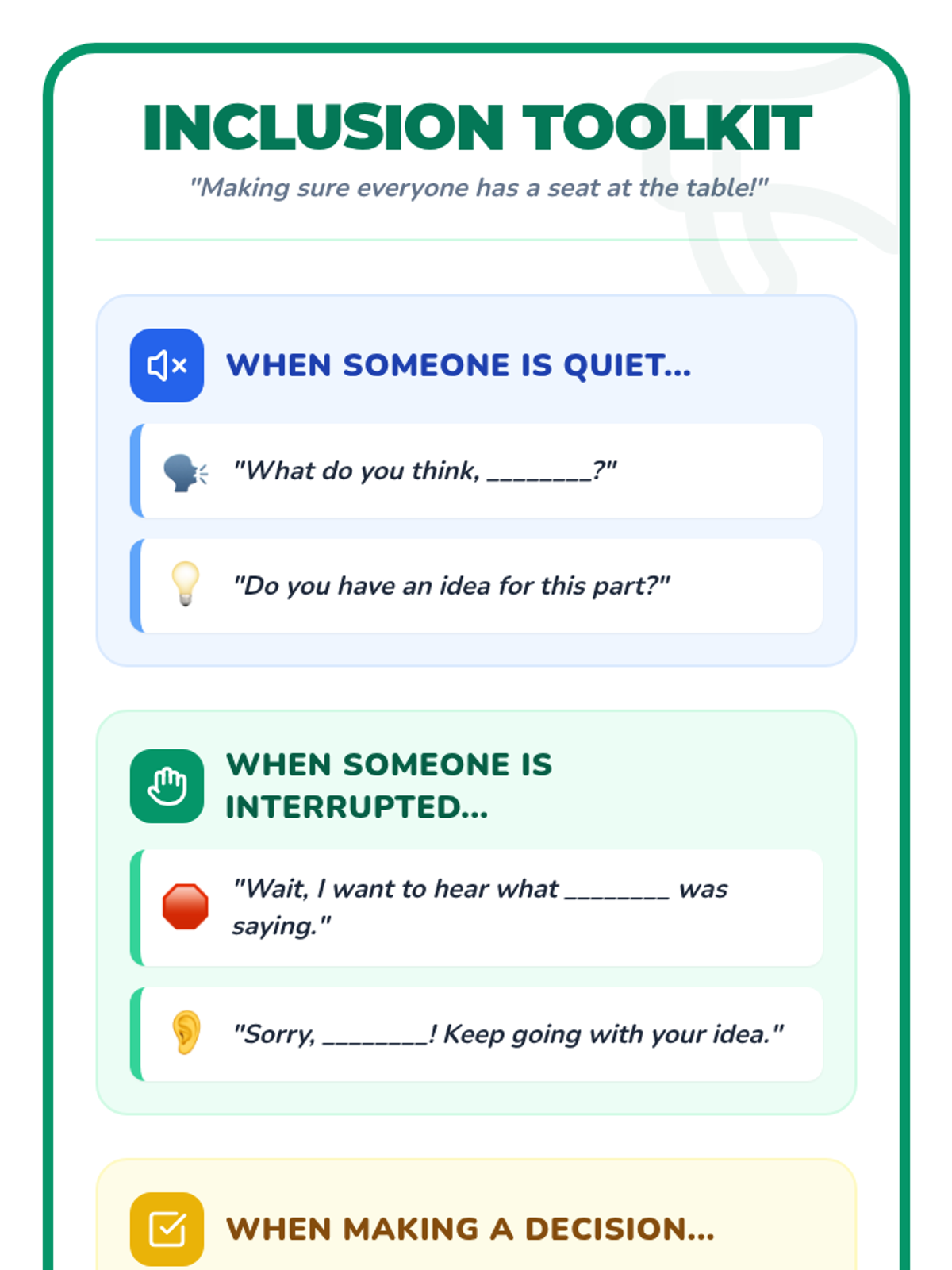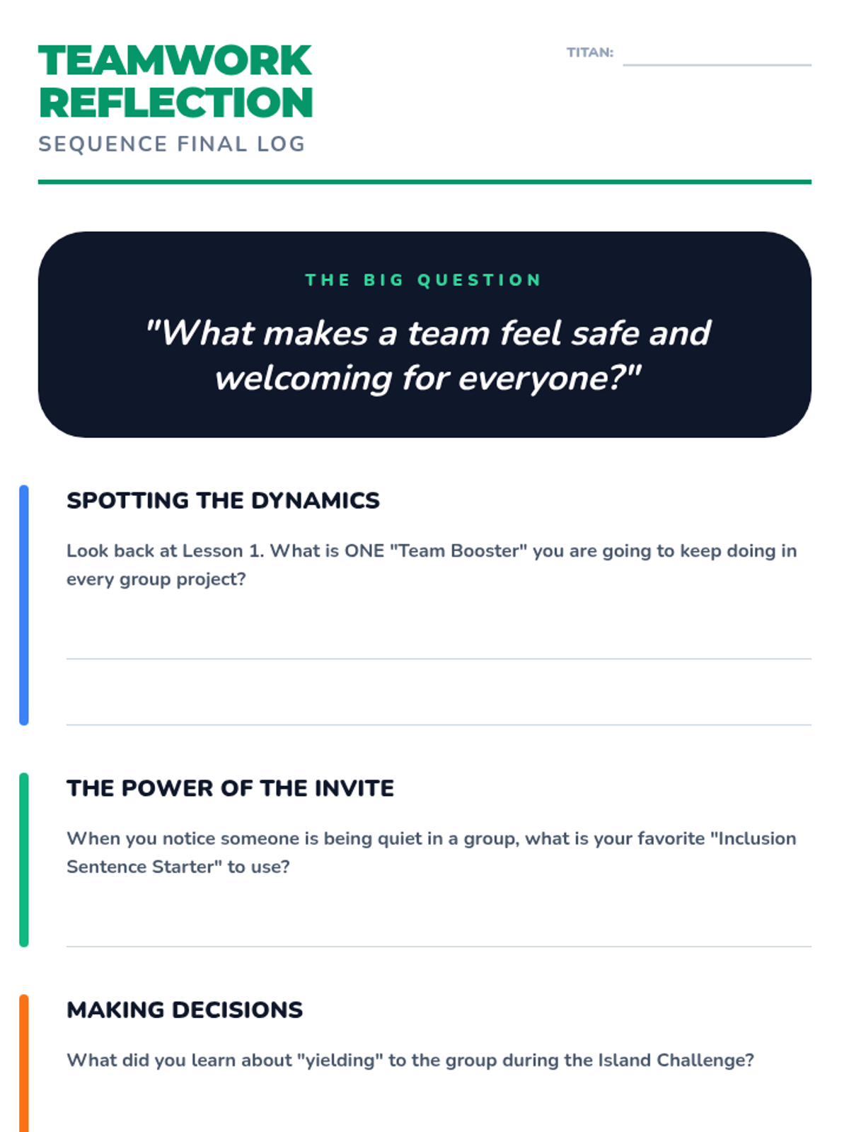 This sequence focuses on group dynamics, inclusion, and team morale for 3rd graders. Students explore how to make teams safe and welcoming through observation, simulation, and practical skill-building.