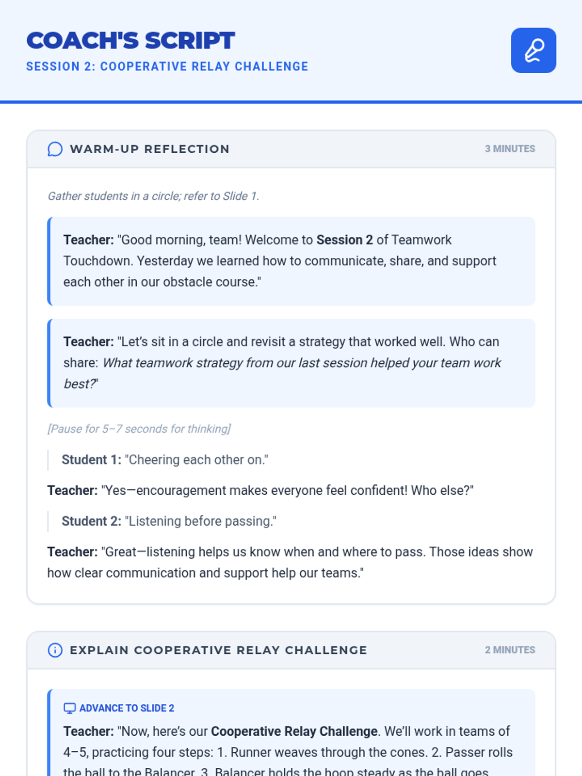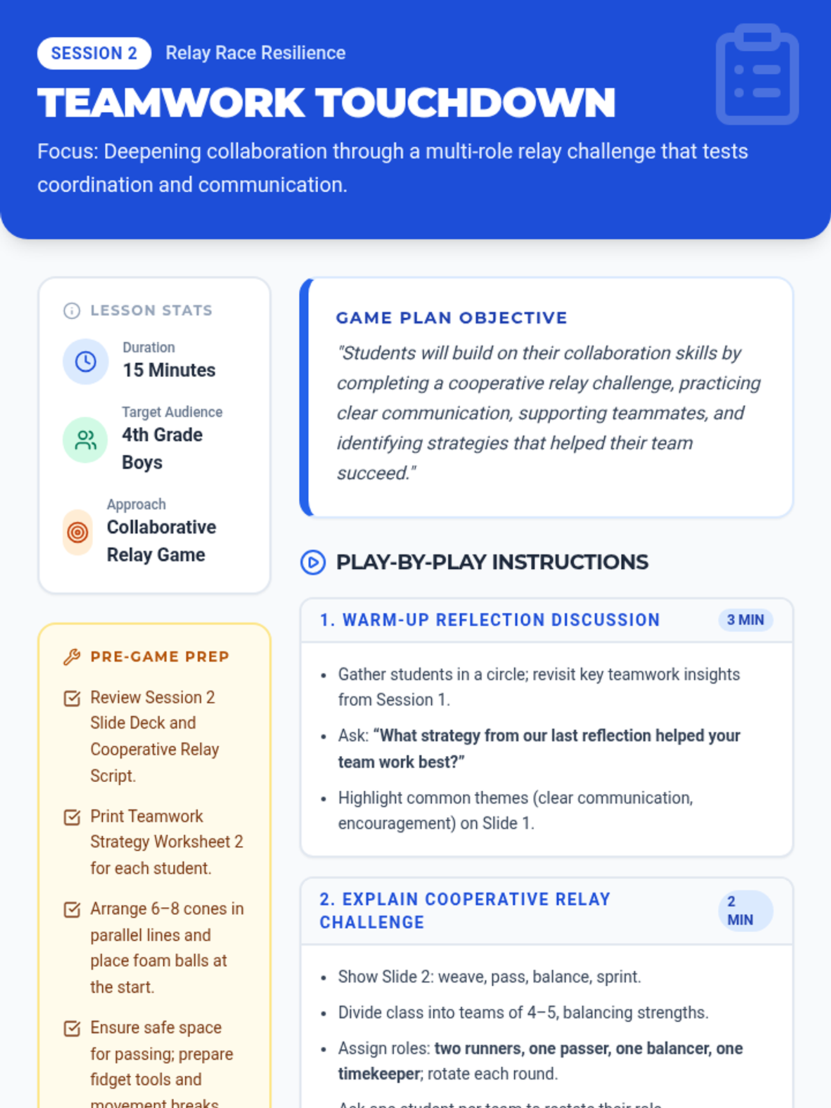 A two-session program for 4th-grade boys to develop collaboration and communication skills through high-energy, sports-based challenges and reflections.