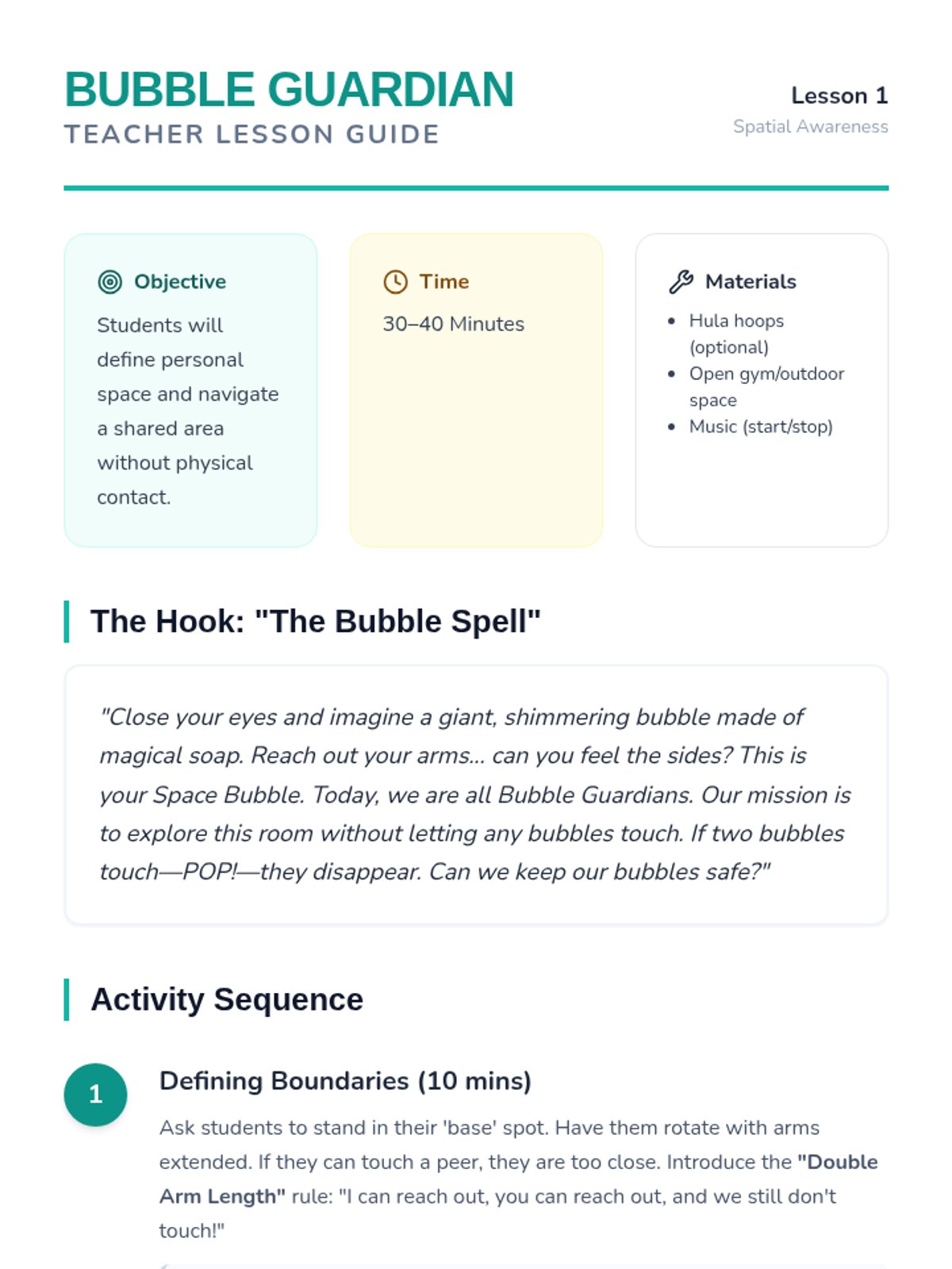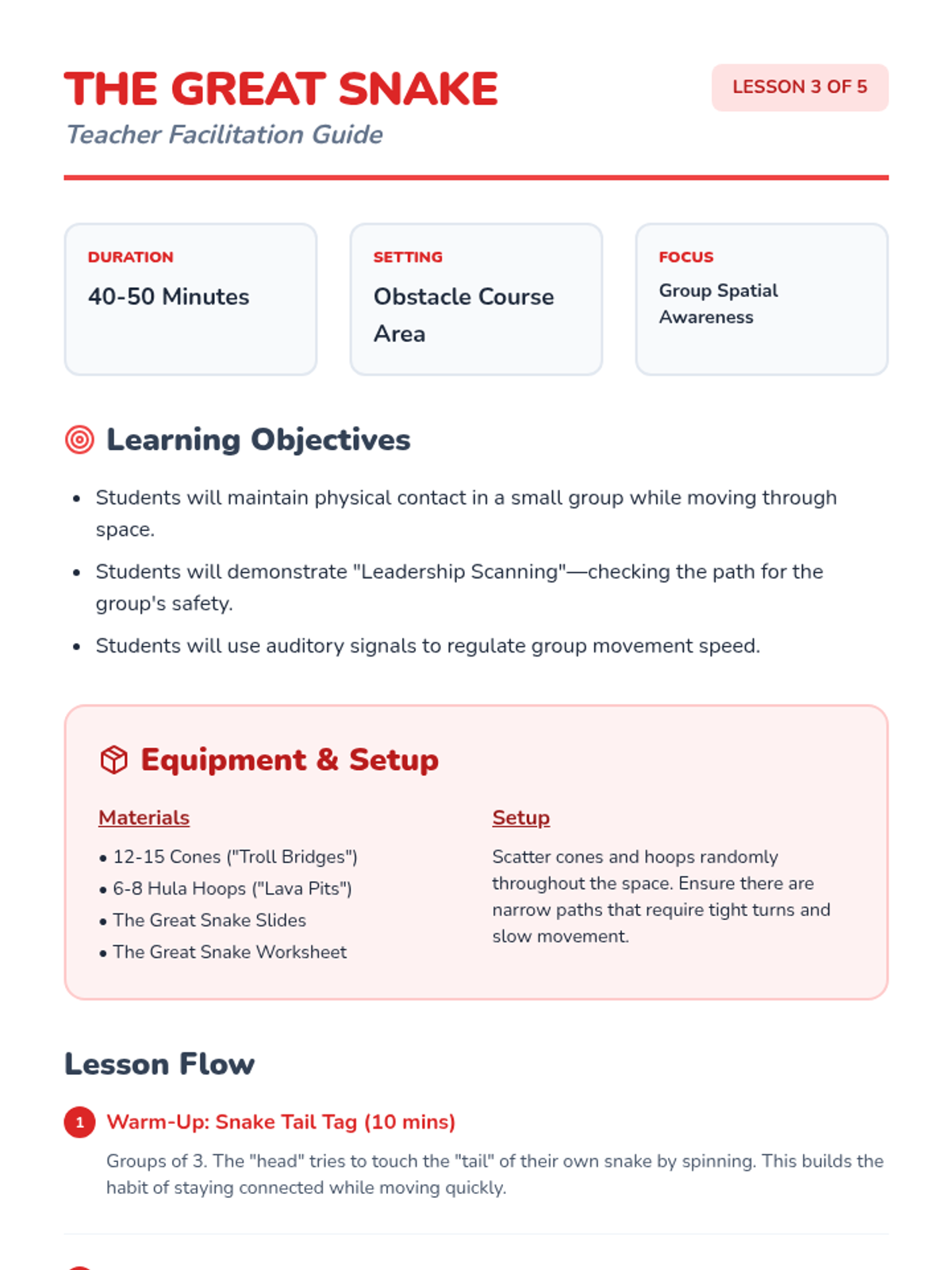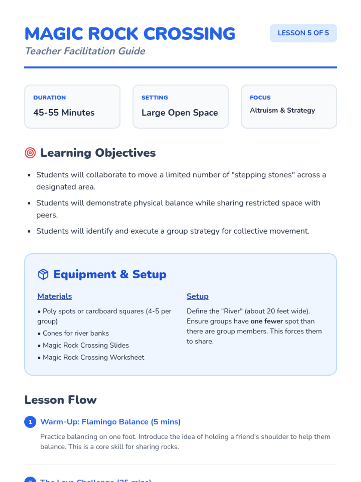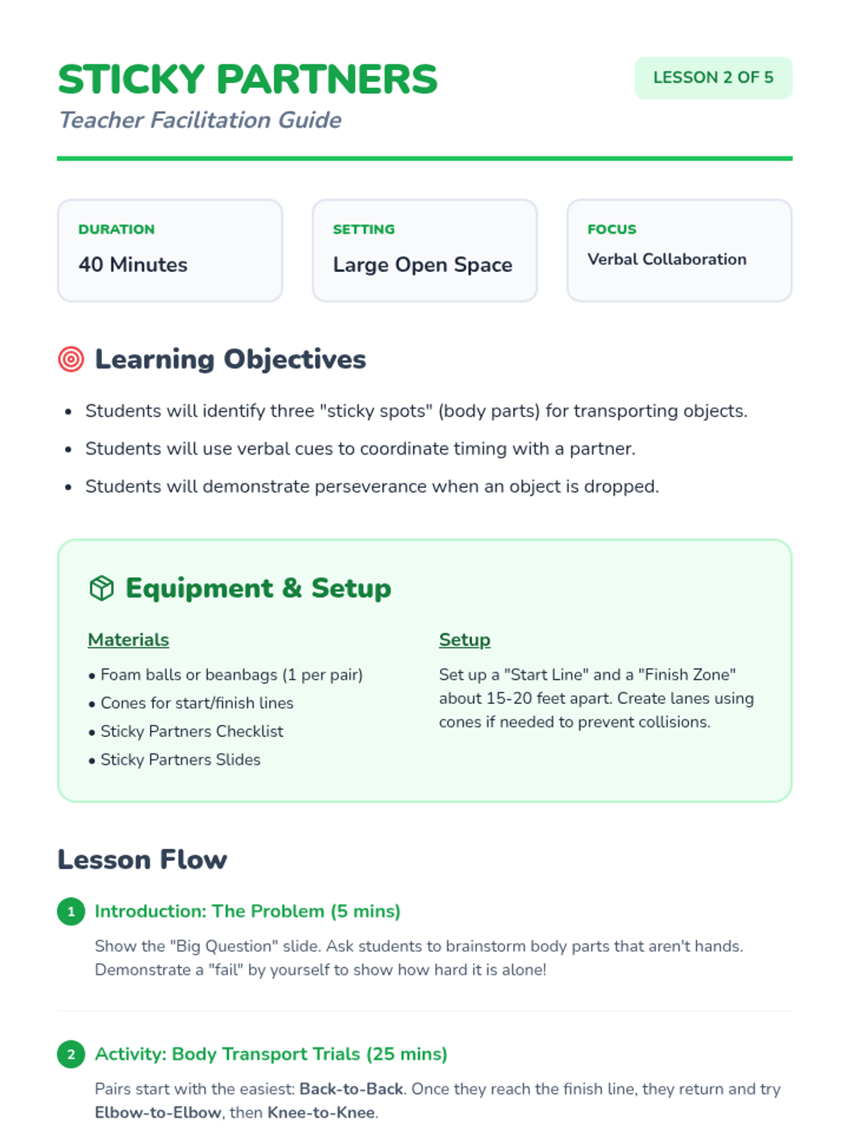 A sequence focused on cooperative physical education for Kindergarten, moving from individual mirroring to complex group problem-solving. Students develop communication, trust, and shared spatial awareness through a series of increasingly difficult physical challenges.