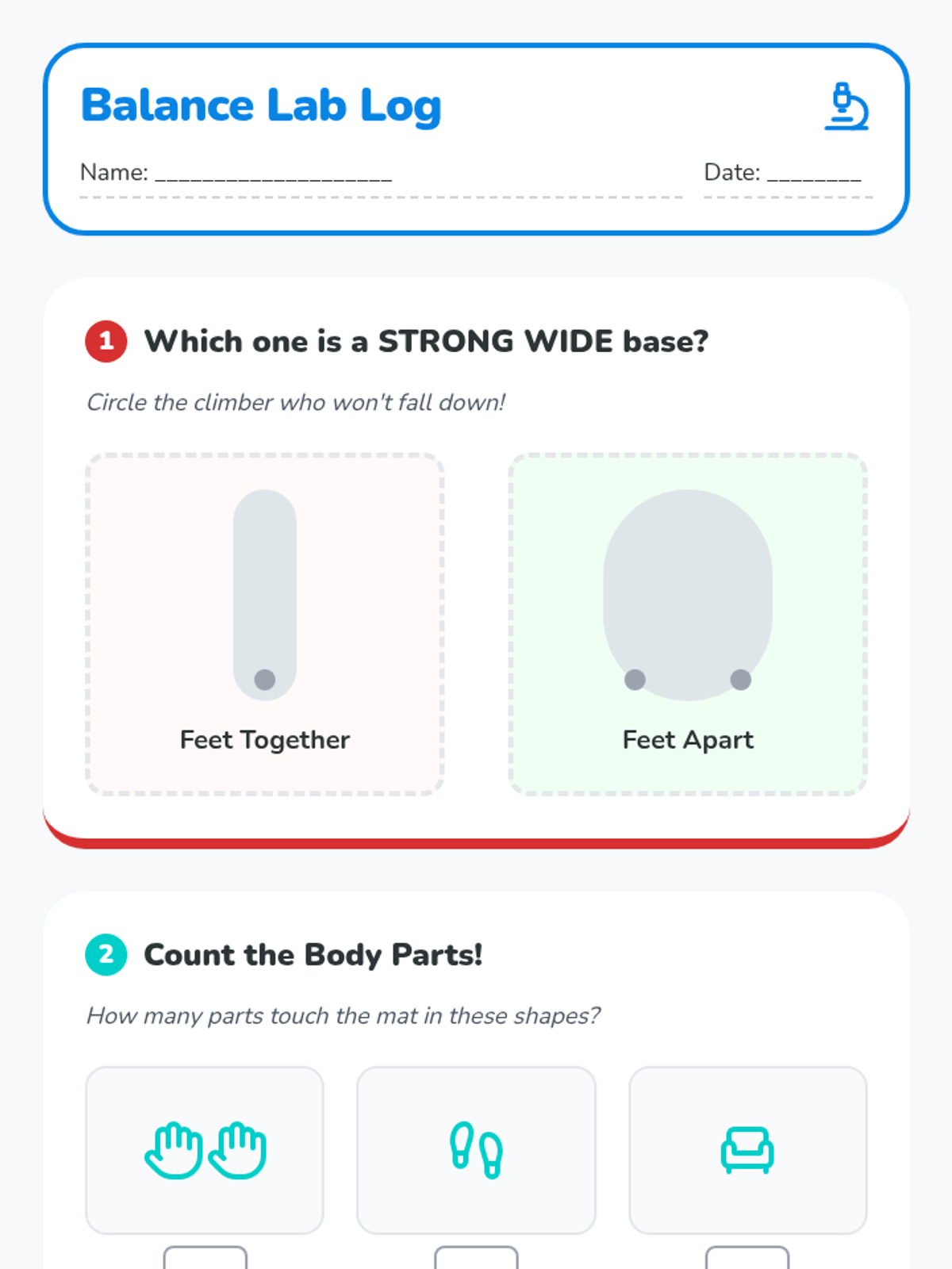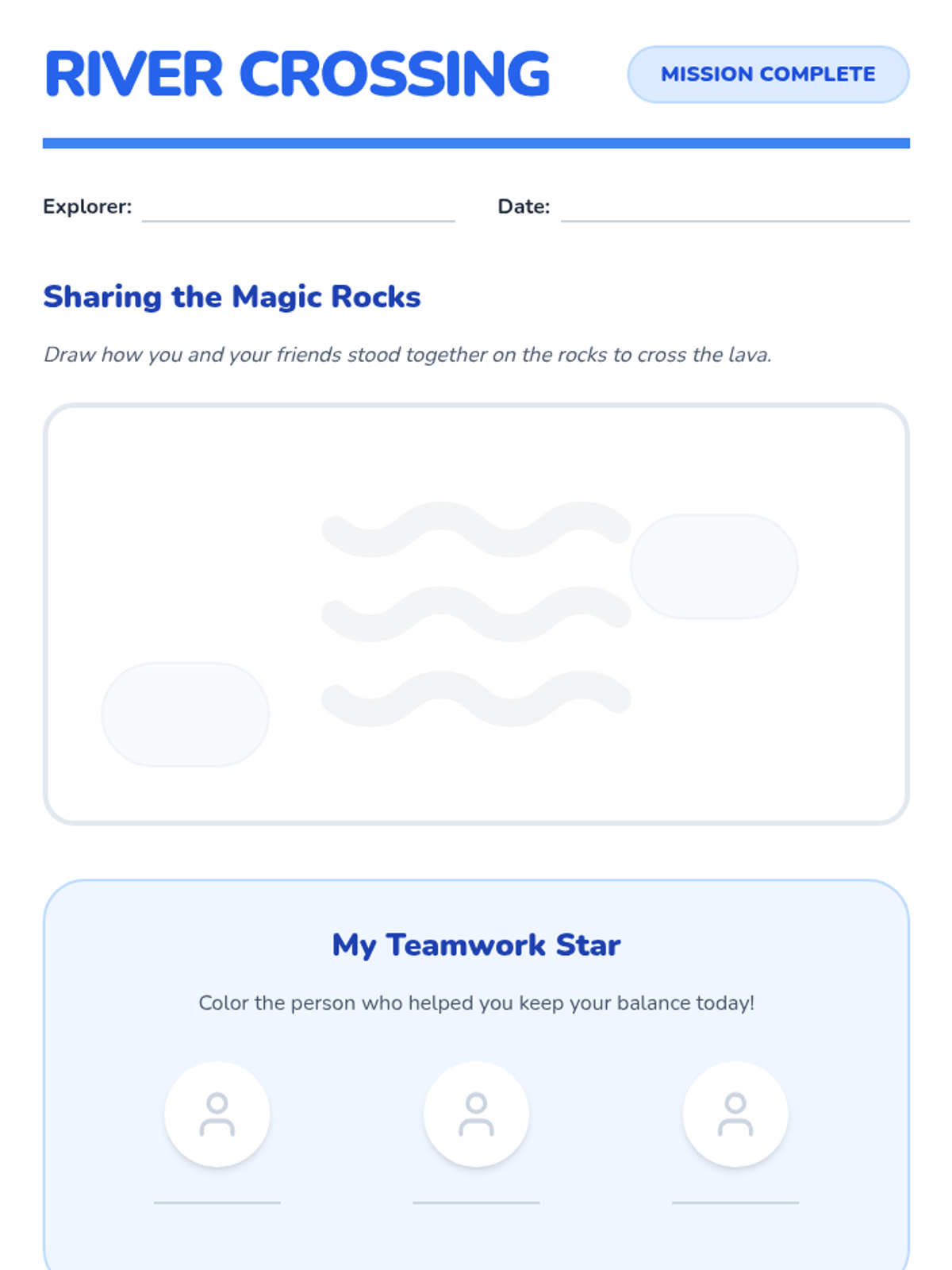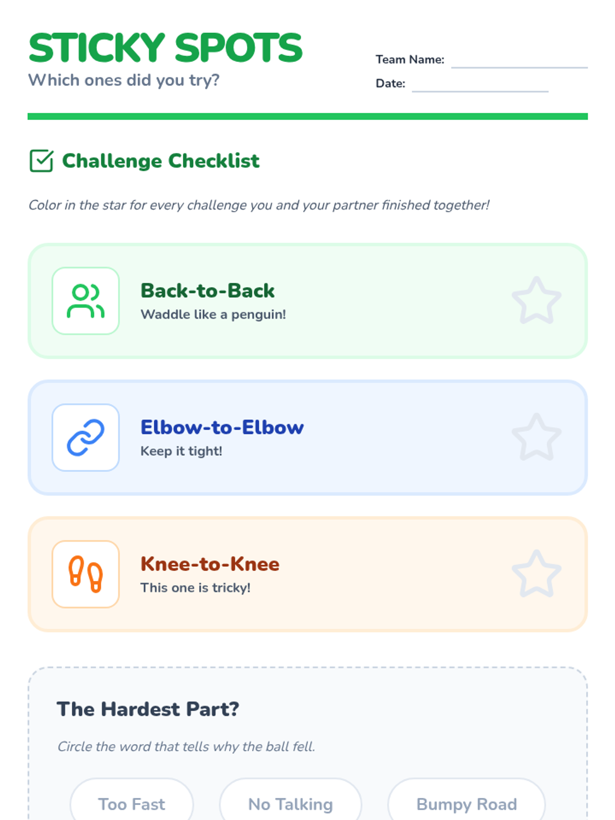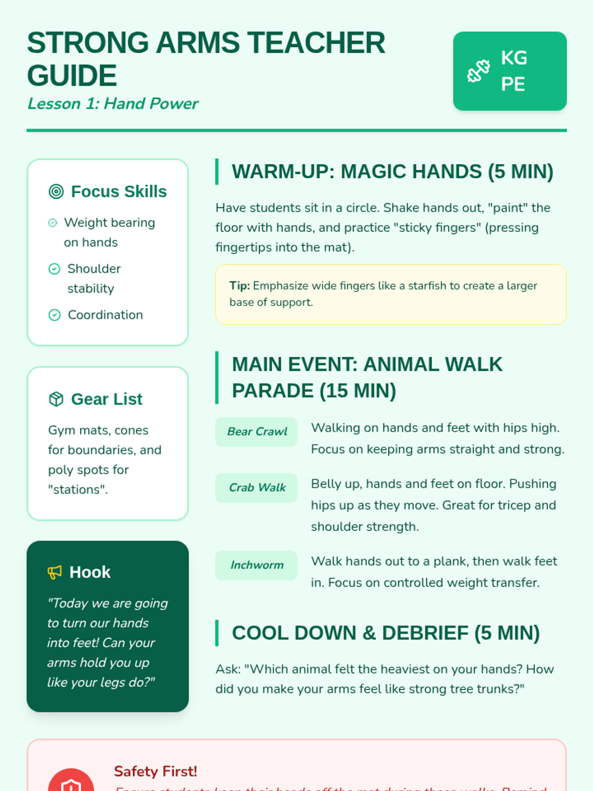 A sequence focused on cooperative physical education for Kindergarten, moving from individual mirroring to complex group problem-solving. Students develop communication, trust, and shared spatial awareness through a series of increasingly difficult physical challenges.