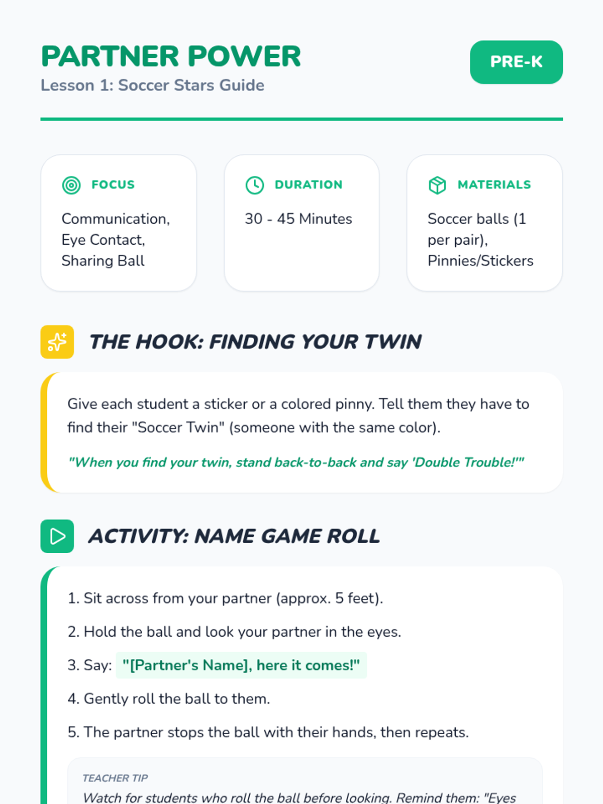 A Pre-K physical education sequence focused on soccer passing and teamwork. Students learn to communicate with partners, master the push-pass technique, and develop tactical awareness through cooperative games.