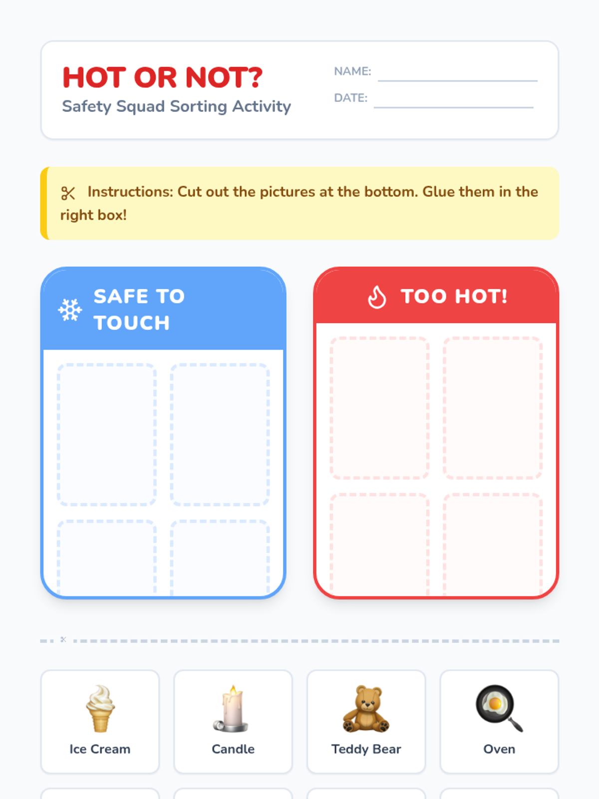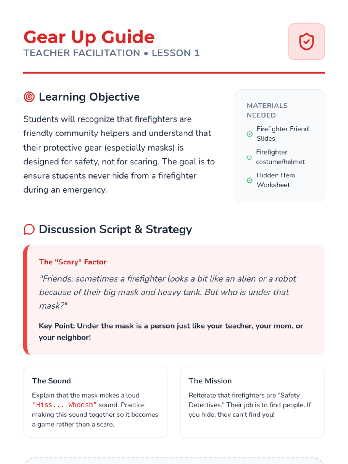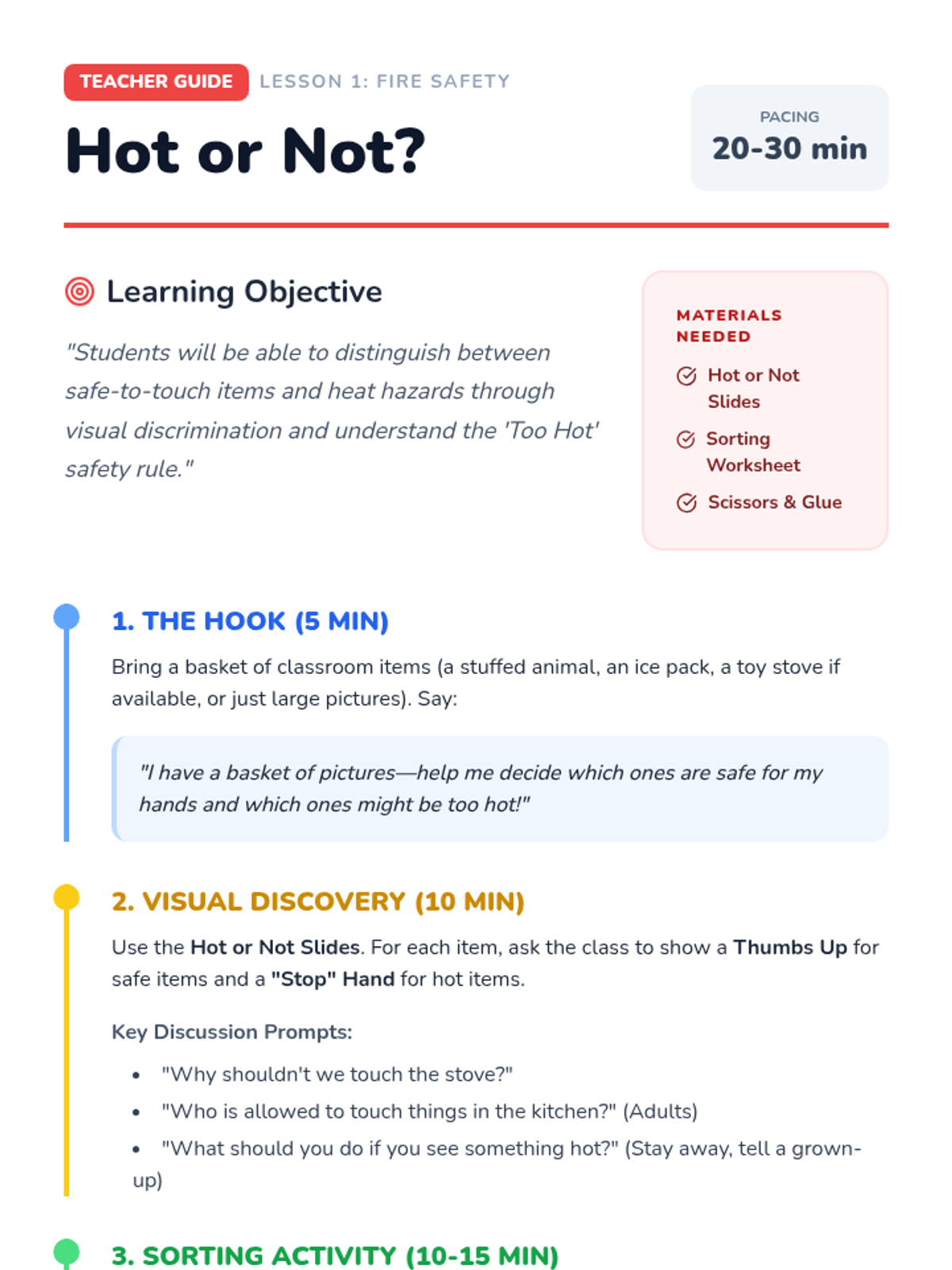 A comprehensive fire safety sequence for Pre-K students focused on hazard recognition, distinguishing tools from toys, and identifying emergency exits. Students learn through visual discrimination, role-play, and mapping to build confidence in emergency situations.