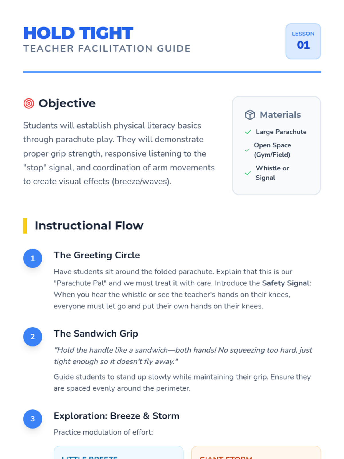 A Pre-K sequence focused on parachute play to teach synchronized movement, cooperation, and basic motor skills through group-based physical activities.