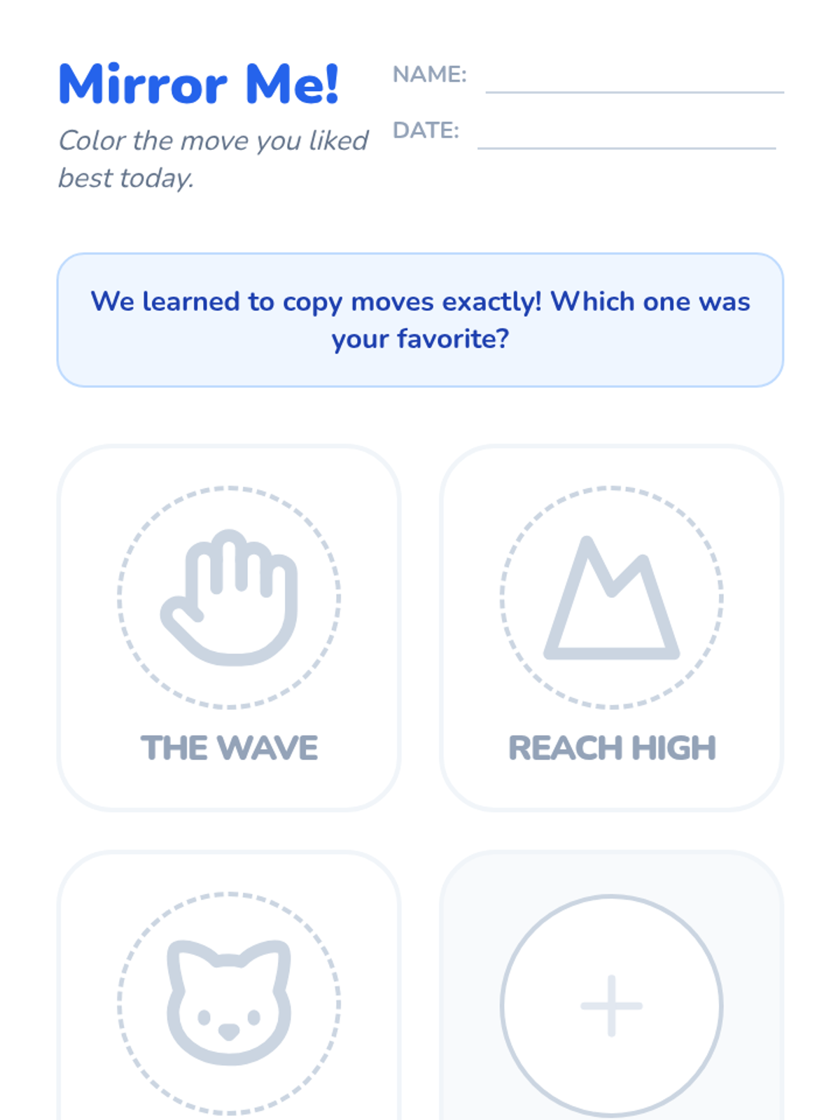 A foundational dance sequence for Pre-K students exploring movement patterns, sequencing, and repetition to build choreography skills. Students move from mirroring simple actions to creating and looping three-step sequences.