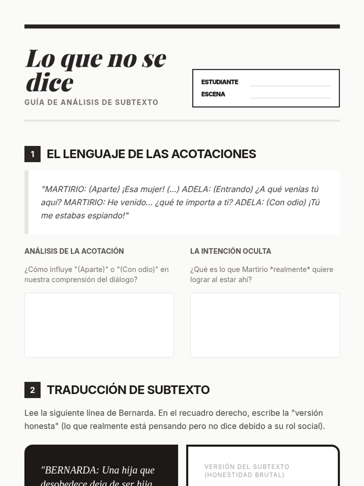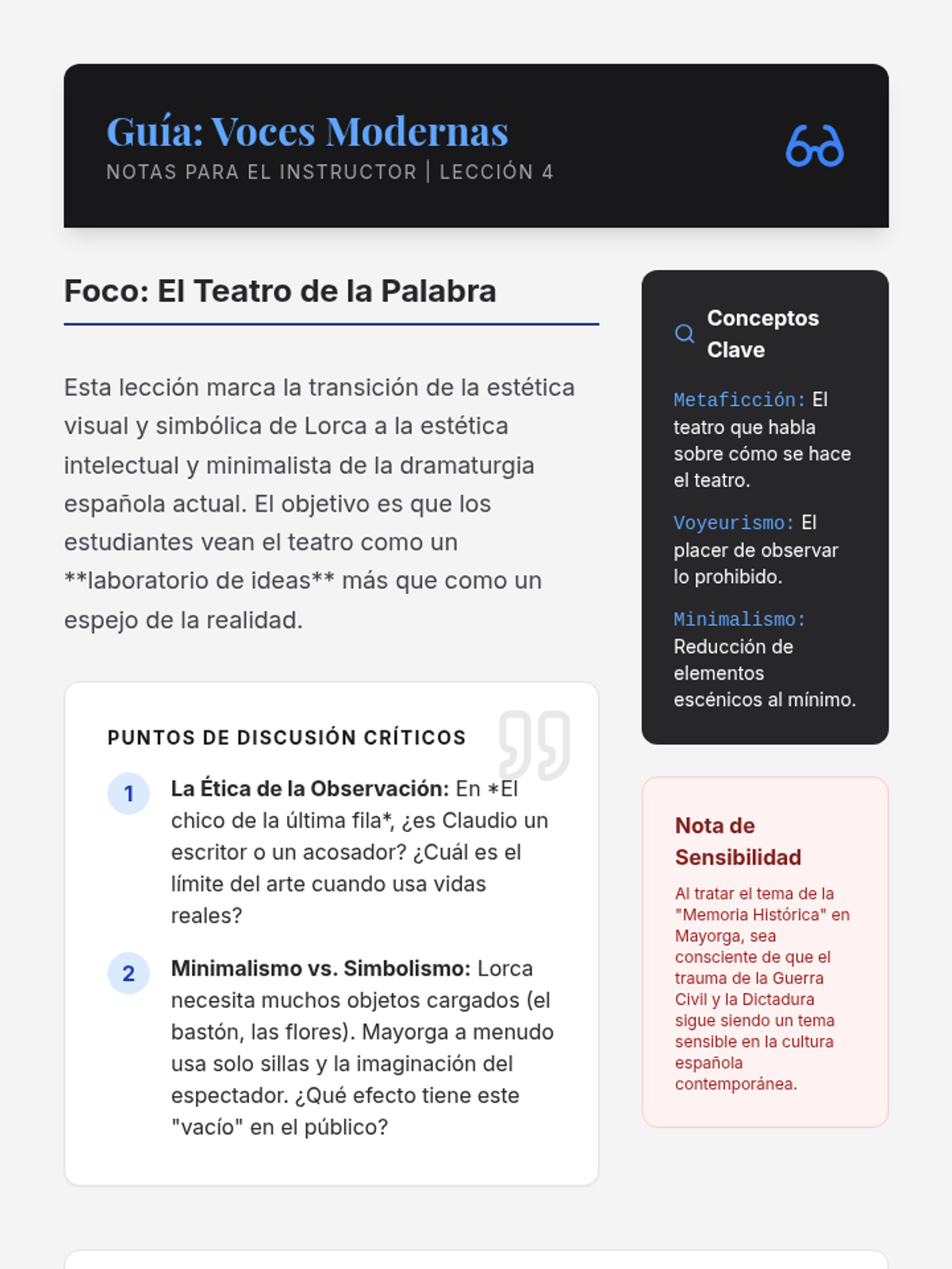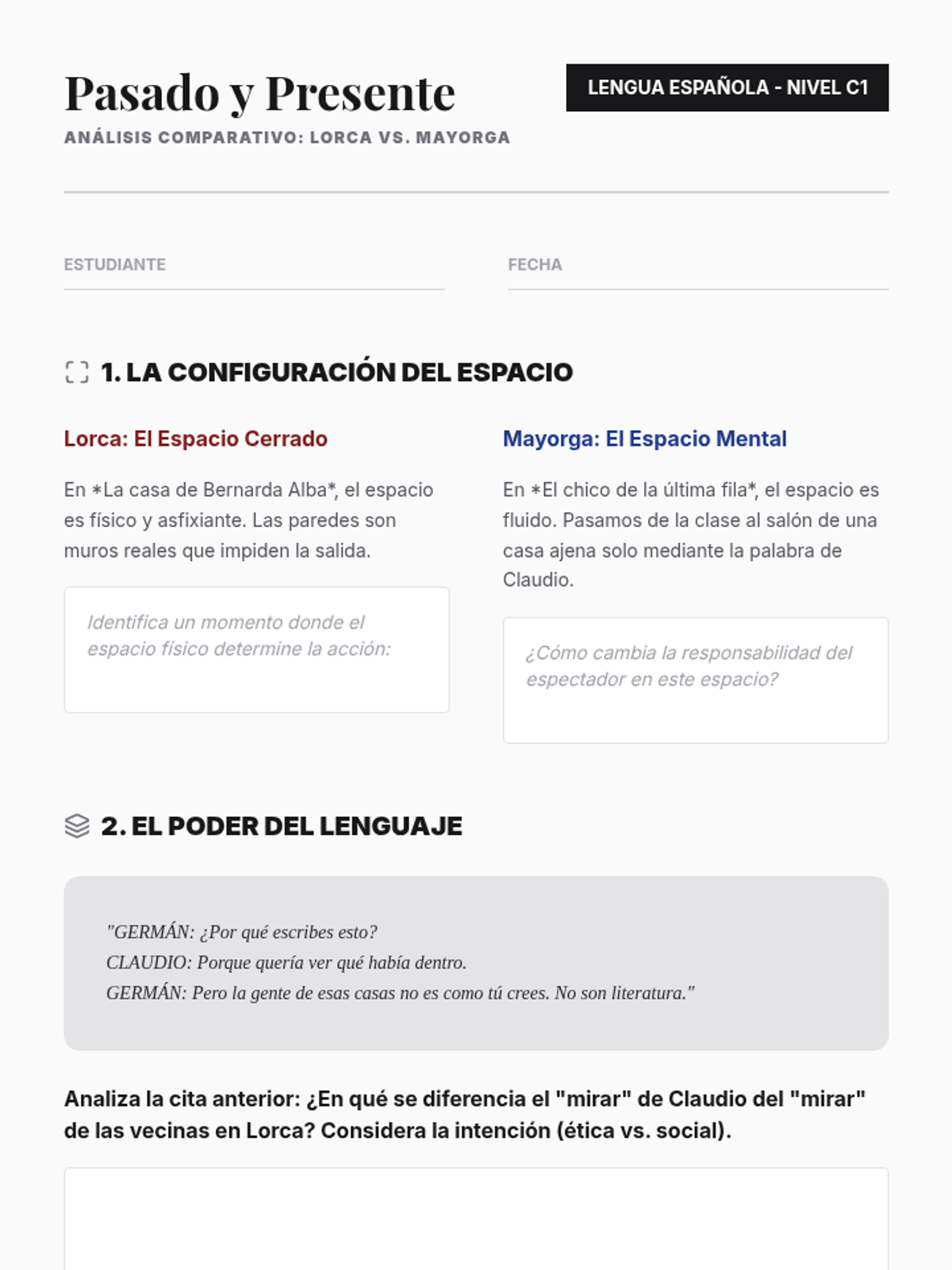 An advanced Spanish reading sequence exploring dramatic texts from Federico García Lorca to modern playwrights, focusing on symbolism, subtext, and the sociopolitical critique of Spanish society. Students analyze the transition from classical tragedy to contemporary drama through the lens of performance and directorial interpretation.