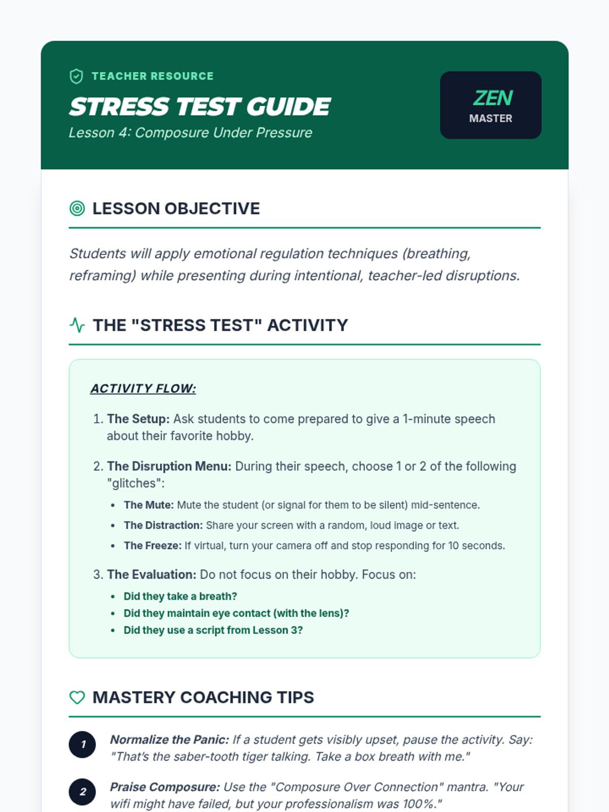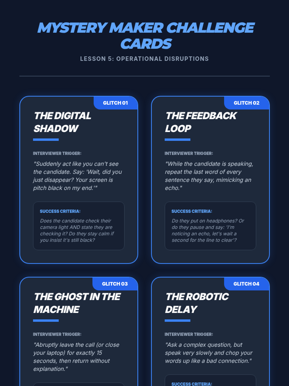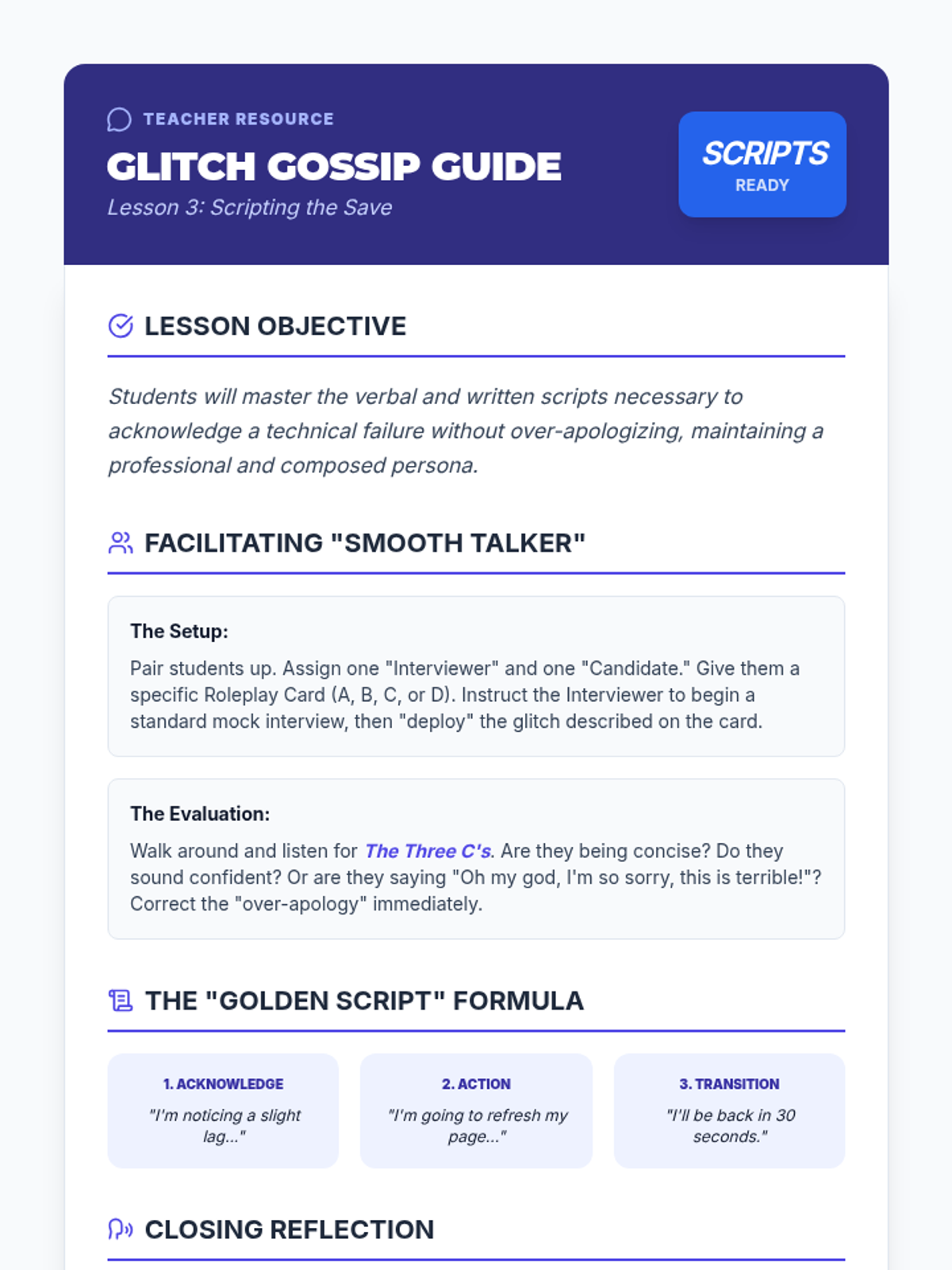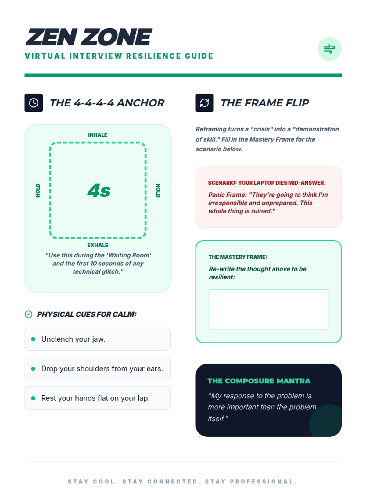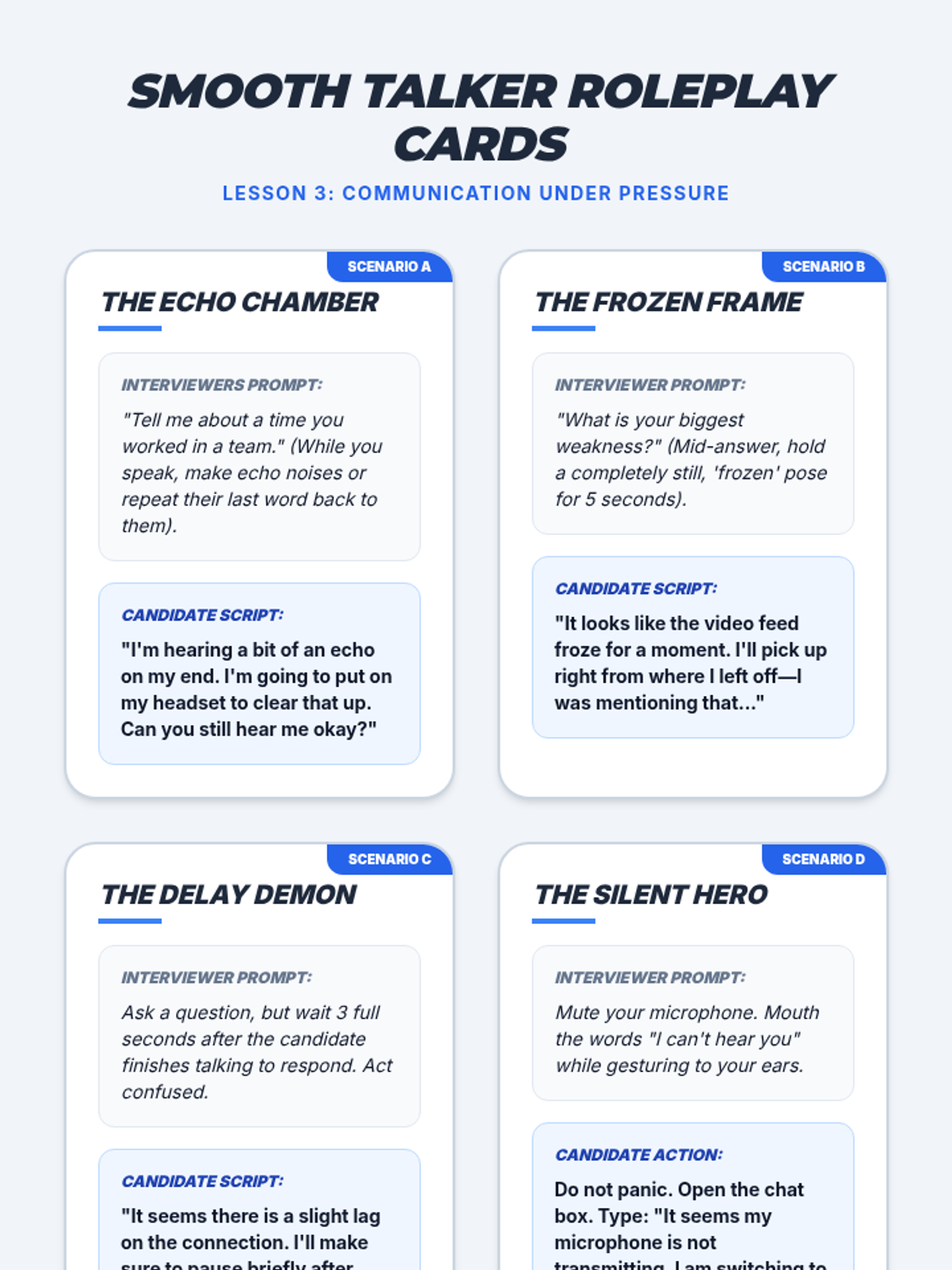 A comprehensive sequence designed to equip 8th-grade students with the resilience and technical skills needed to navigate virtual interview failures. Students progress from identifying common tech issues to developing backup protocols, mastering professional crisis communication, and maintaining emotional composure under pressure.