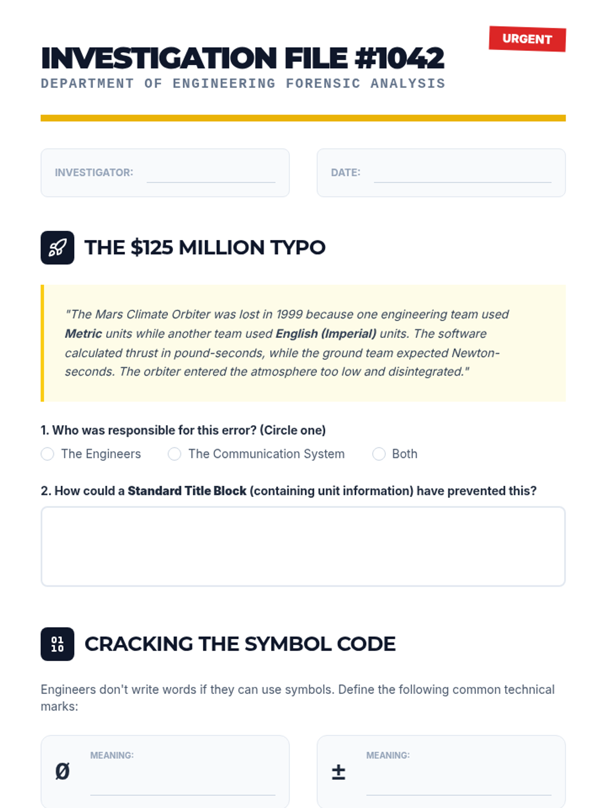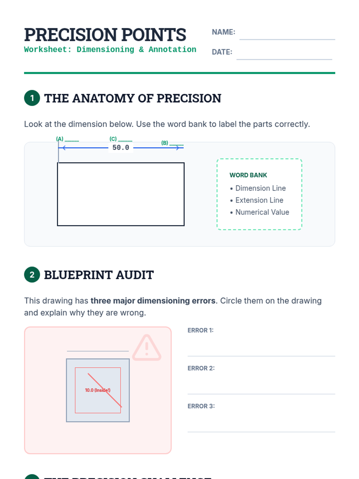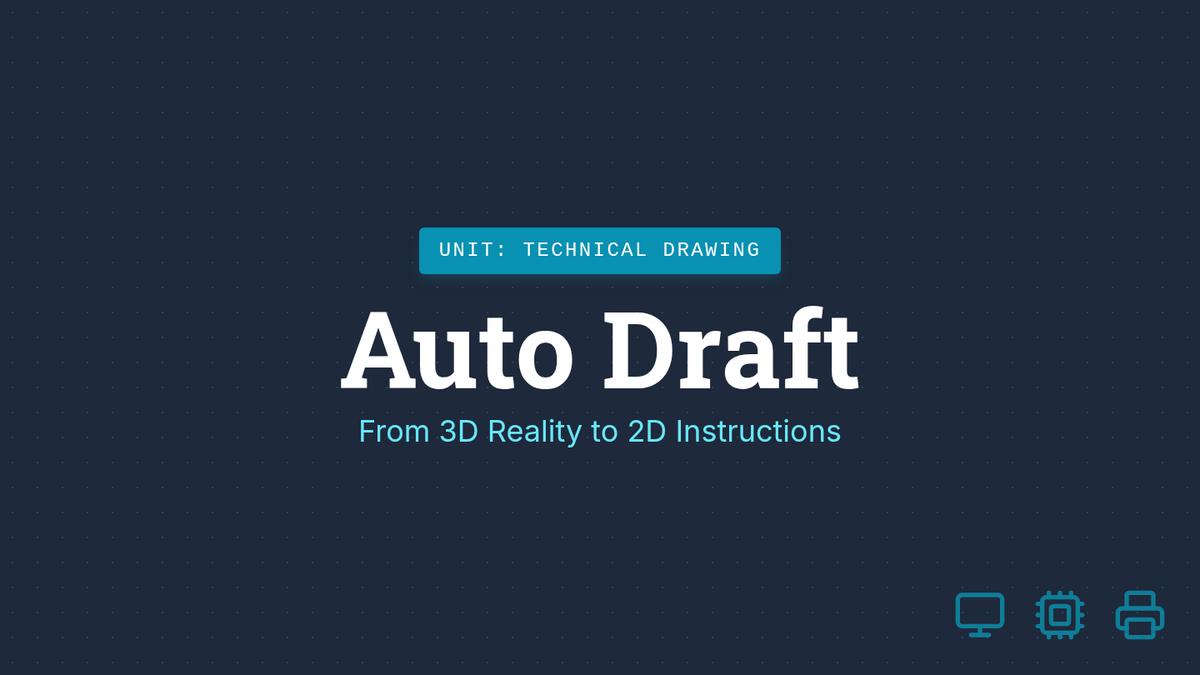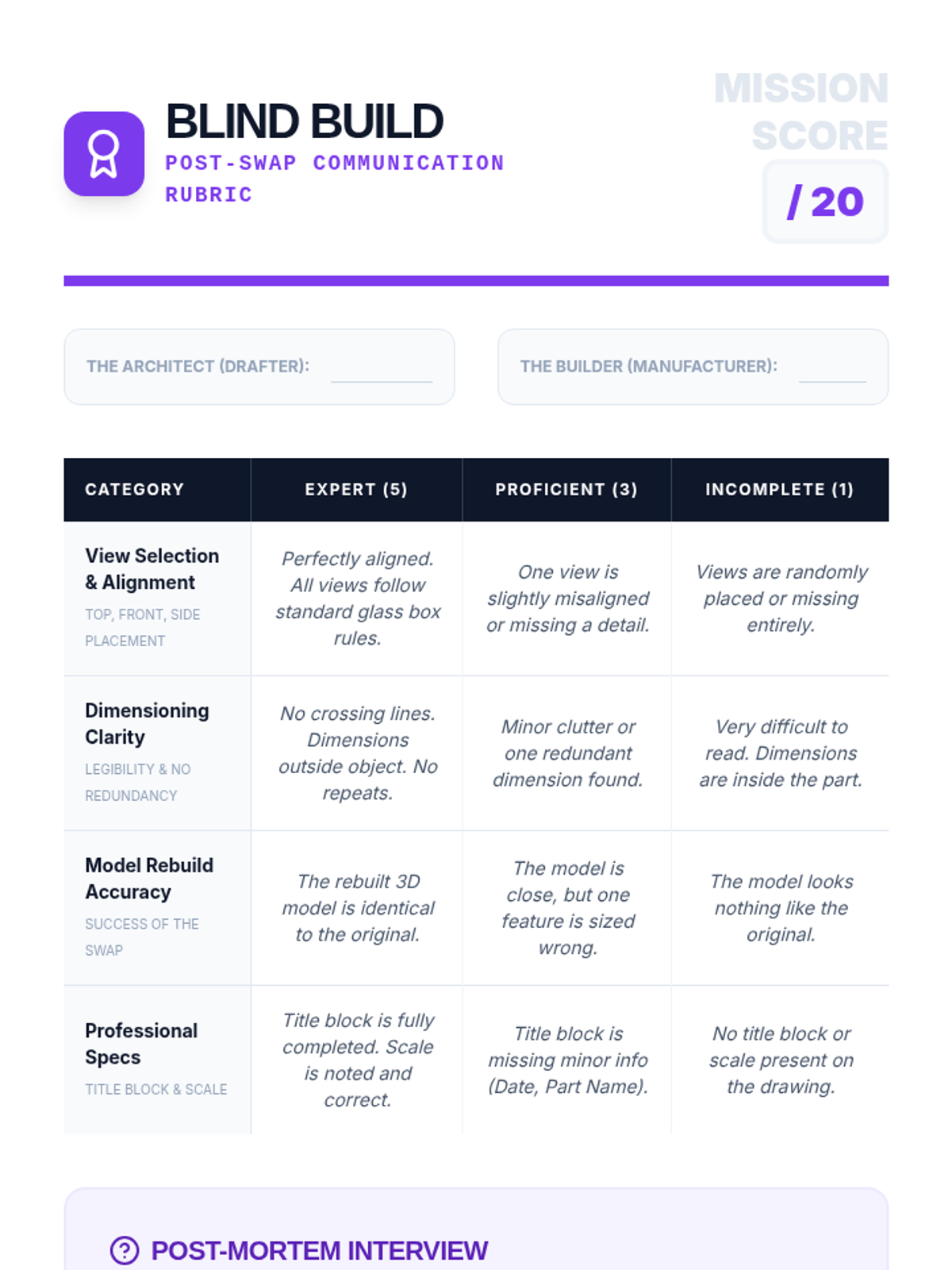 This sequence bridges the gap between 3D modeling and standardized technical communication. Students move from understanding orthographic projection to creating dimensioned blueprints that adhere to industry standards, concluding with a collaborative modeling challenge.