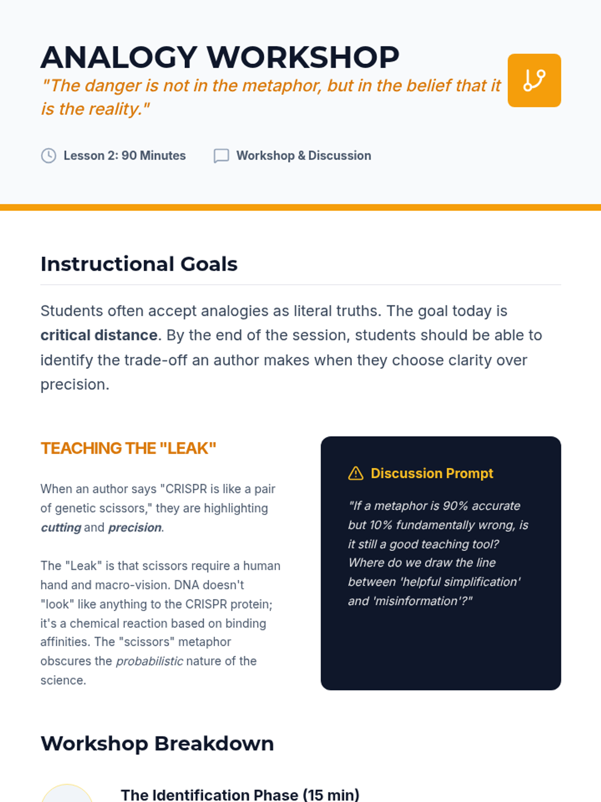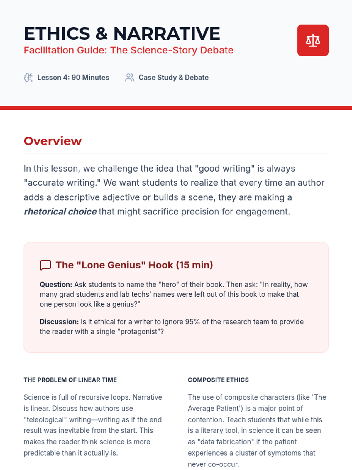 This sequence guides undergraduate students through the critical analysis of popular science nonfiction. It focuses on the translation of technical knowledge for public consumption, exploring audience scaffolding, metaphor usage, visual rhetoric, and the ethics of narrative in science writing.