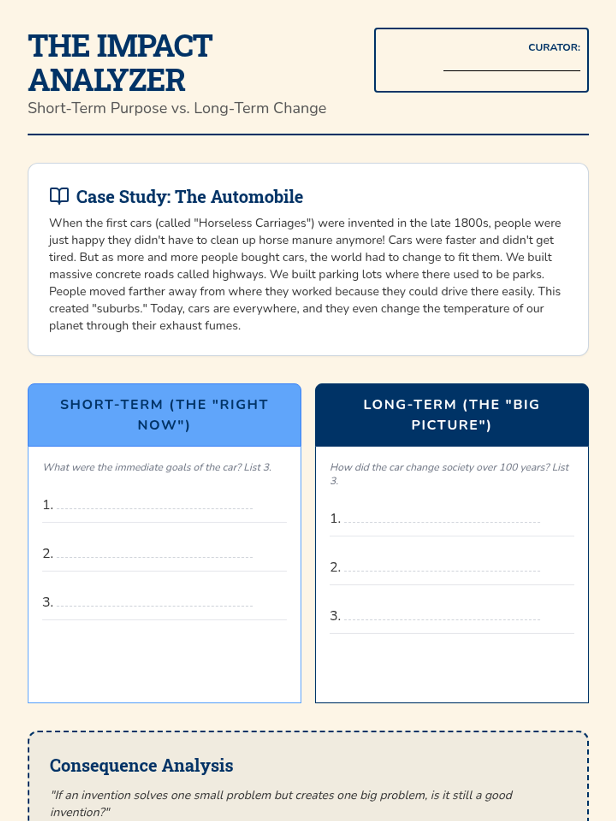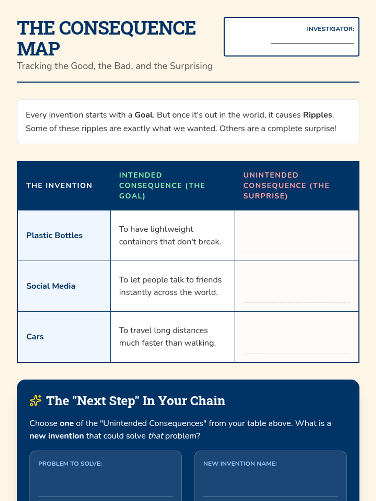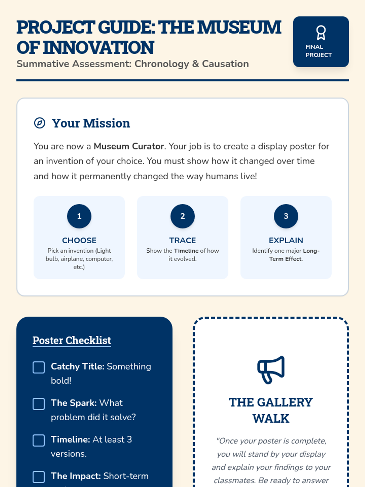 A 3rd-grade project-based sequence exploring chronology and causation through the lens of technological innovation. Students learn how inventions solve immediate problems but create long-term societal shifts and unintended consequences.