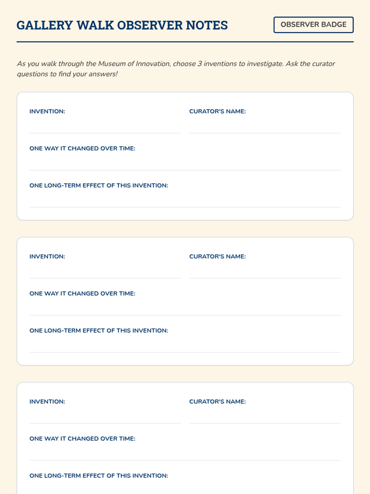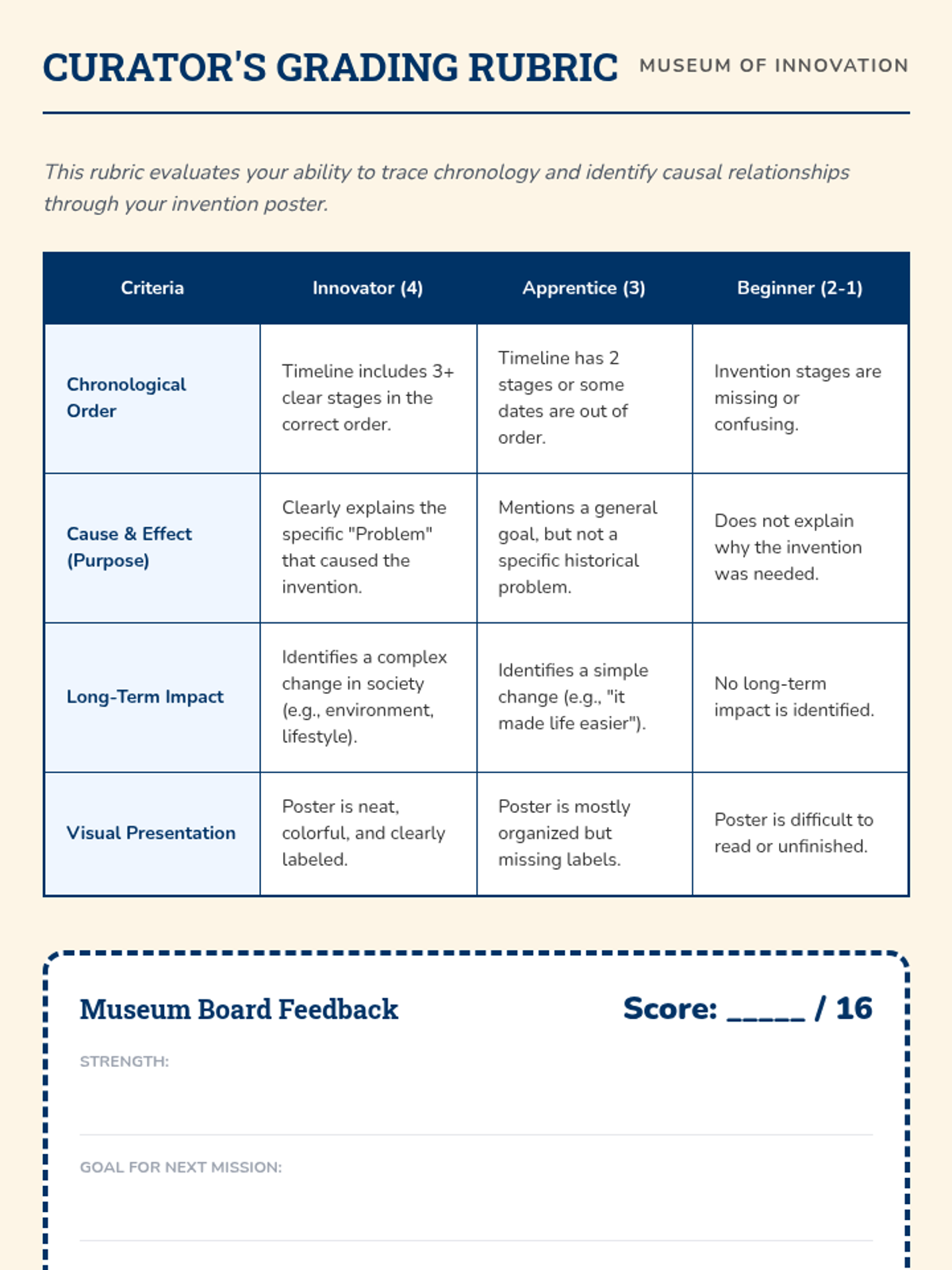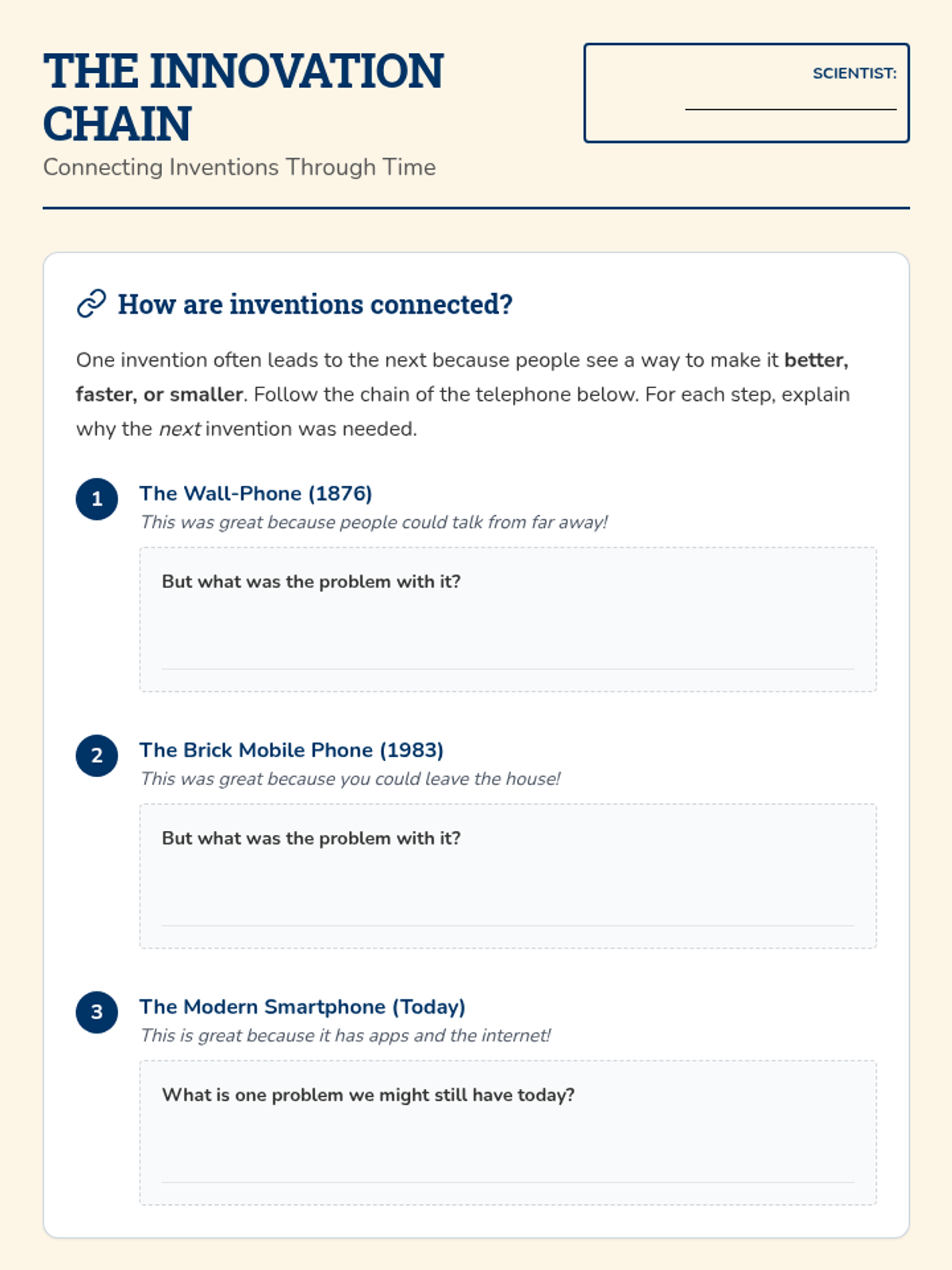A 3rd-grade project-based sequence exploring chronology and causation through the lens of technological innovation. Students learn how inventions solve immediate problems but create long-term societal shifts and unintended consequences.
