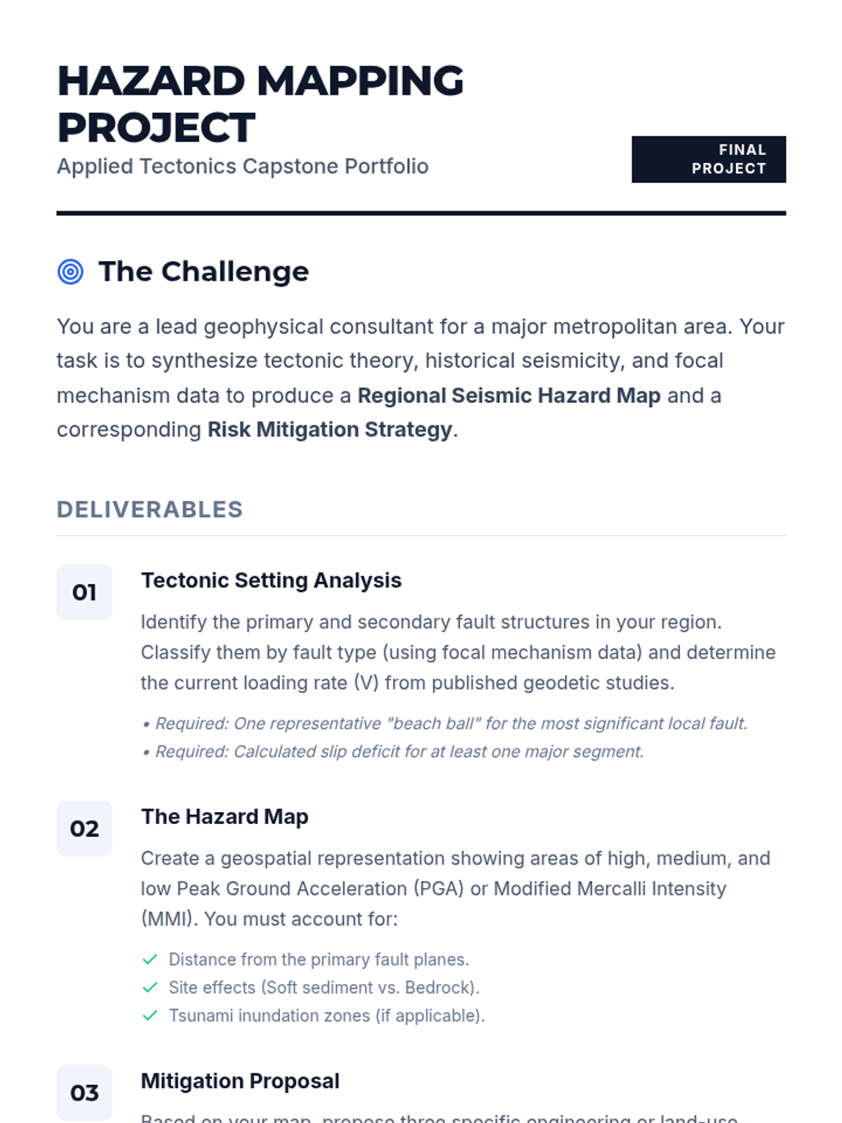 This undergraduate-level sequence explores the intersection of tectonic theory and seismic hazard assessment. Students analyze elastic rebound, interpret focal mechanisms, and evaluate the specific risks associated with subduction zones and intraplate settings, culminating in a comprehensive hazard mapping project.