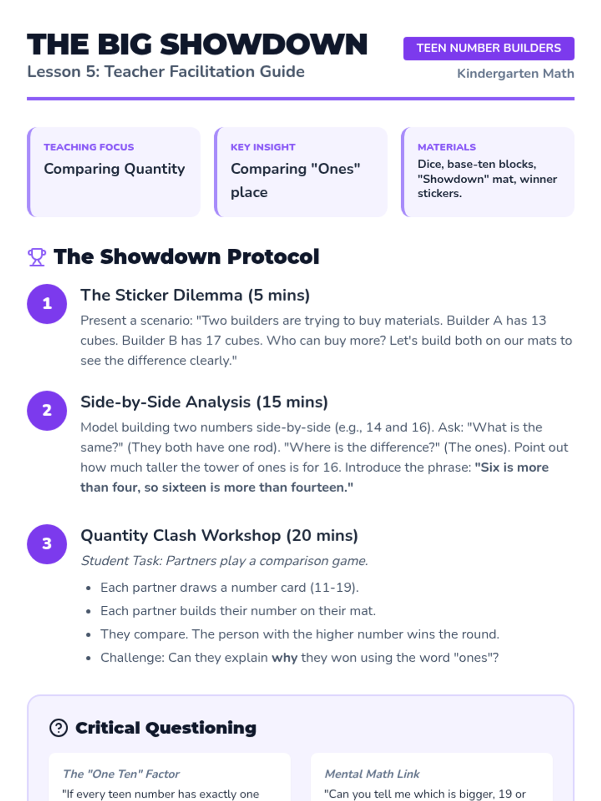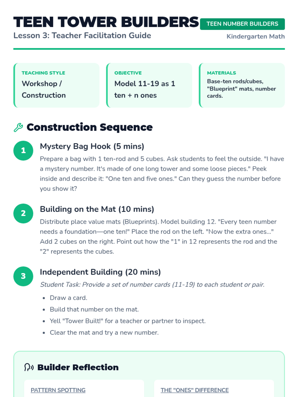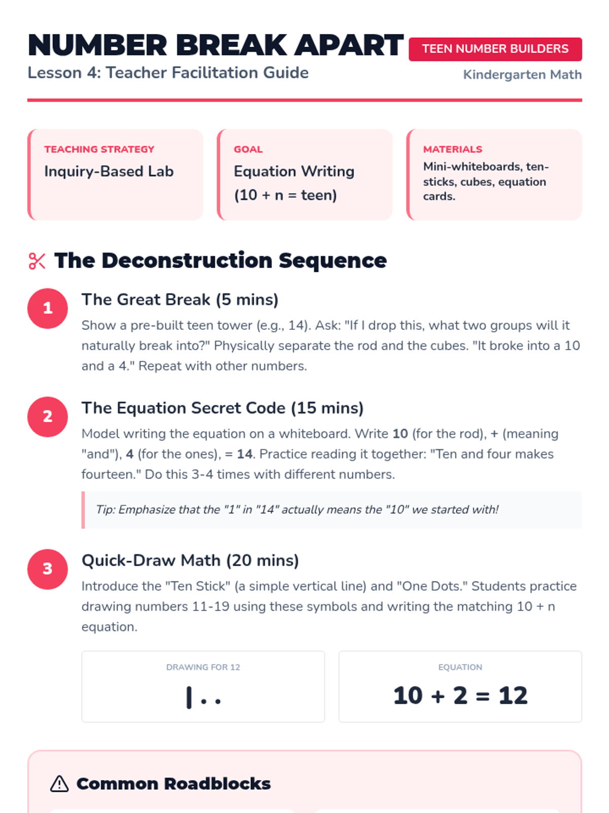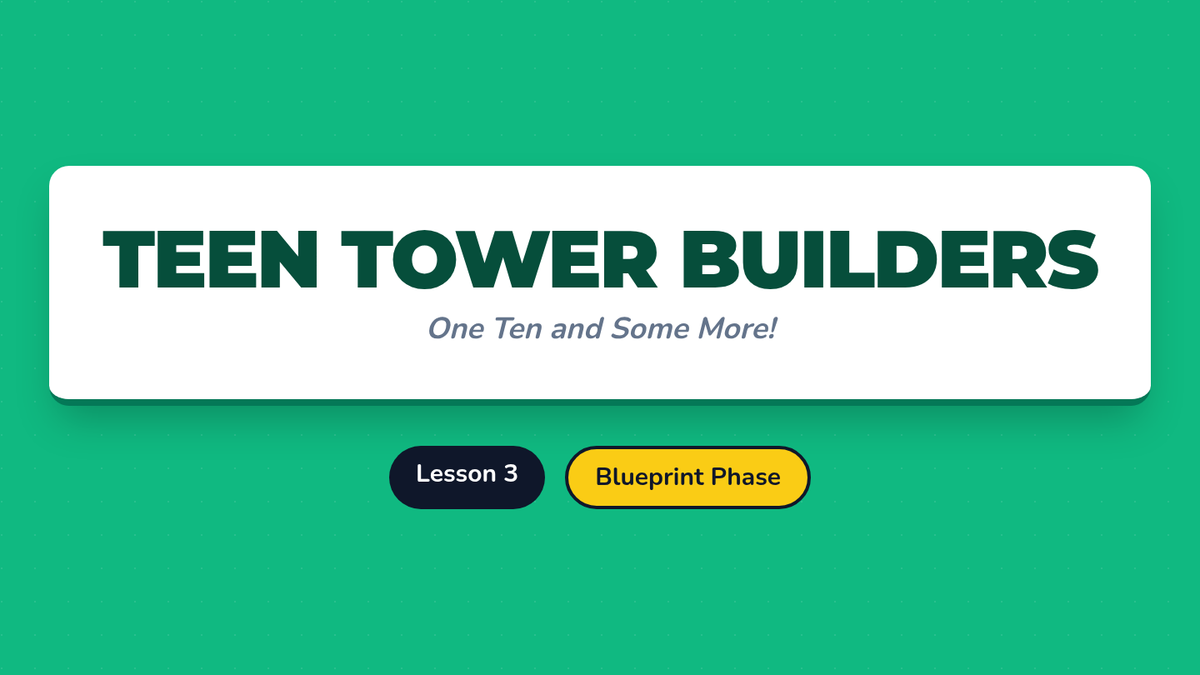 This Kindergarten sequence guides students through understanding numbers 11-19 as "ten ones and some further ones." Using hands-on bundling, base-ten blocks, and simple equations, learners build a concrete foundation for place value and number composition.