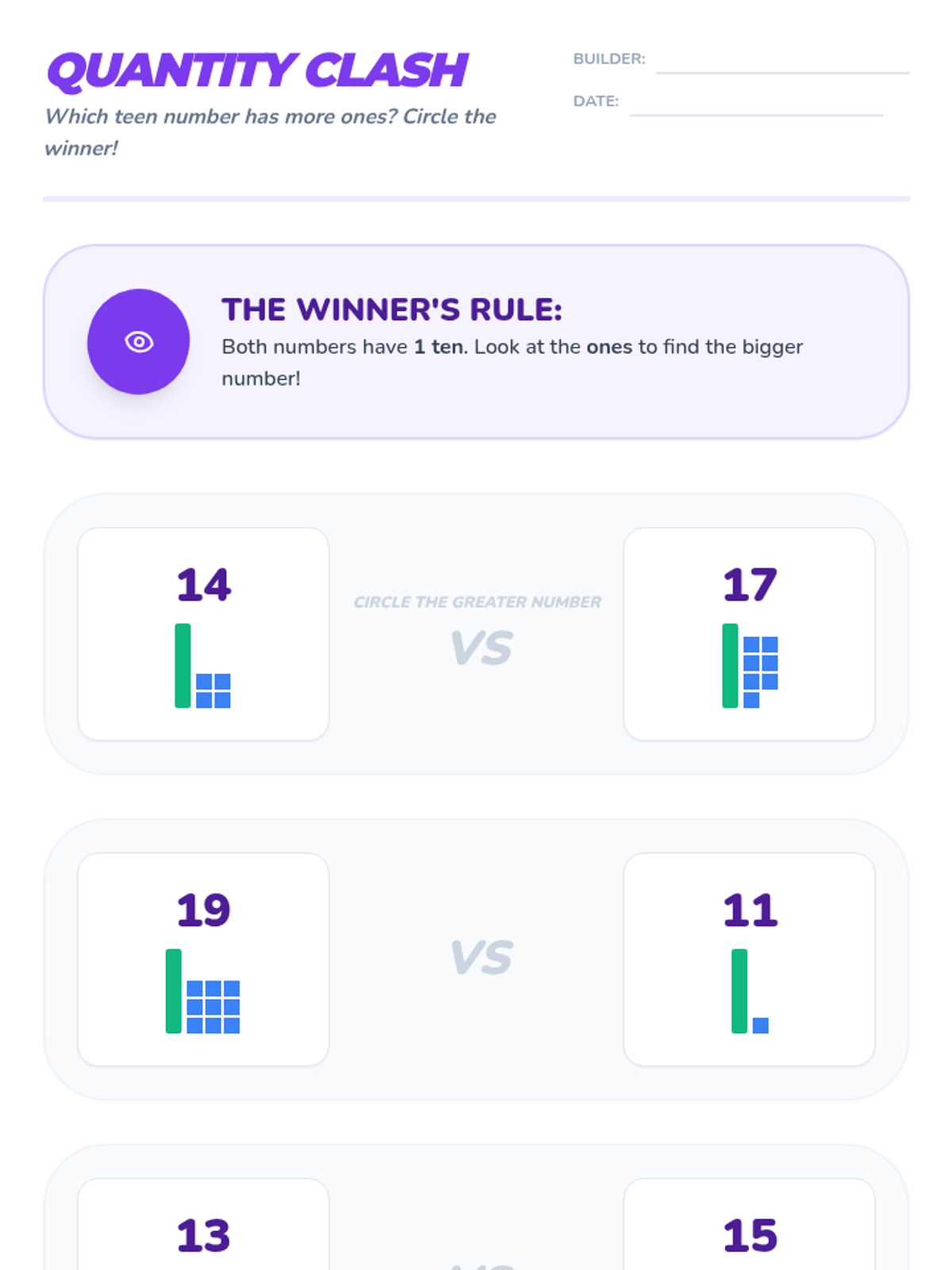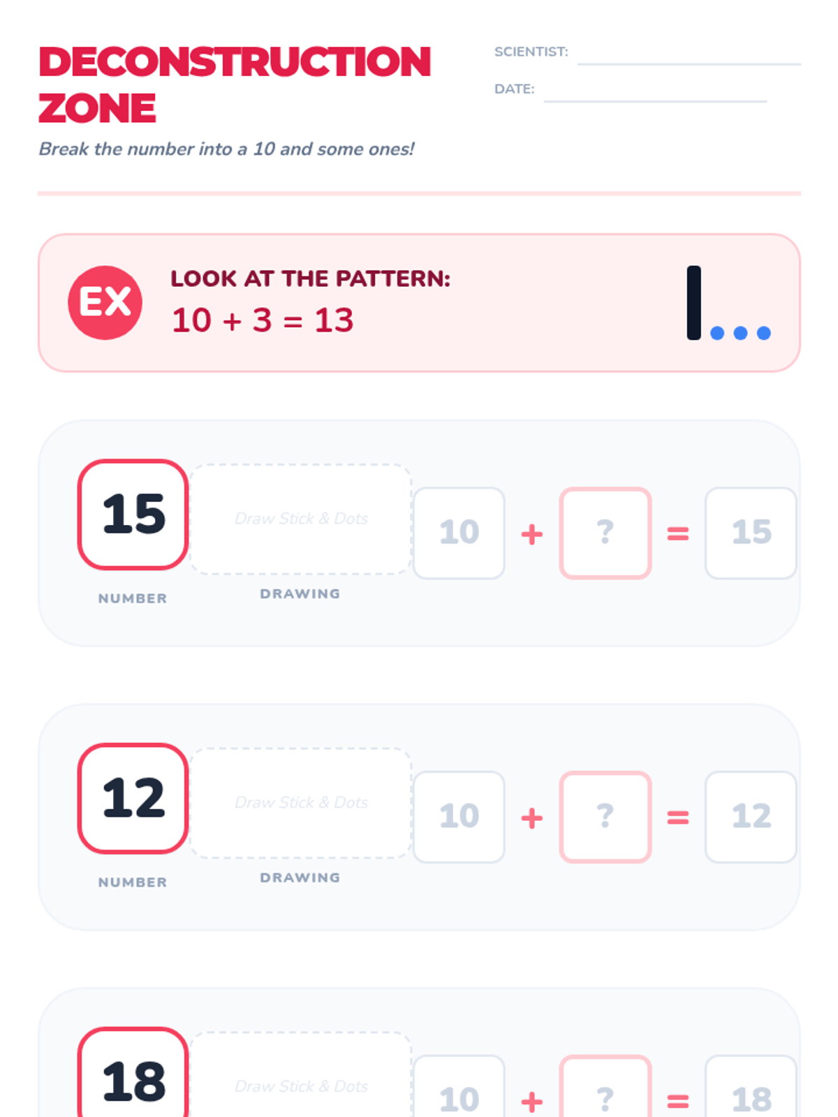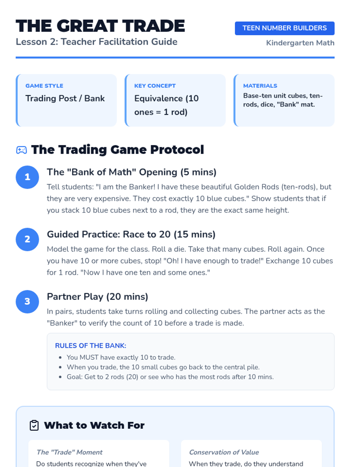 This Kindergarten sequence guides students through understanding numbers 11-19 as "ten ones and some further ones." Using hands-on bundling, base-ten blocks, and simple equations, learners build a concrete foundation for place value and number composition.