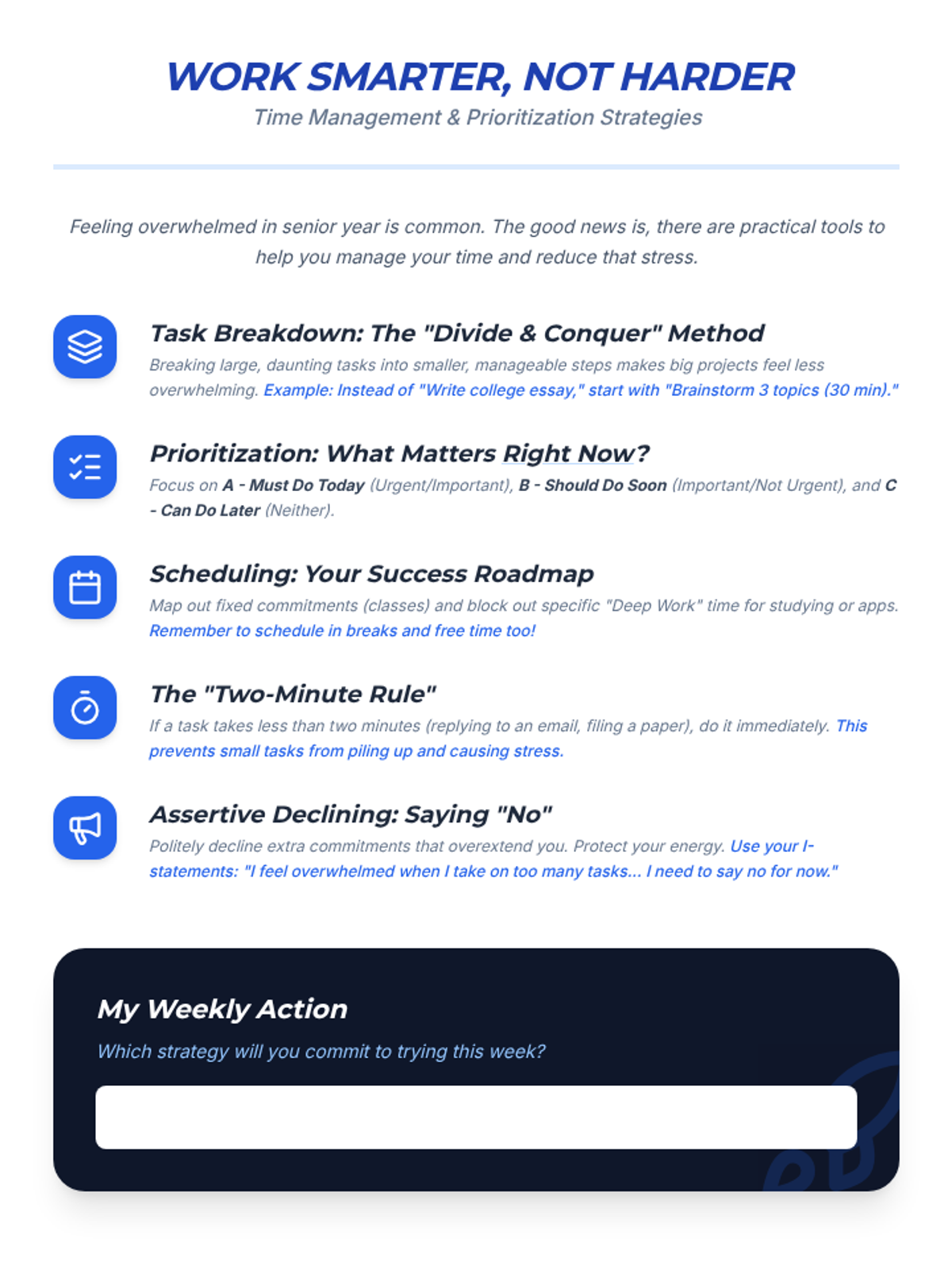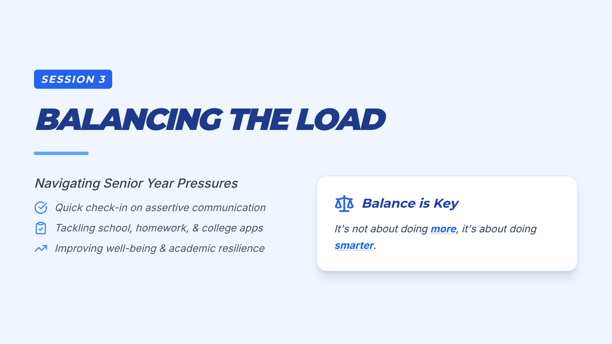 An 8-session executive functioning program designed for high schoolers to master time management and task initiation. Students use visual "maps" and blueprints to navigate their workload and build self-regulation habits.