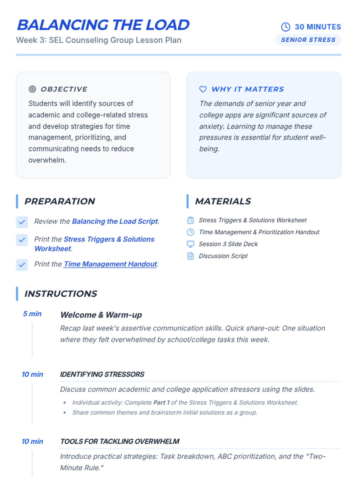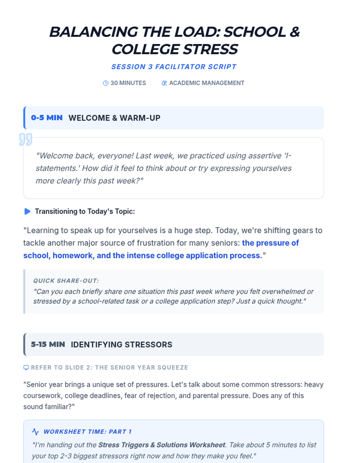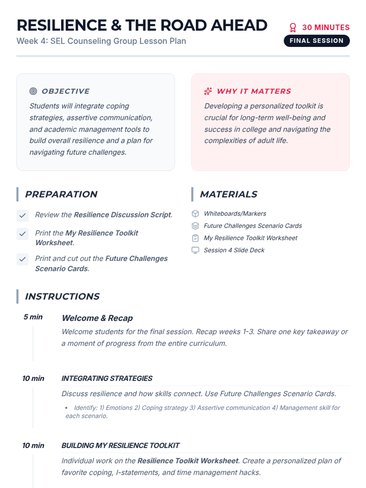 A 4-session small group counseling program for high school girls focused on identifying anxiety triggers, practicing mindfulness, and developing a personalized toolkit of coping strategies. The sequence emphasizes peer support, empowerment, and practical application within the school environment.
