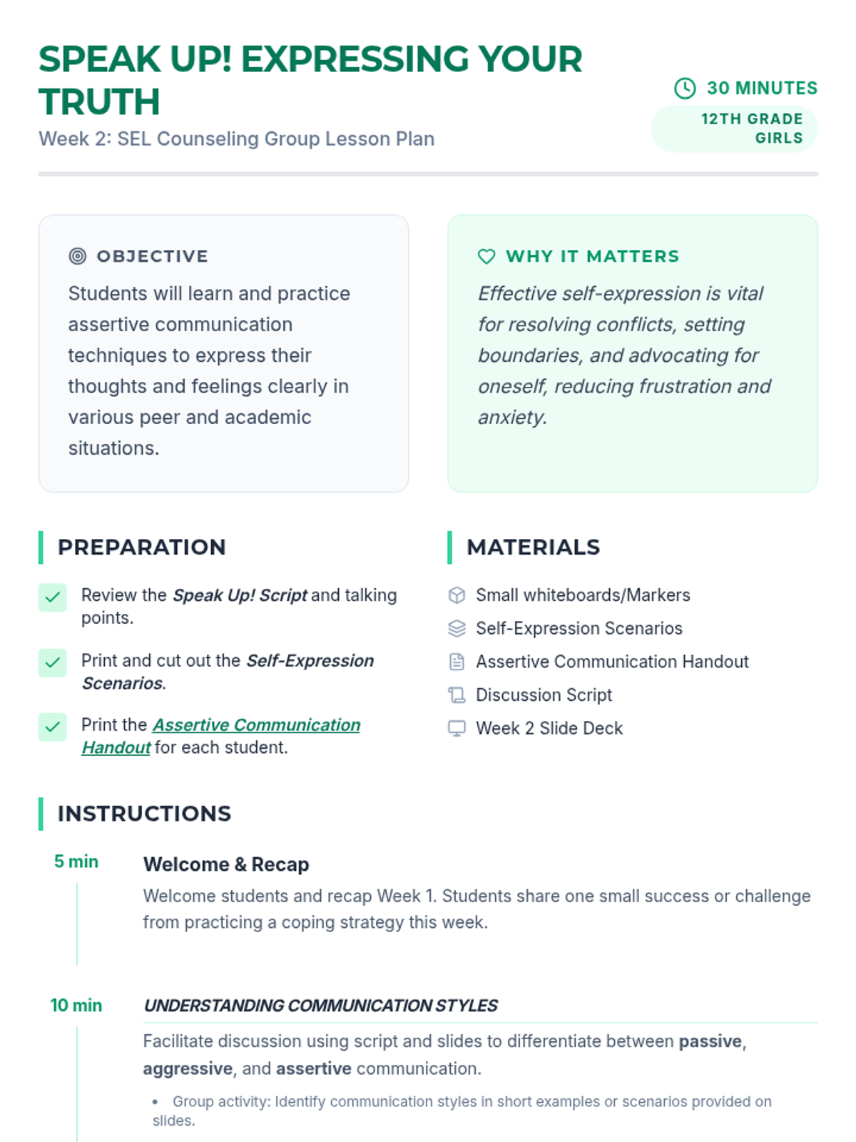 A 4-week SEL counseling curriculum for 12th-grade girls focusing on healthy coping with frustration and anxiety, assertive self-expression, and managing academic/college stress in a Tier 2 small group setting.