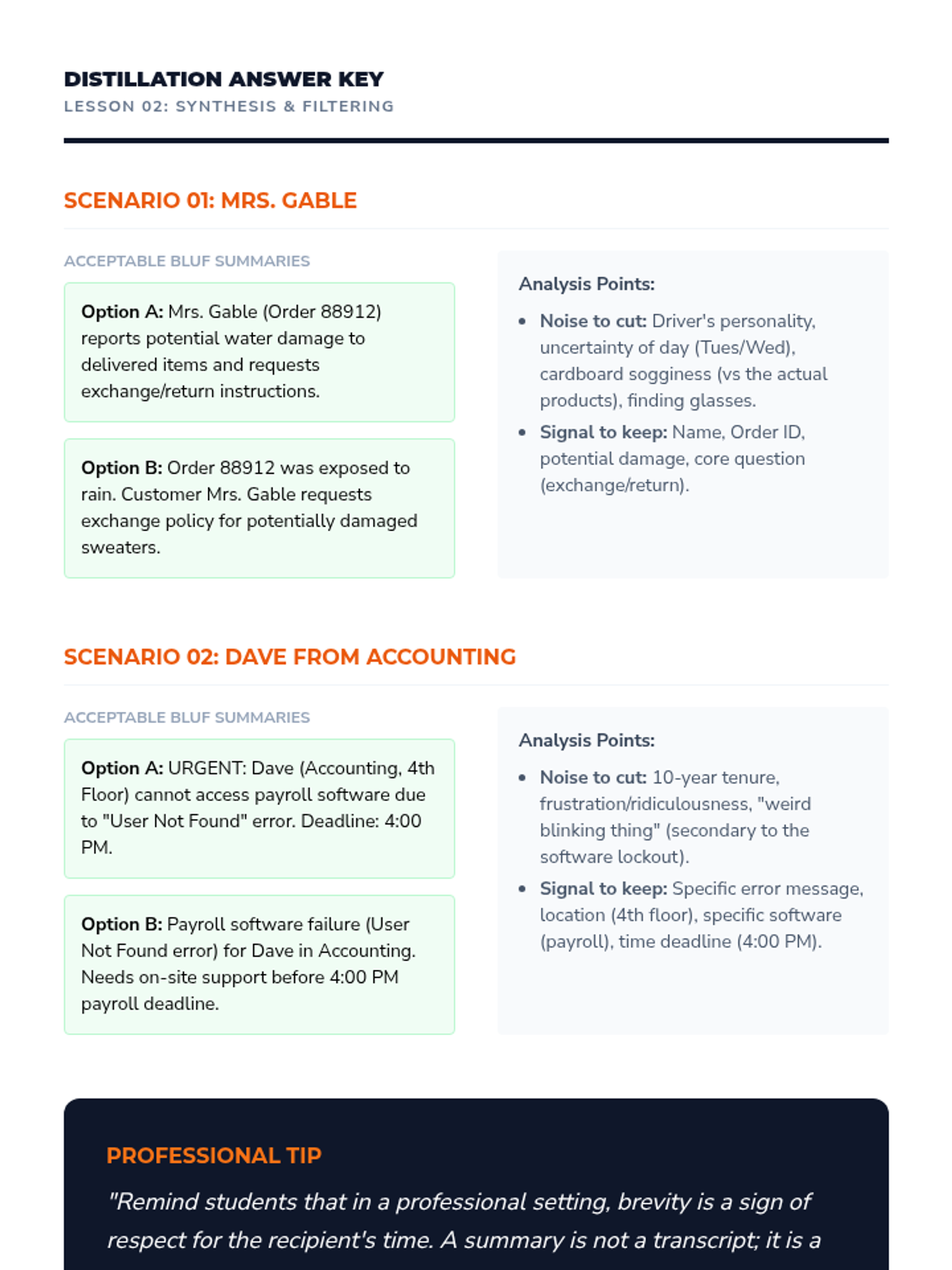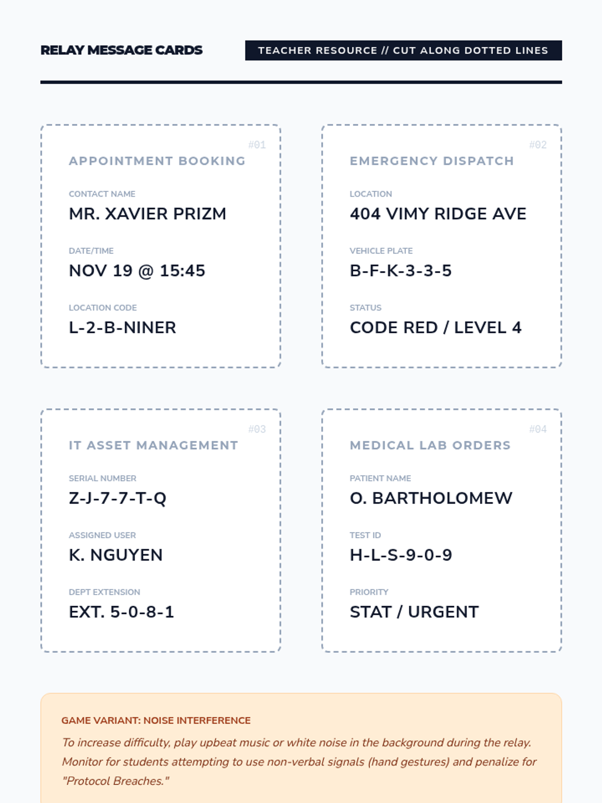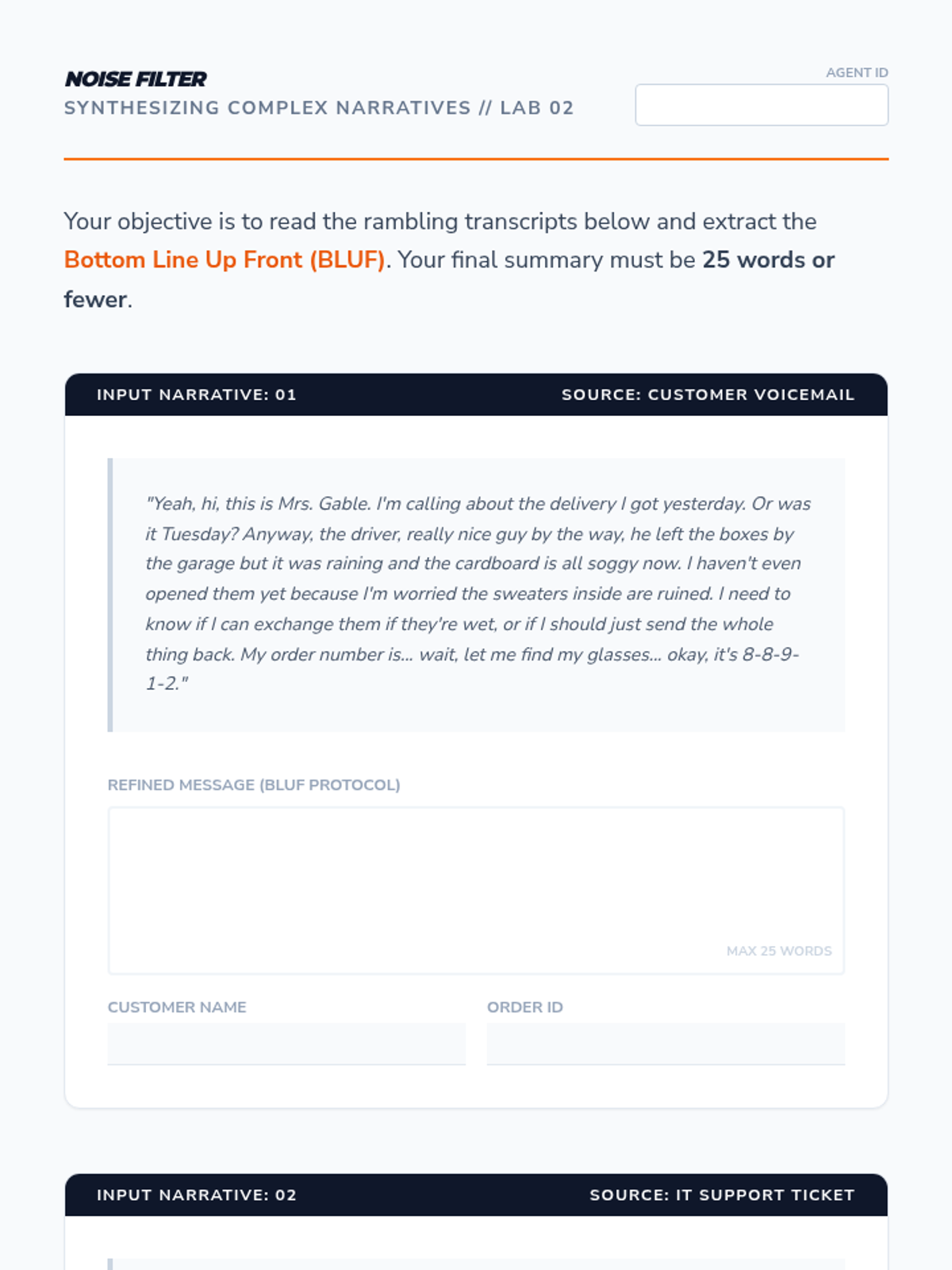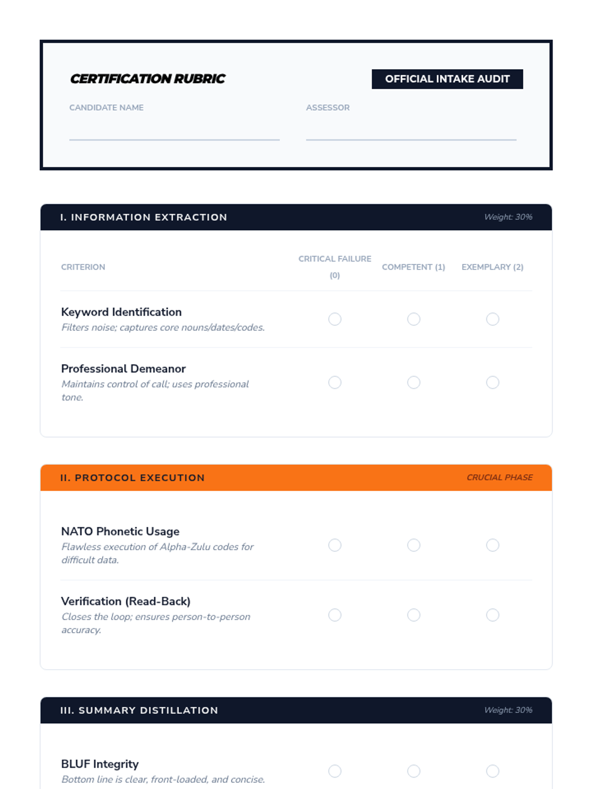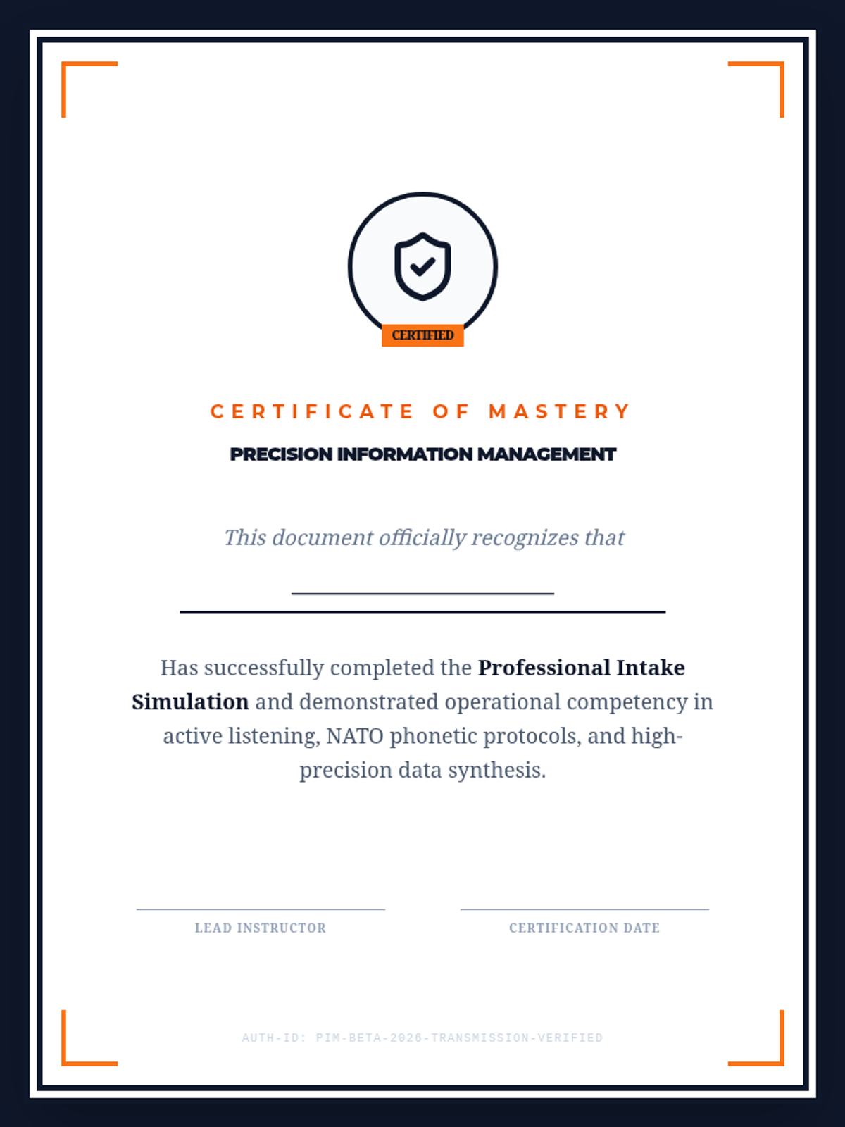 This sequence treats phone communication as a high-precision discipline. Students master active listening, the NATO phonetic alphabet, information filtering, and verification techniques to ensure the integrity of data moving from verbal to written formats.