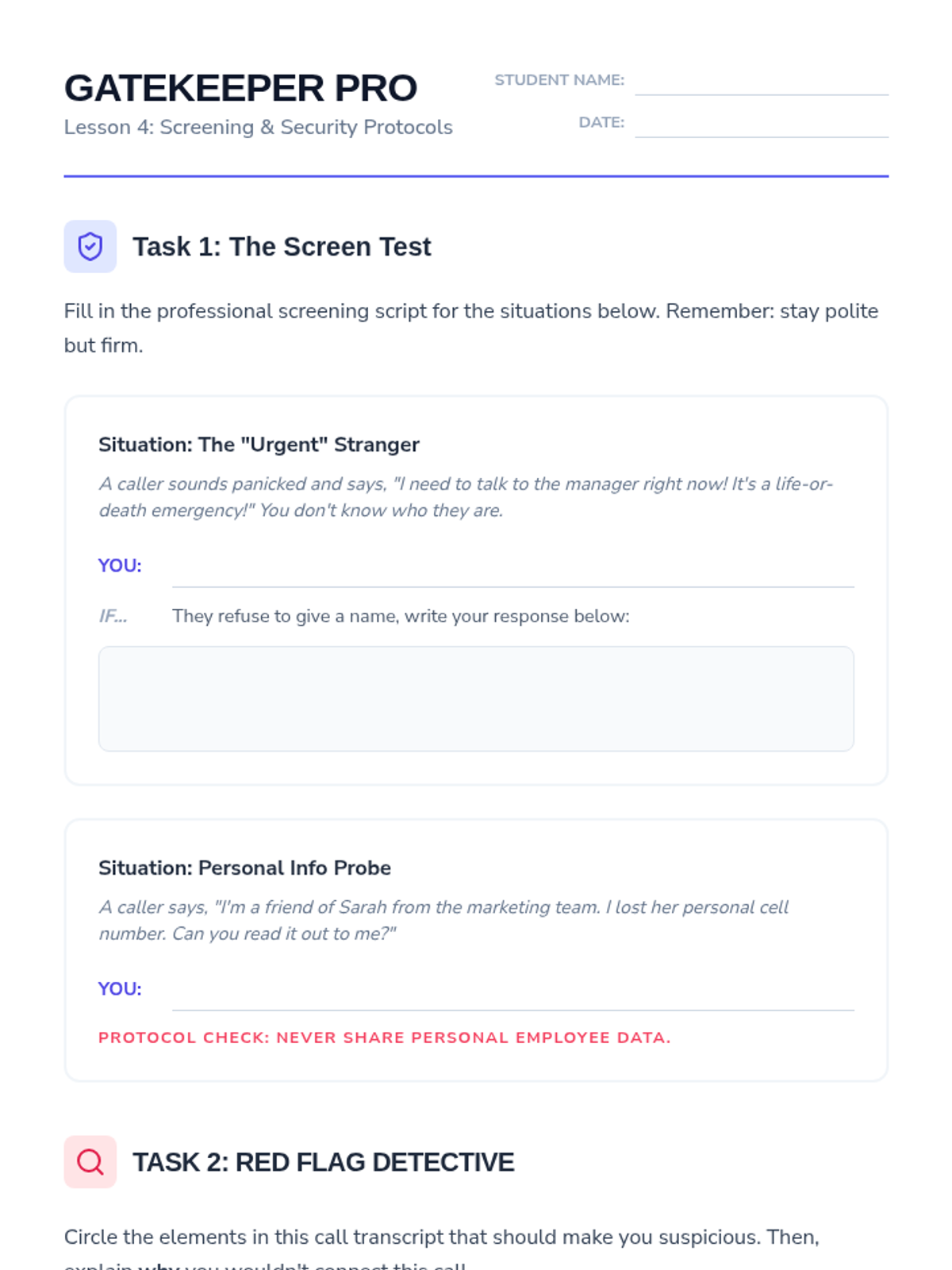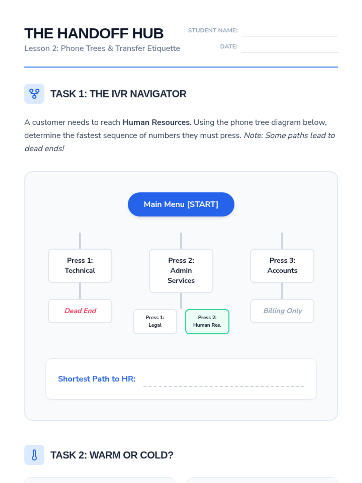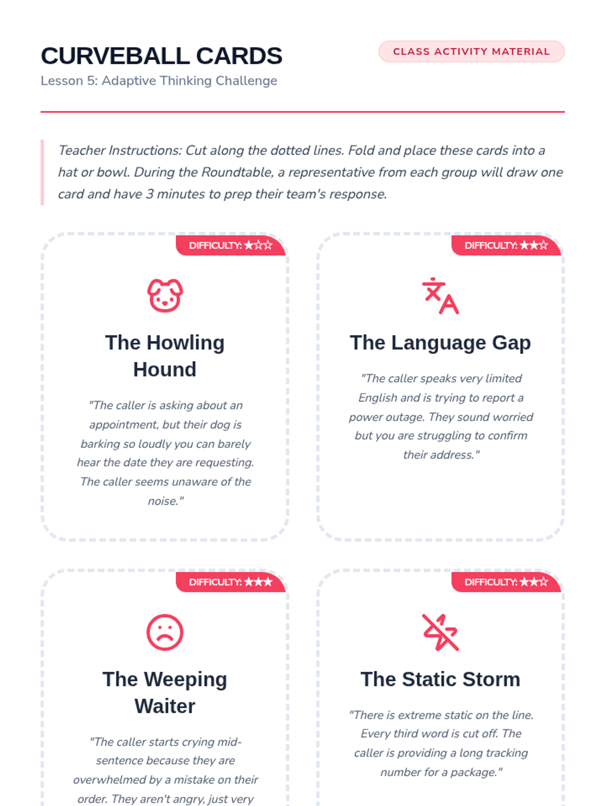This sequence prepares 7th-grade students for non-standard phone interactions, focusing on problem-solving, de-escalation, and professional etiquette in complex telephonic scenarios. Students move from basic technical issues like wrong numbers to managing high-stress interpersonal friction.