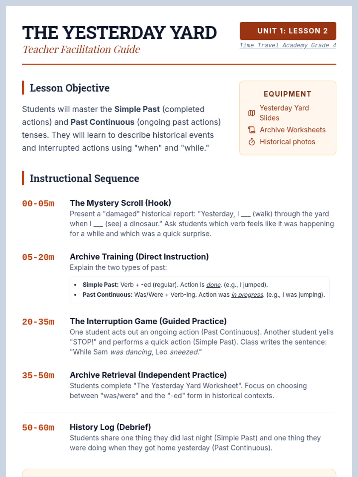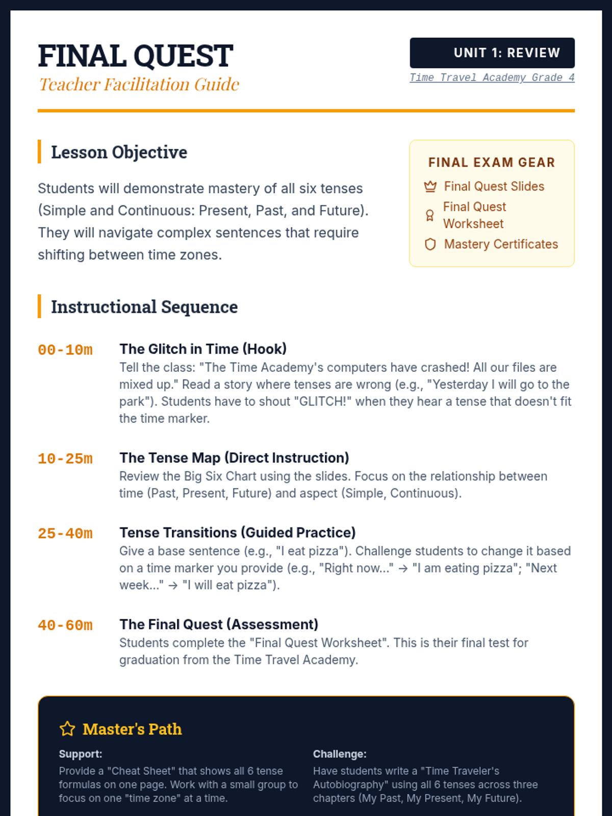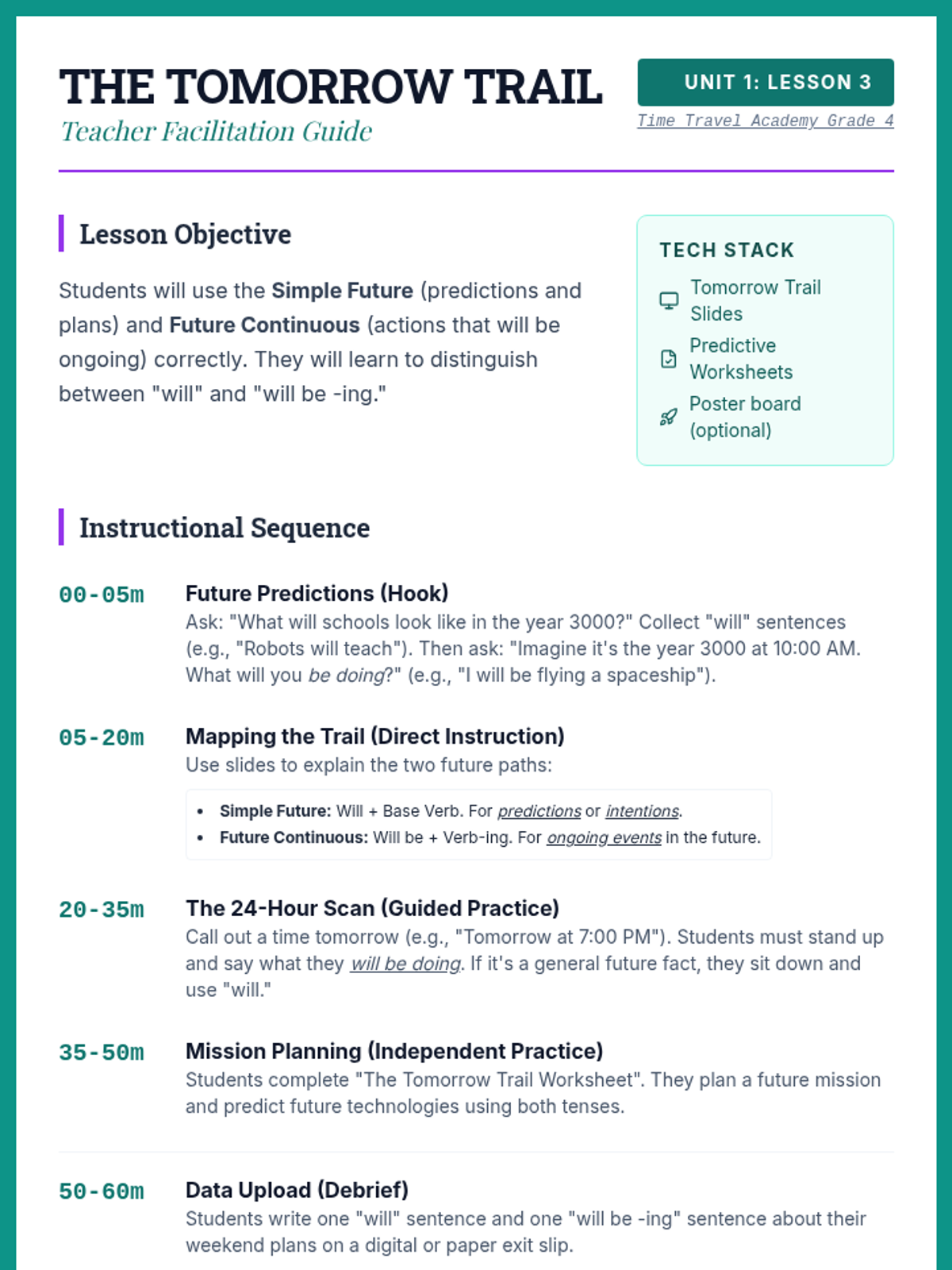 A comprehensive 4-part grammar unit for 4th grade focusing on verb tenses (Simple and Continuous) through the lens of a Time Travel Academy. Students learn to navigate the 'Now Zone', 'Yesterday Yard', and 'Tomorrow Trail' to master grammar.