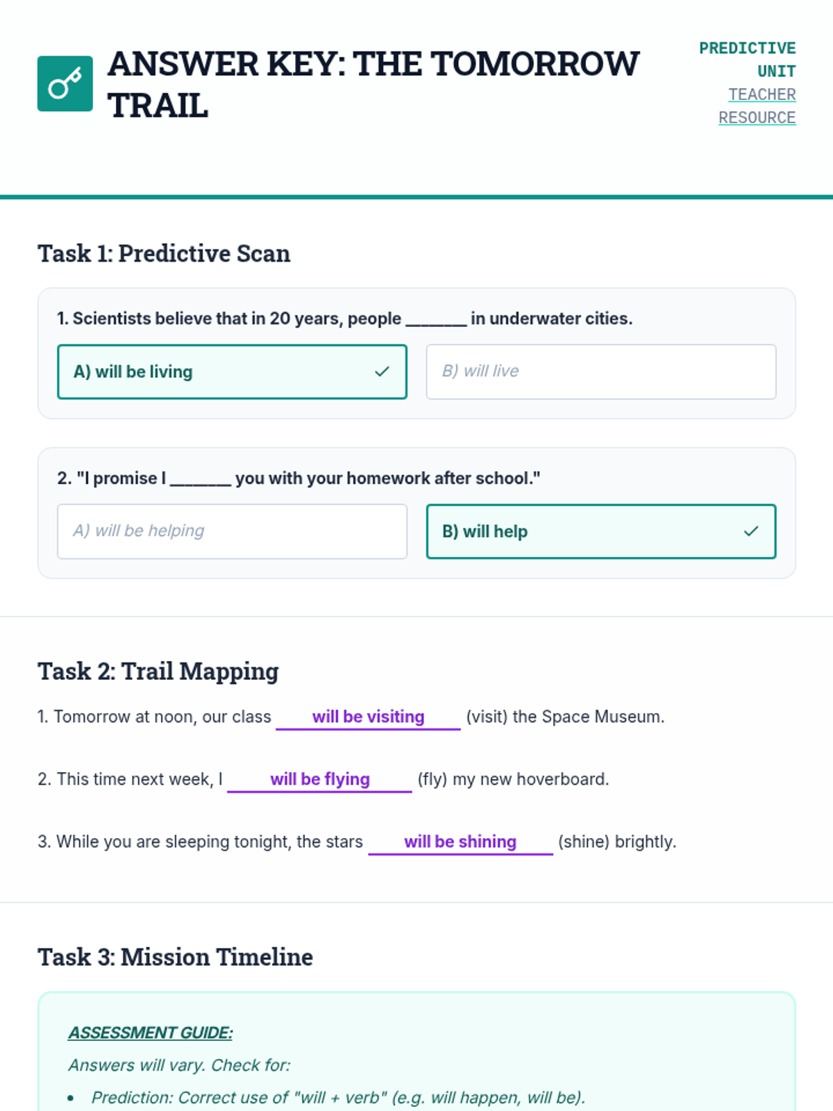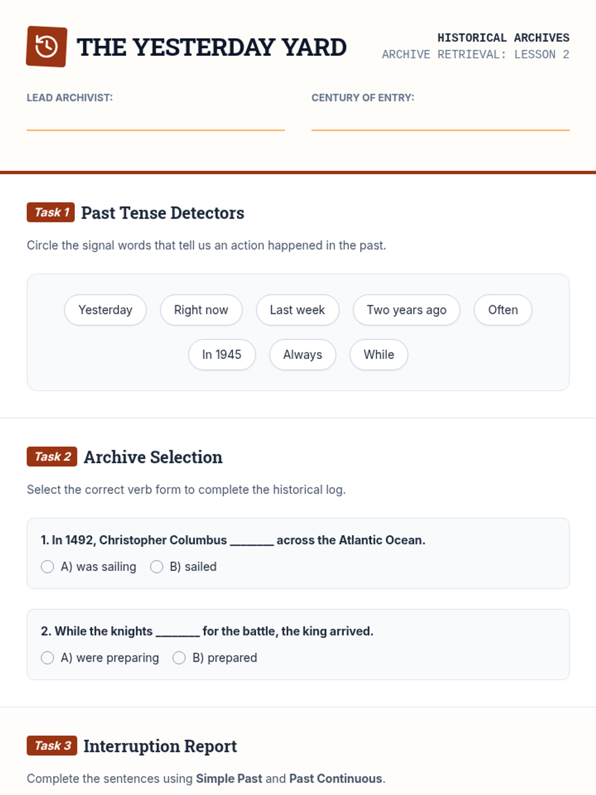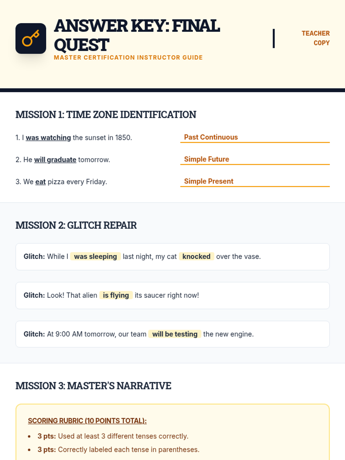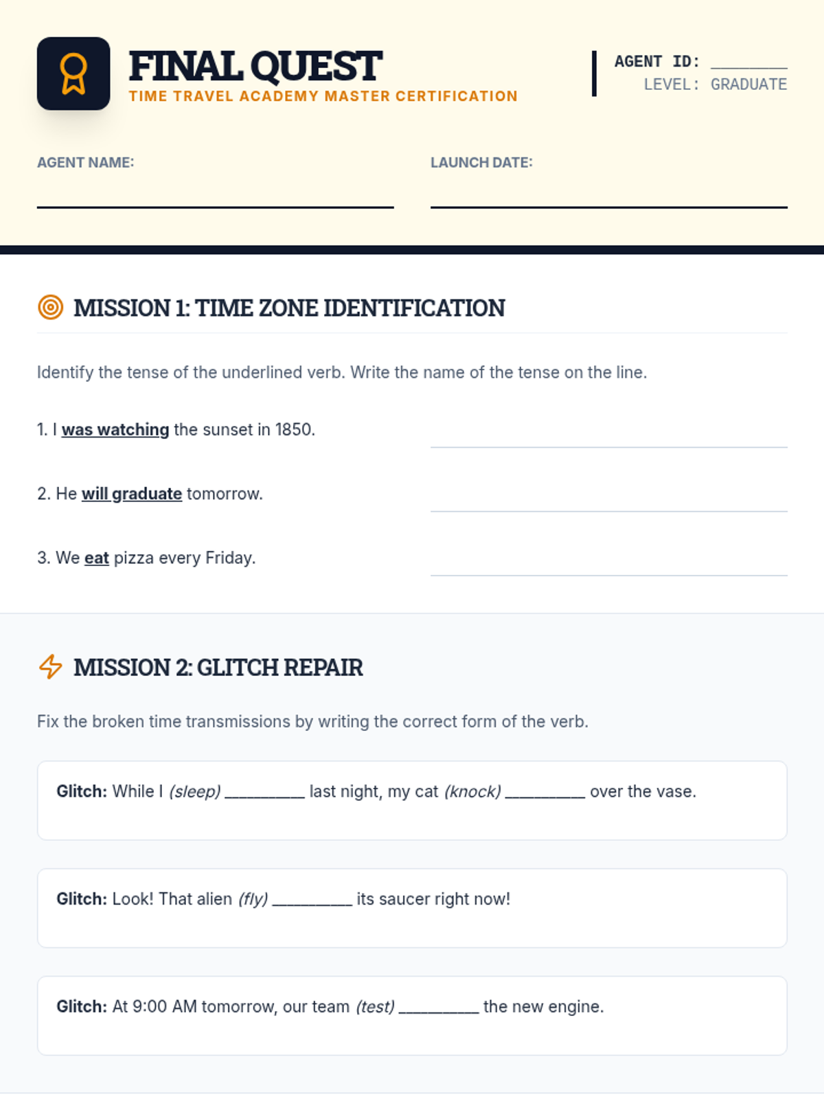 A comprehensive 4-part grammar unit for 4th grade focusing on verb tenses (Simple and Continuous) through the lens of a Time Travel Academy. Students learn to navigate the 'Now Zone', 'Yesterday Yard', and 'Tomorrow Trail' to master grammar.