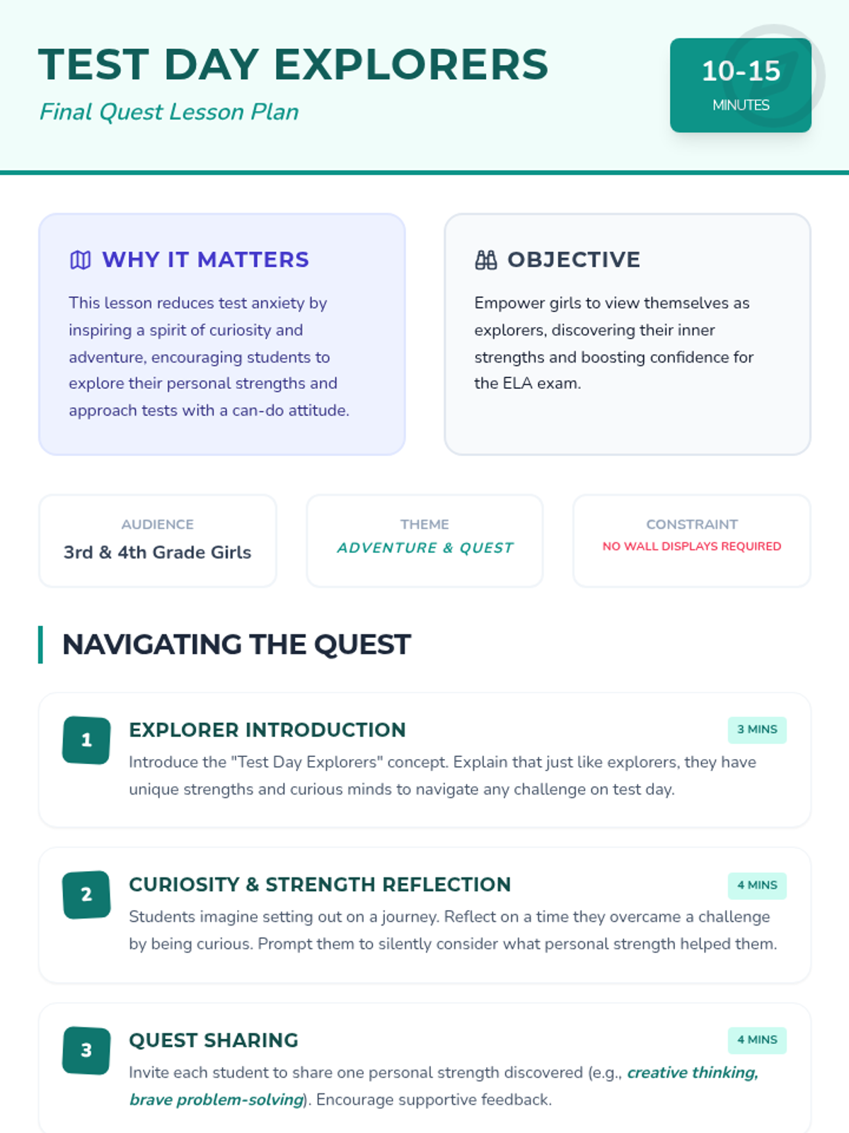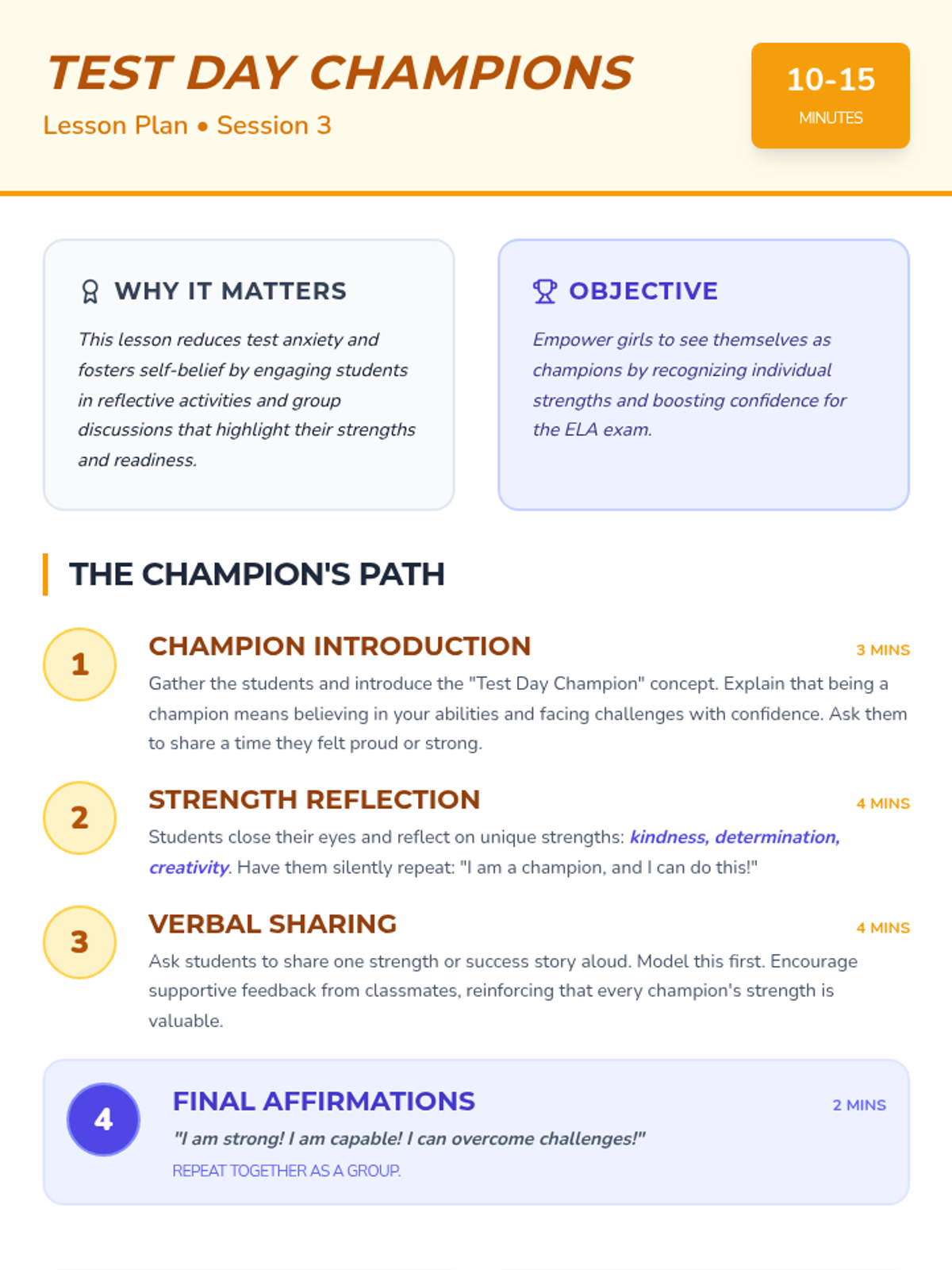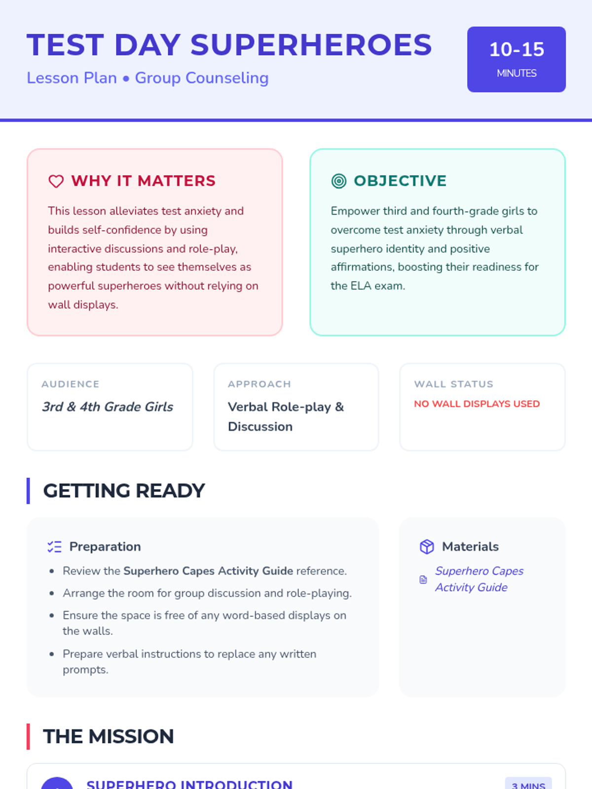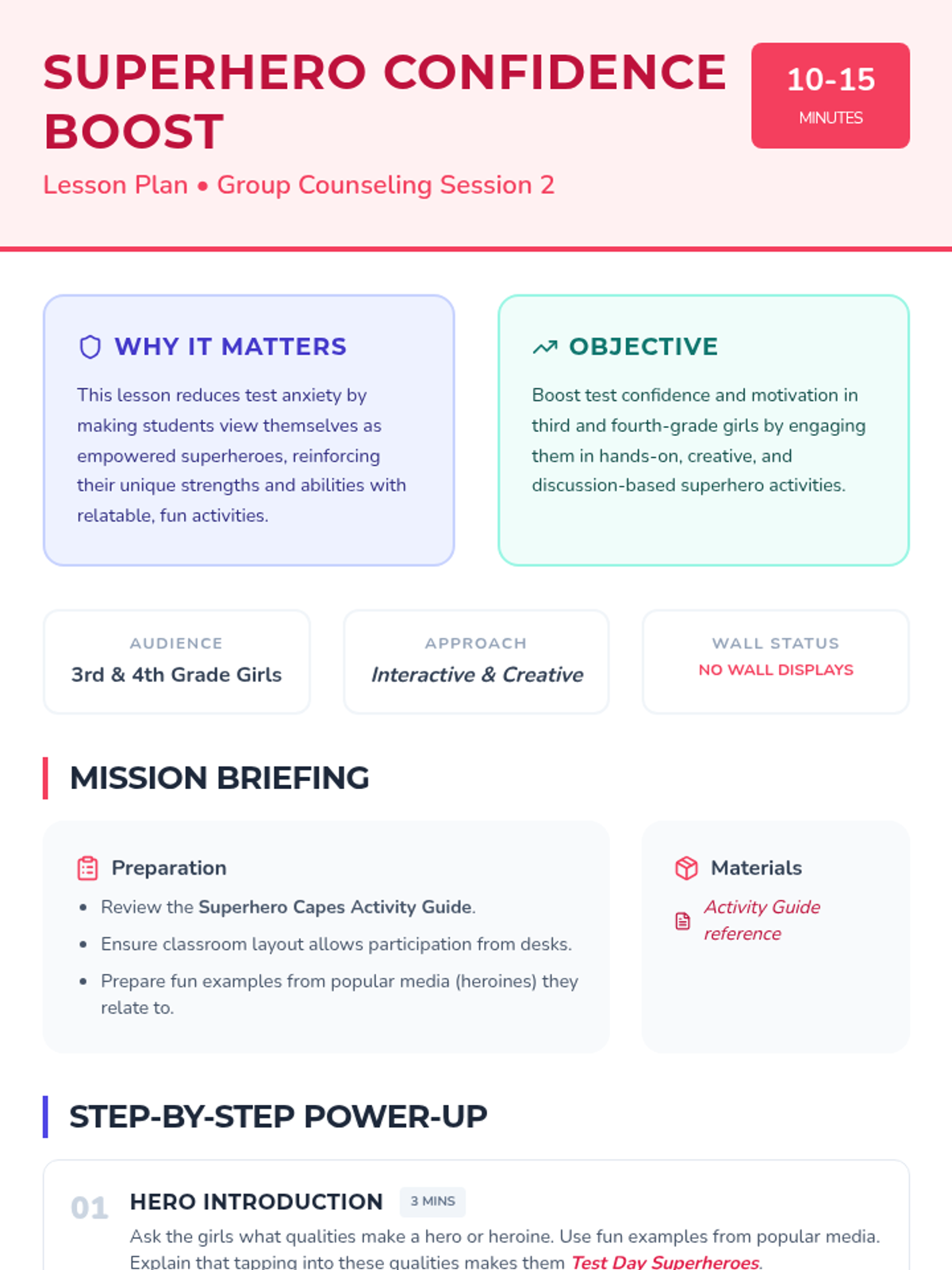 A group counseling sequence for 3rd and 4th-grade girls focused on managing test anxiety and building confidence through themes of superheroes, champions, and explorers. Students learn positive affirmations and visualization techniques to approach the ELA exam with a positive mindset.