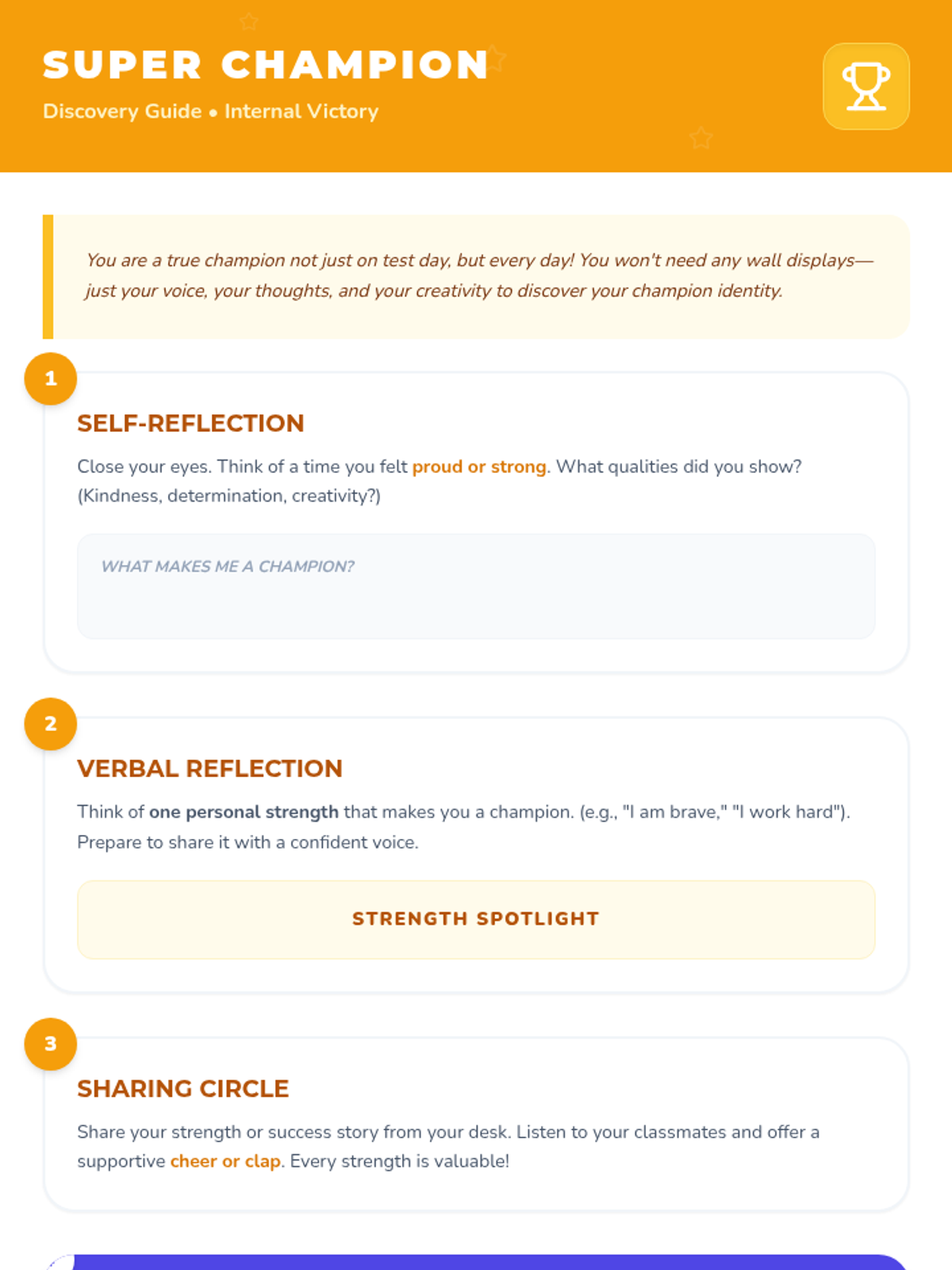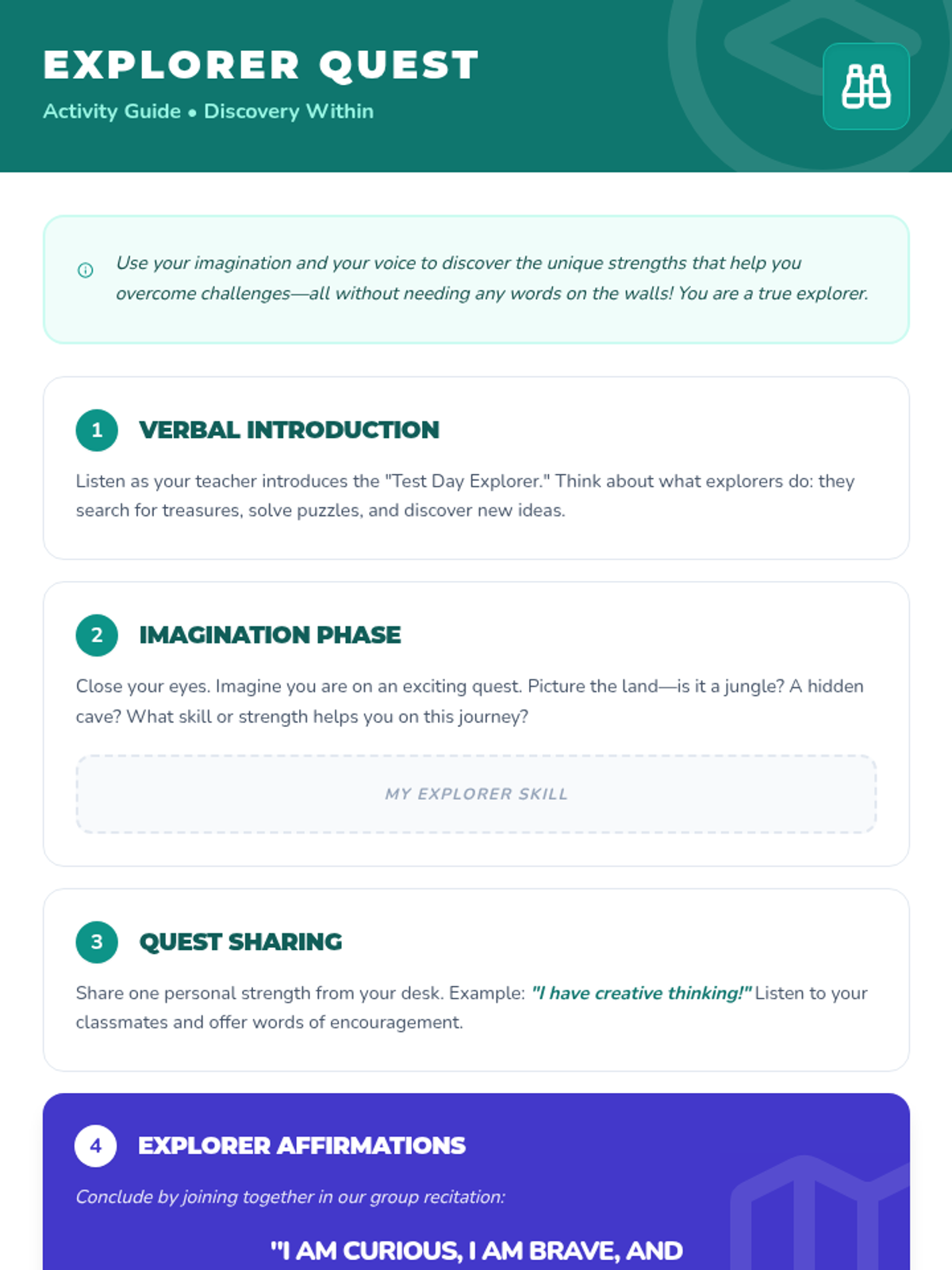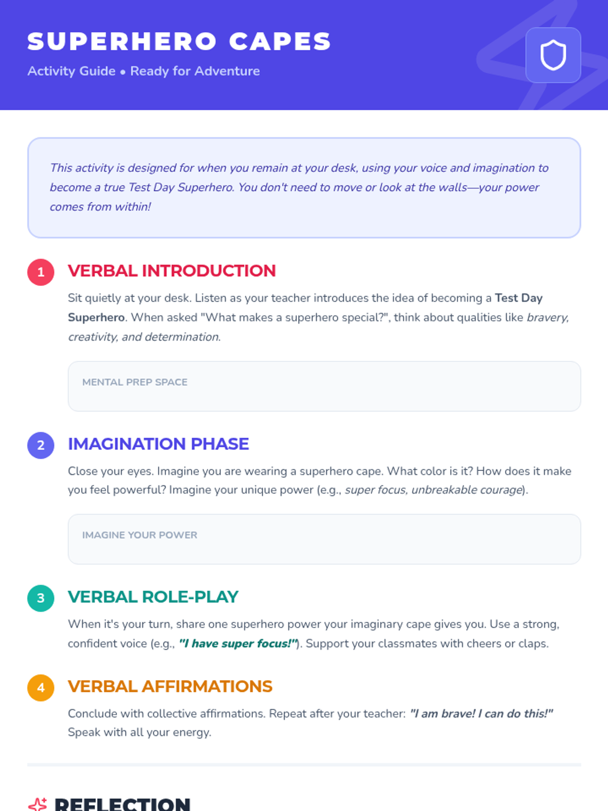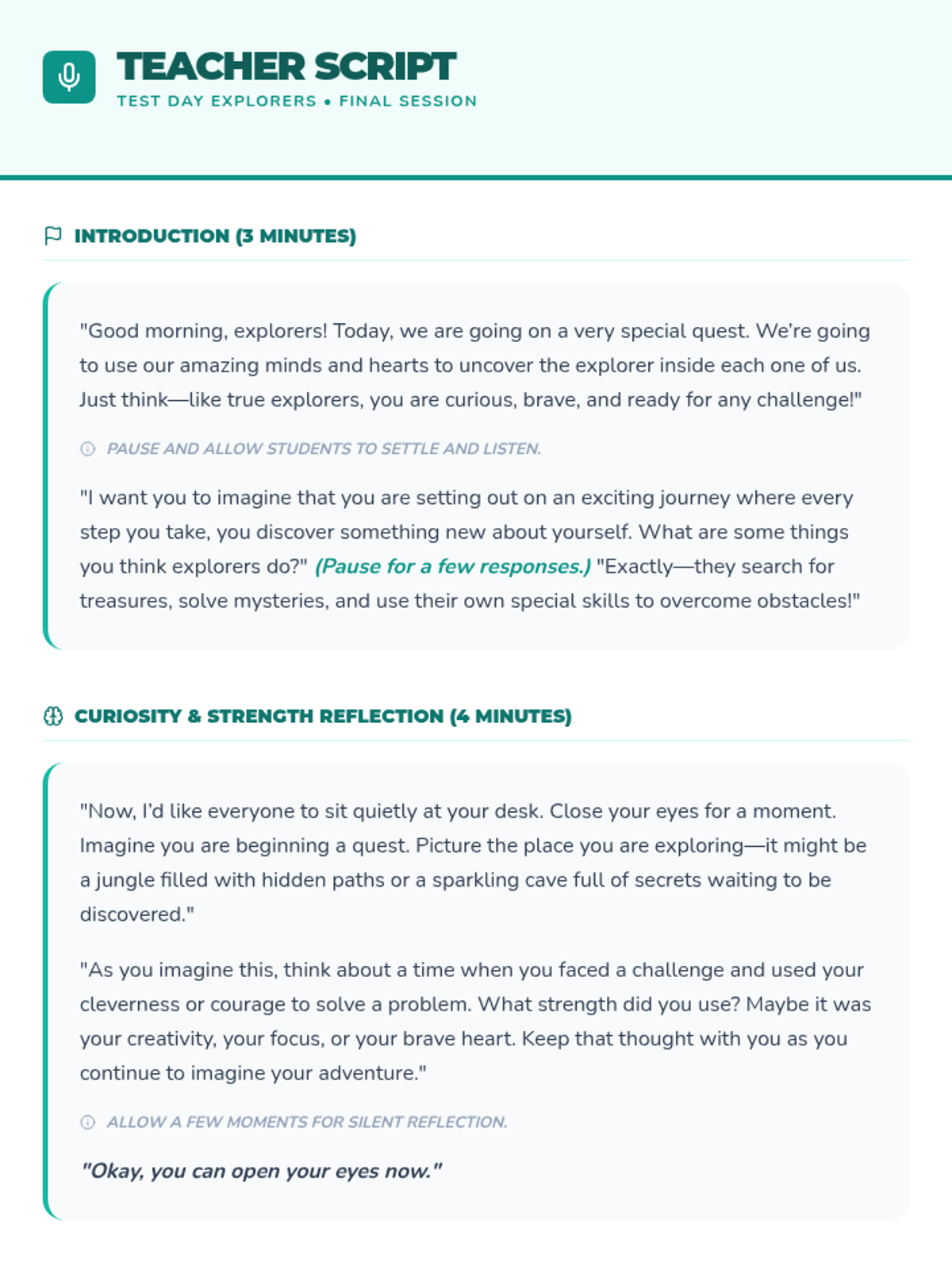 A group counseling sequence for 3rd and 4th-grade girls focused on managing test anxiety and building confidence through themes of superheroes, champions, and explorers. Students learn positive affirmations and visualization techniques to approach the ELA exam with a positive mindset.
