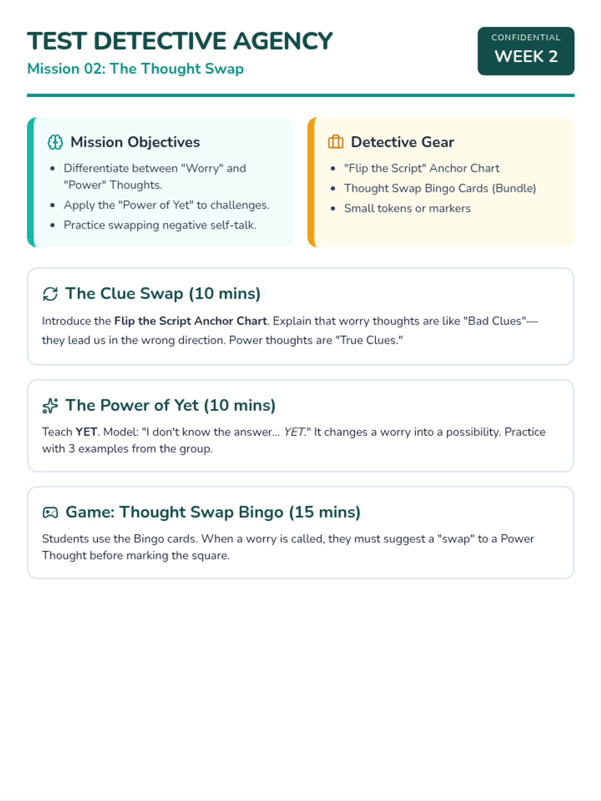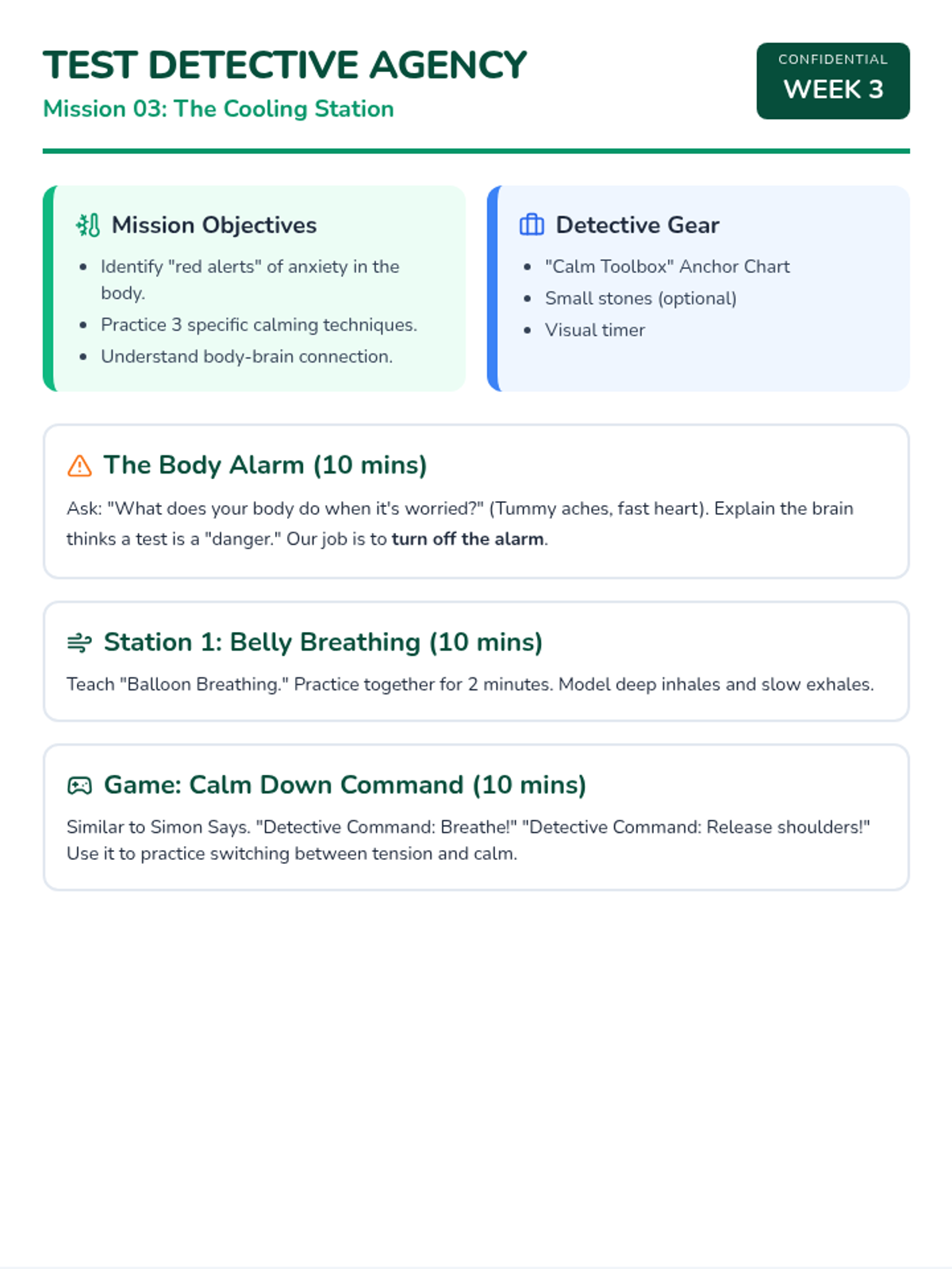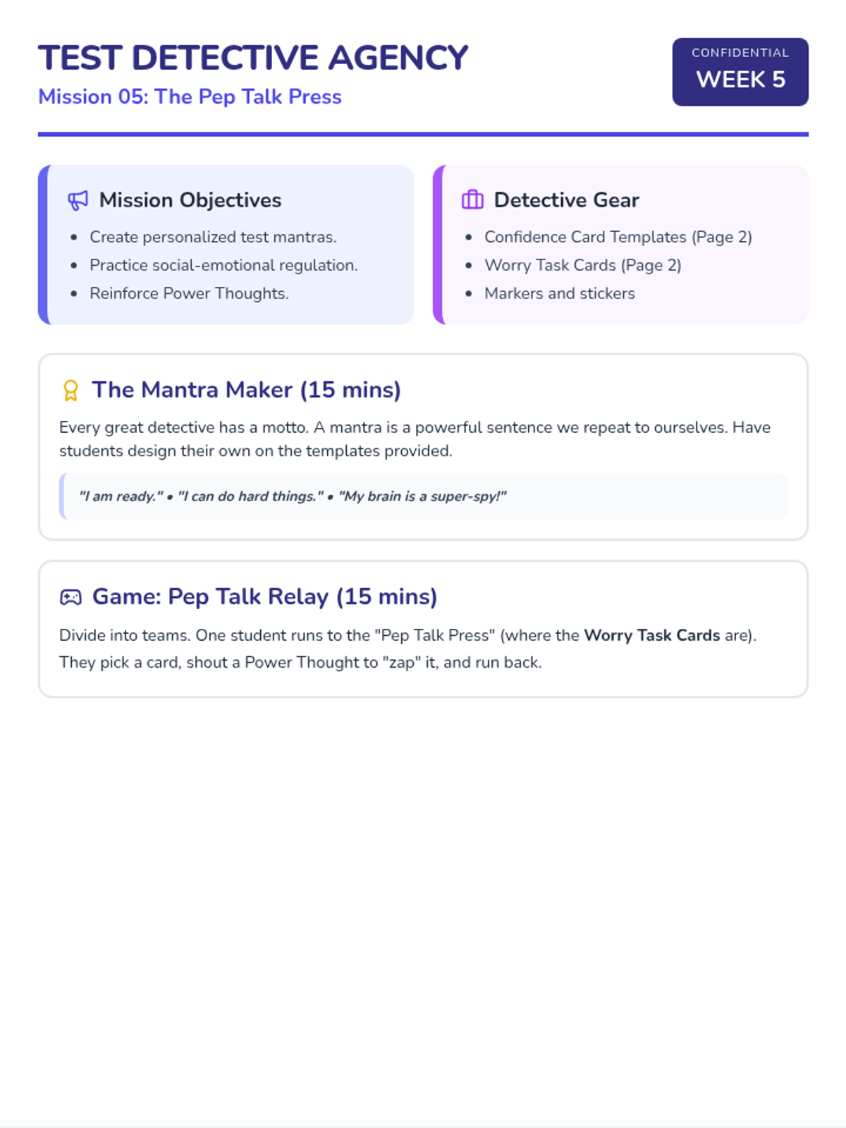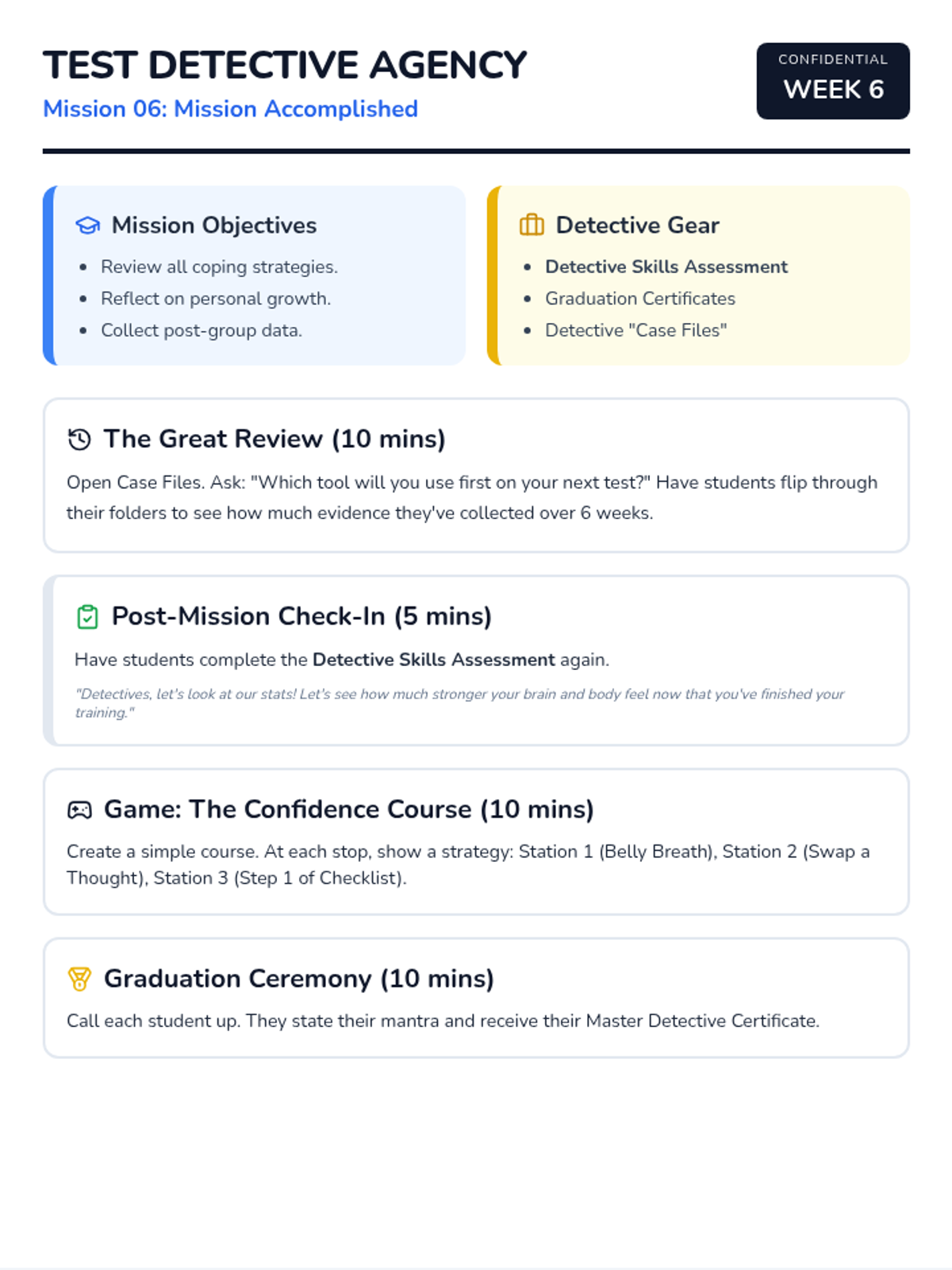 A 6-week small group counseling curriculum for 3rd graders designed to reduce test anxiety through the lens of 'Test Detectives.' Students learn to identify anxiety, use positive self-talk, and master practical test-taking strategies.