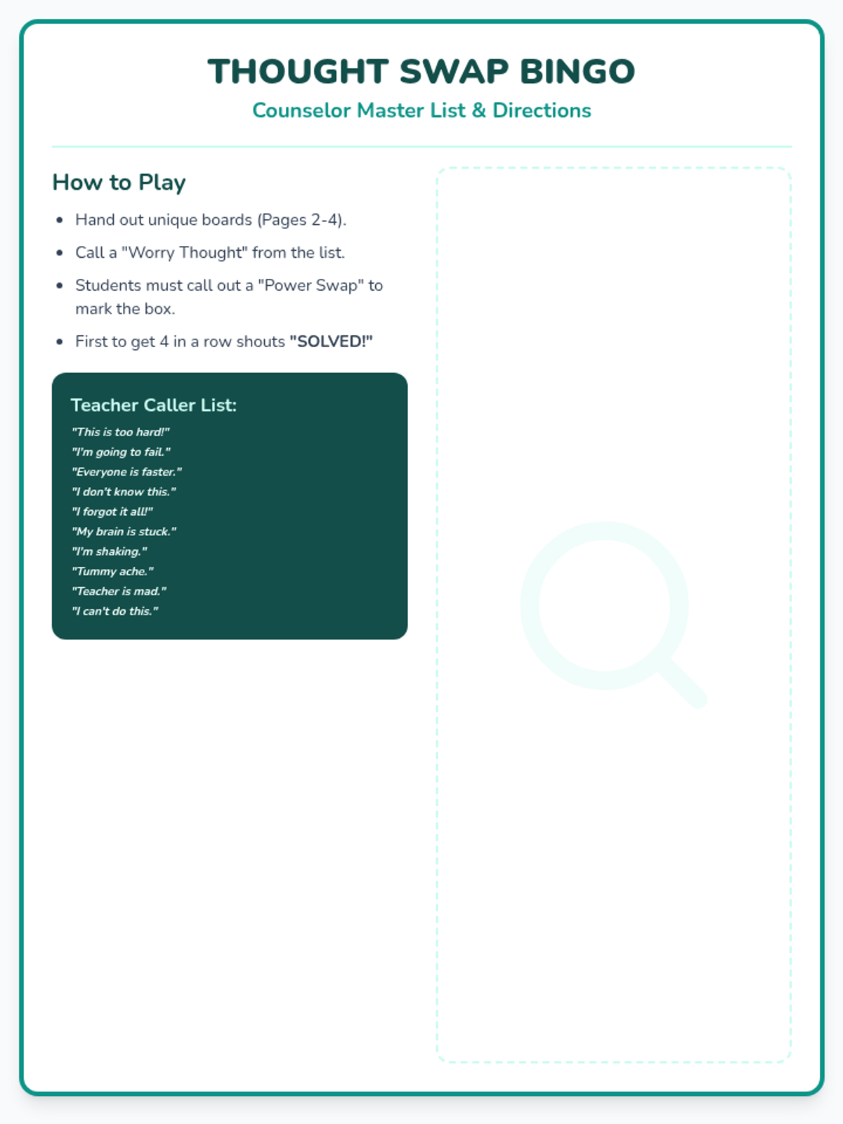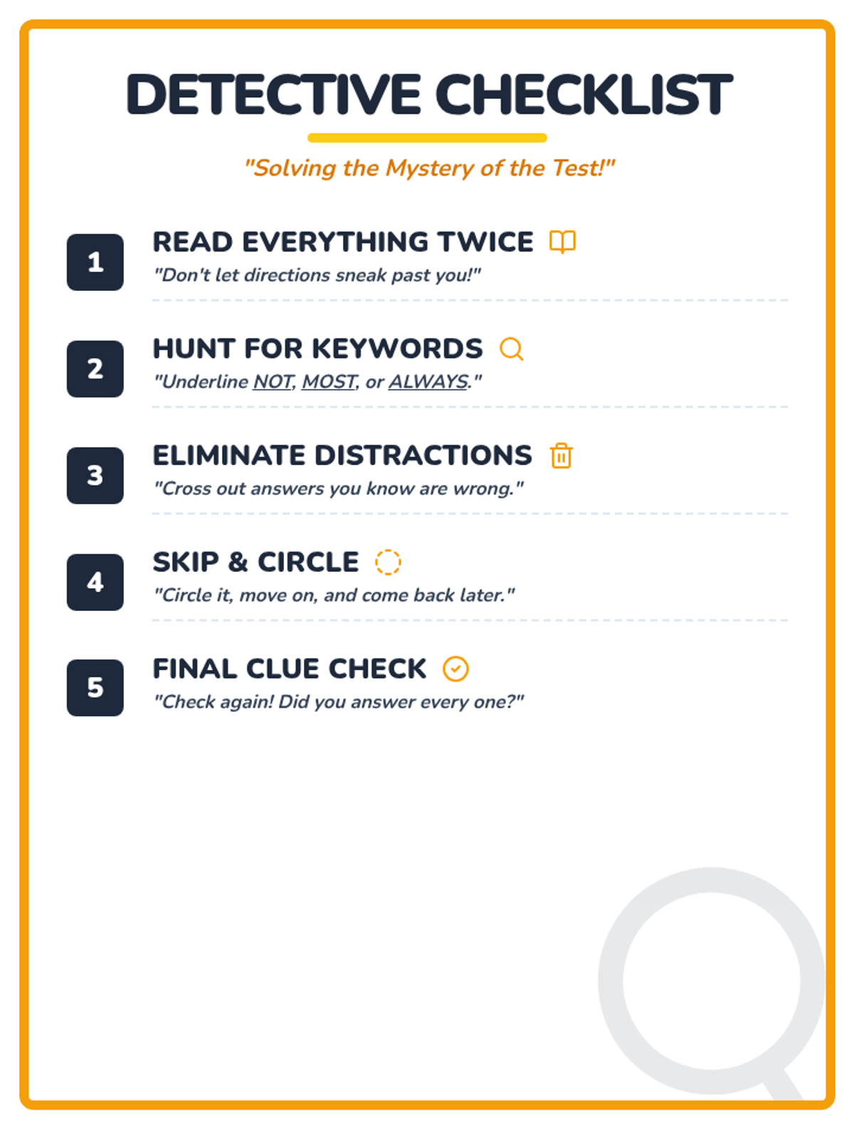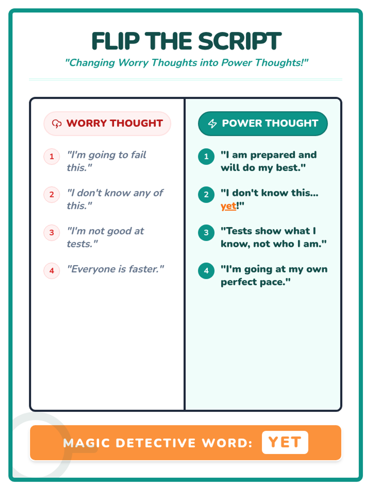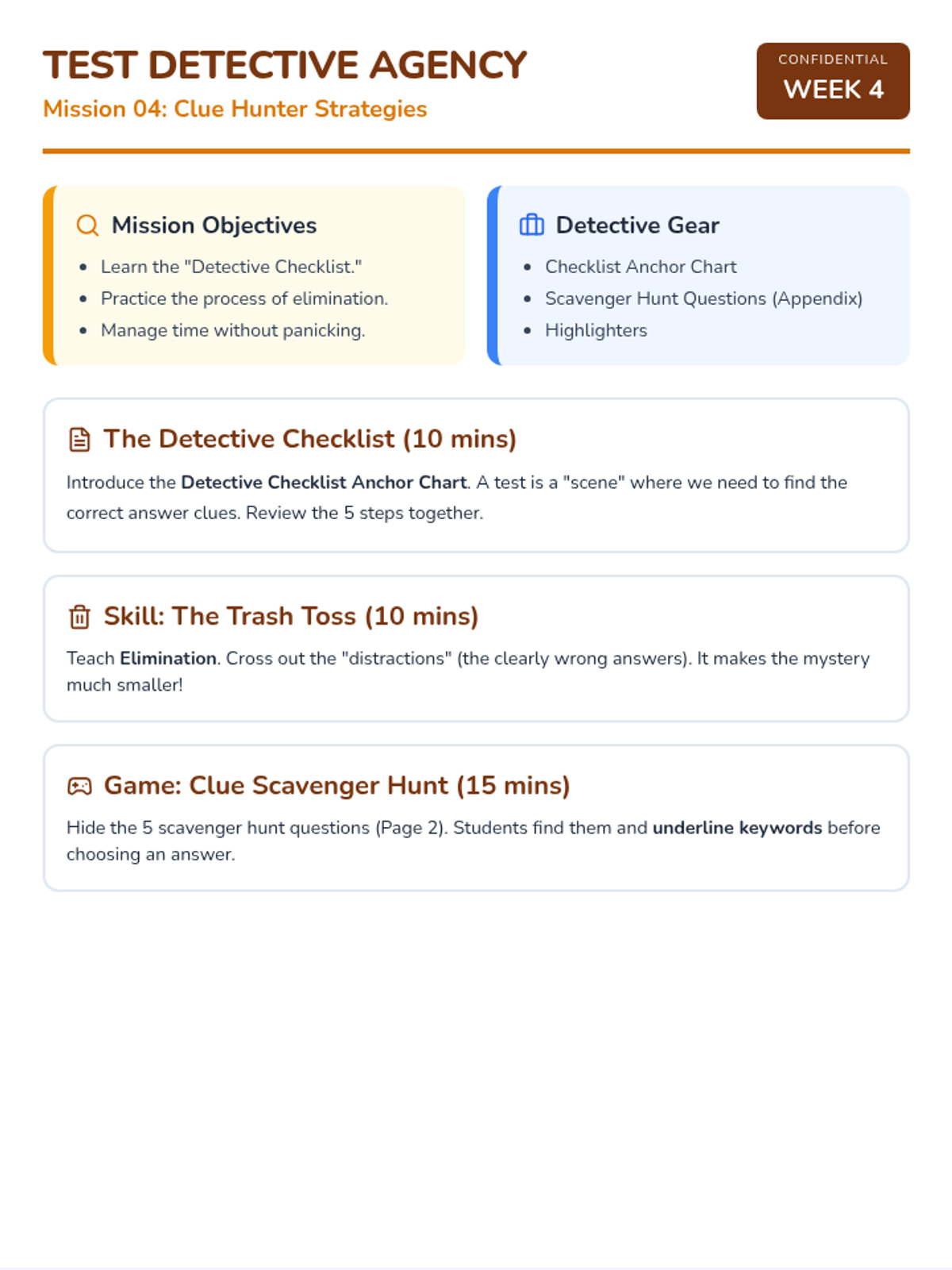 A 6-week small group counseling curriculum for 3rd graders designed to reduce test anxiety through the lens of 'Test Detectives.' Students learn to identify anxiety, use positive self-talk, and master practical test-taking strategies.