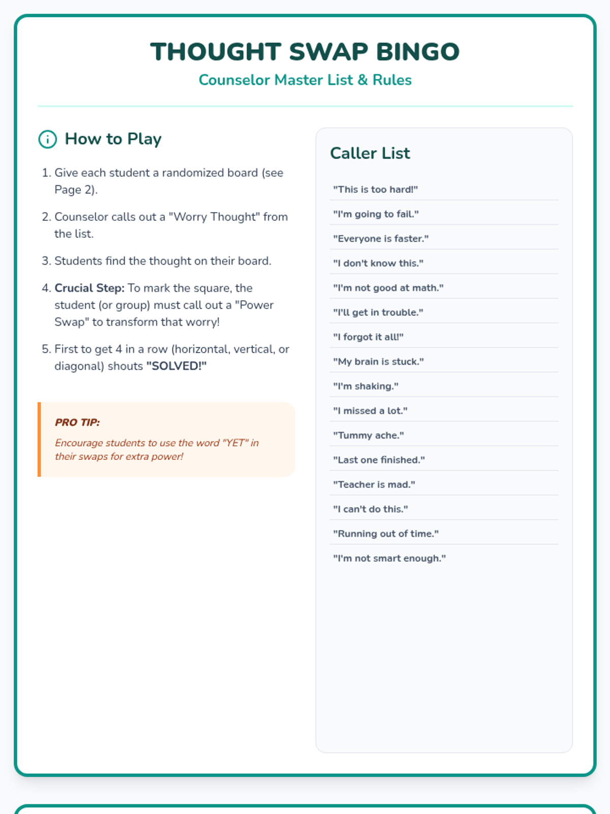 A 6-session counseling group designed to help students identify triggers, understand physical symptoms of anxiety, and build a personalized toolkit of coping strategies through a 'Calm Explorer' theme.