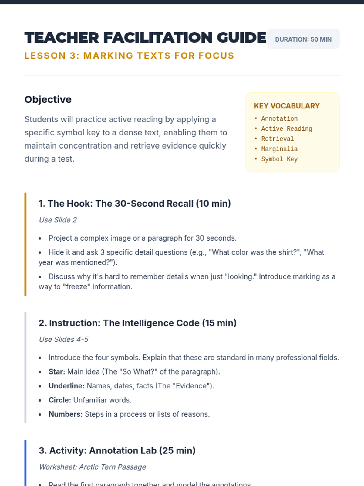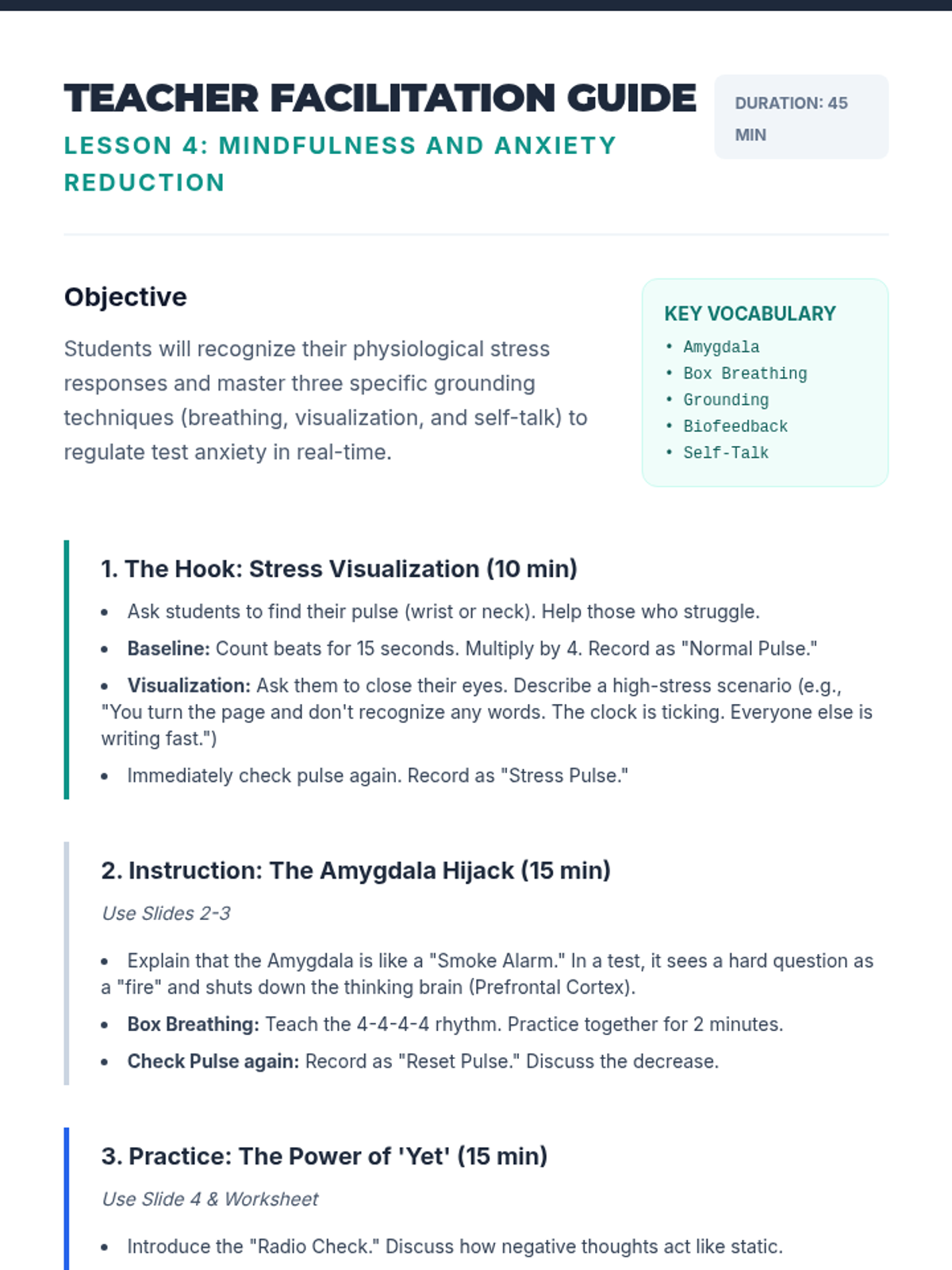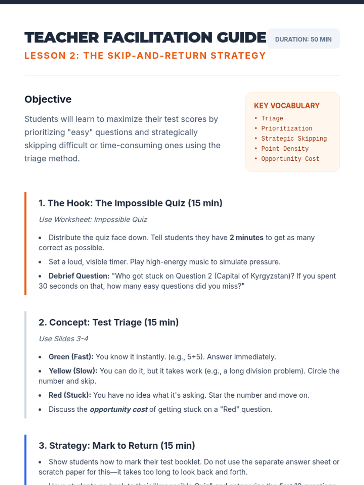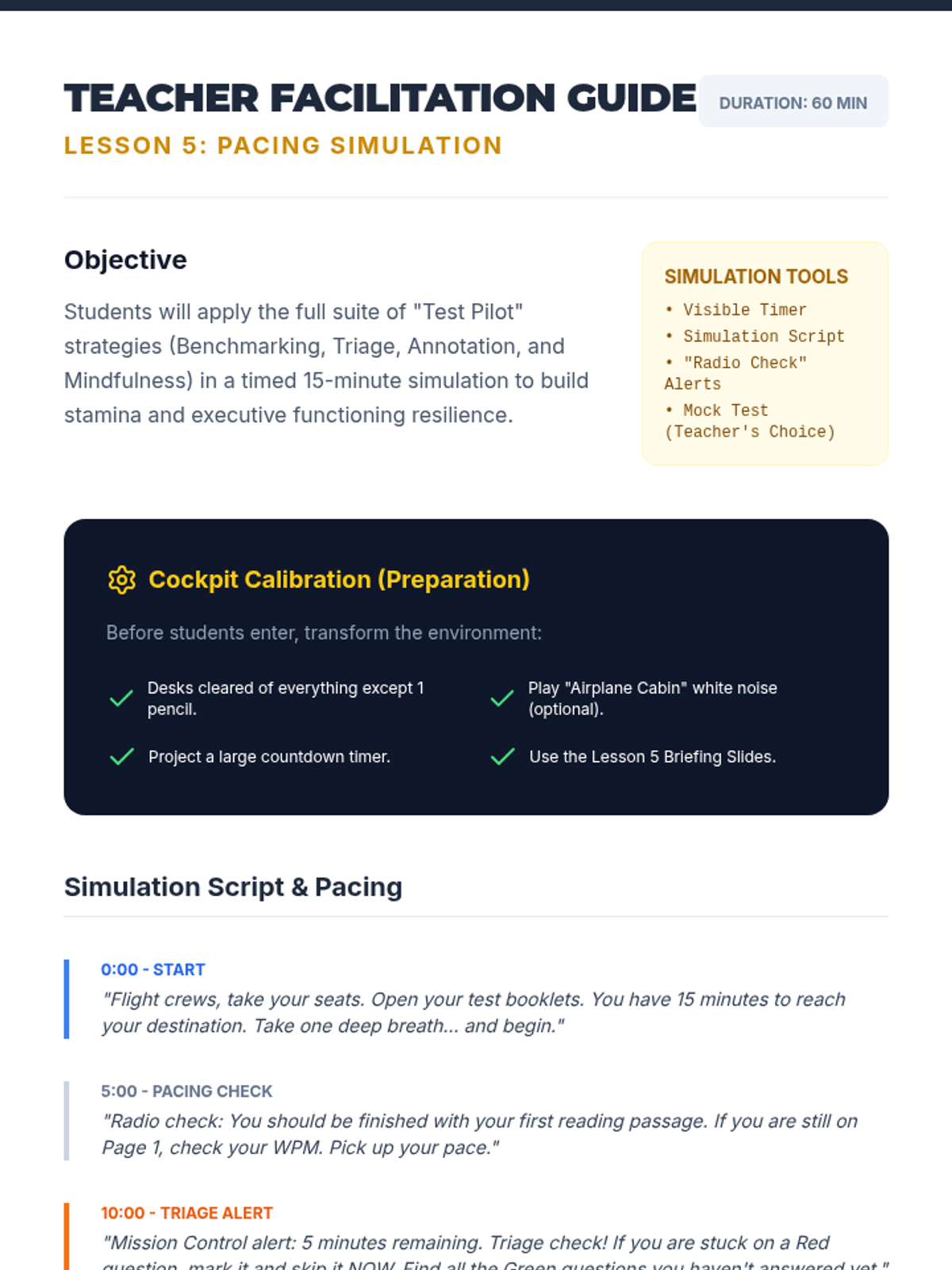 A comprehensive sequence for 7th Grade ESL students focused on developing the executive functioning skills needed for successful test-taking. Students learn to manage time, prioritize questions, annotate for focus, and regulate anxiety through a 'Test Pilot' theme.