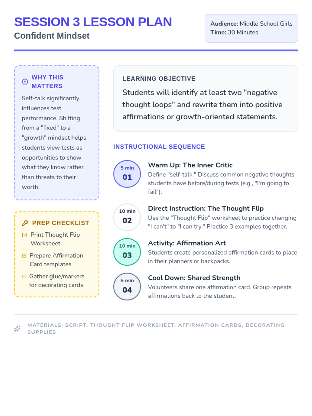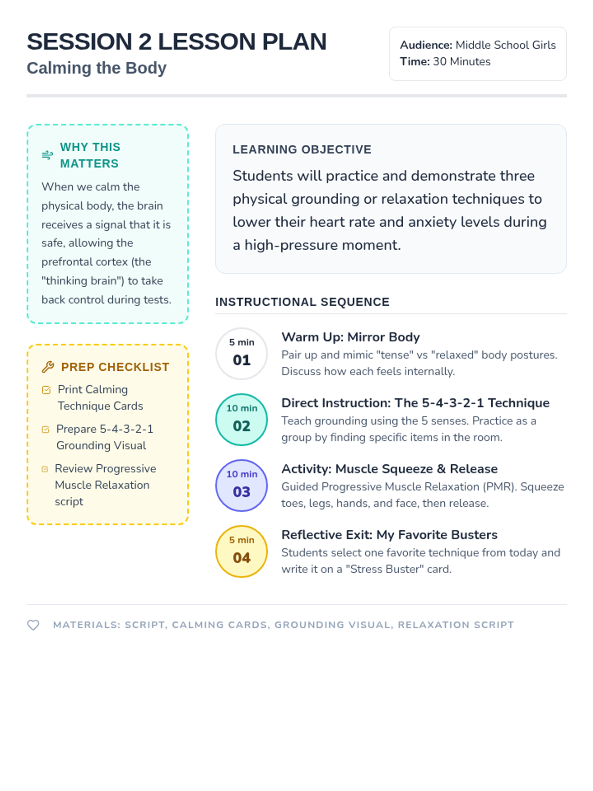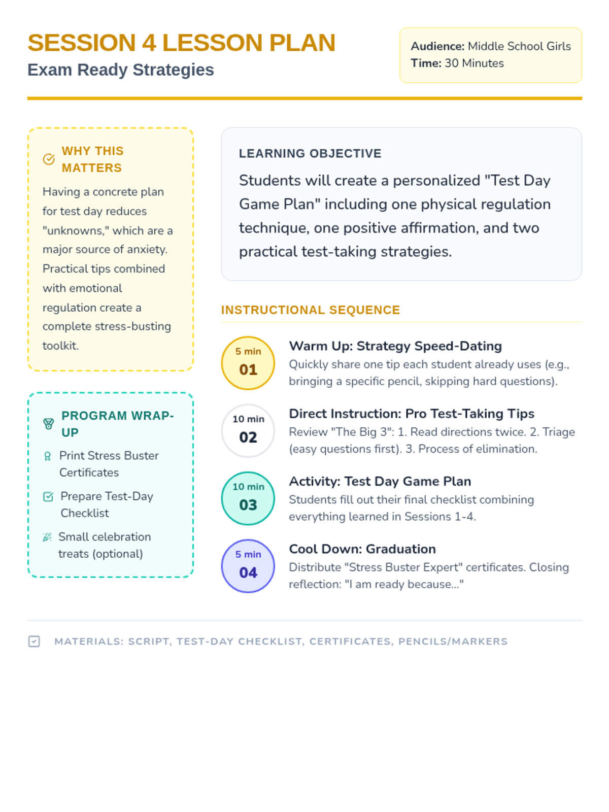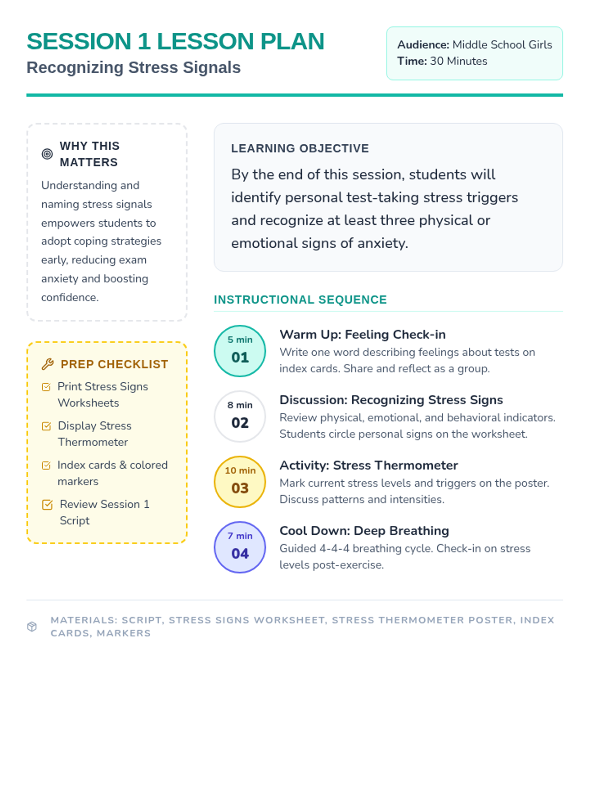 A four-session counseling program designed for middle school girls to identify stress signals, practice regulation techniques, and build test-taking confidence.