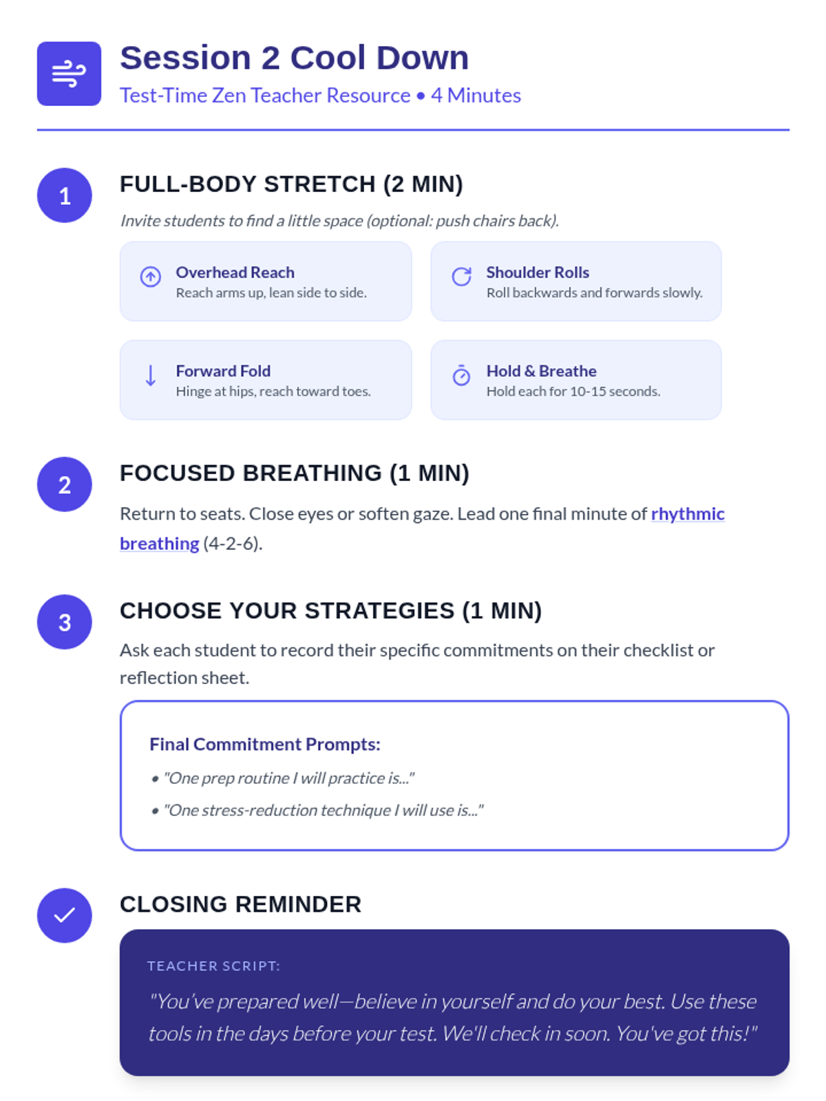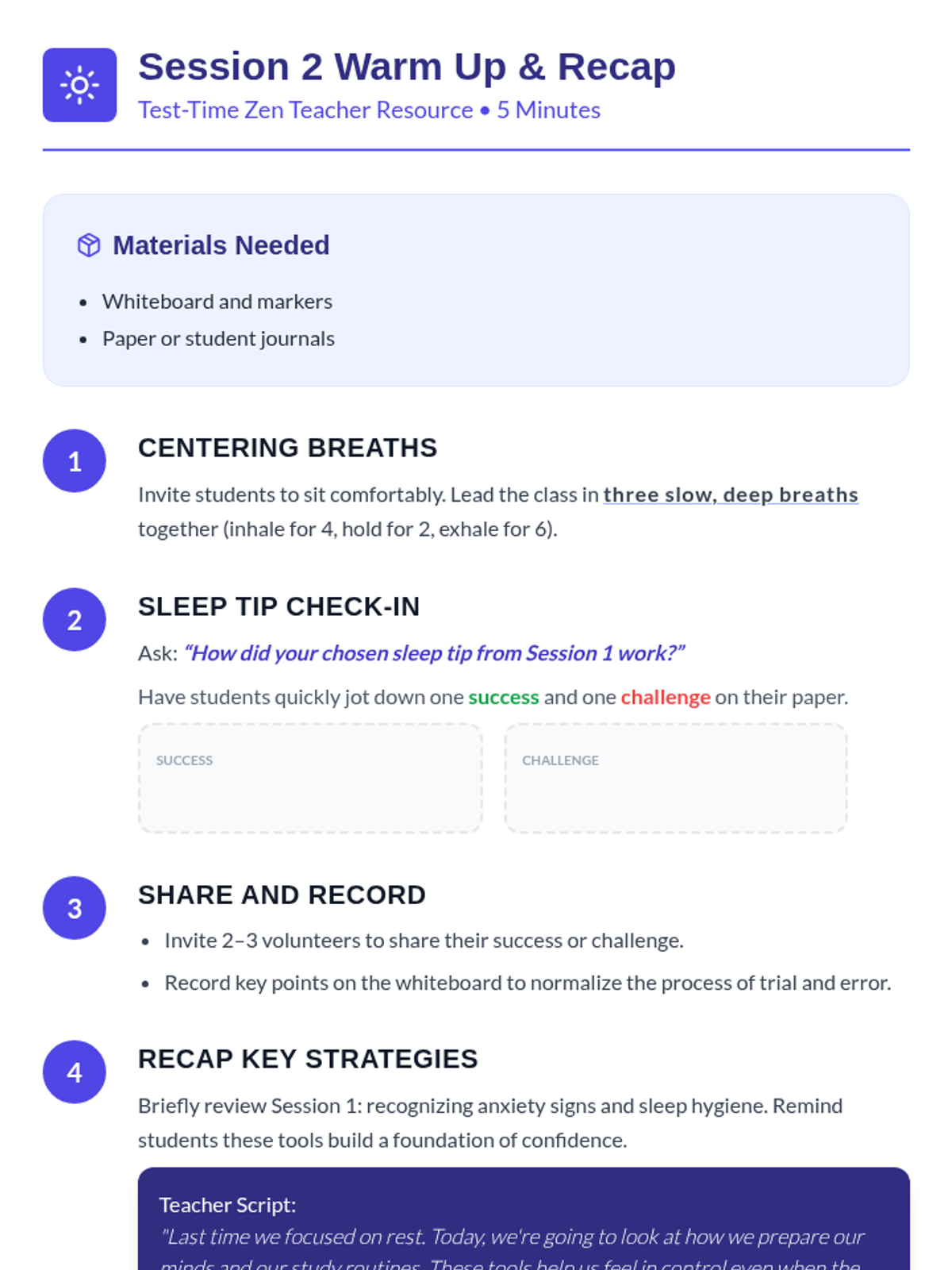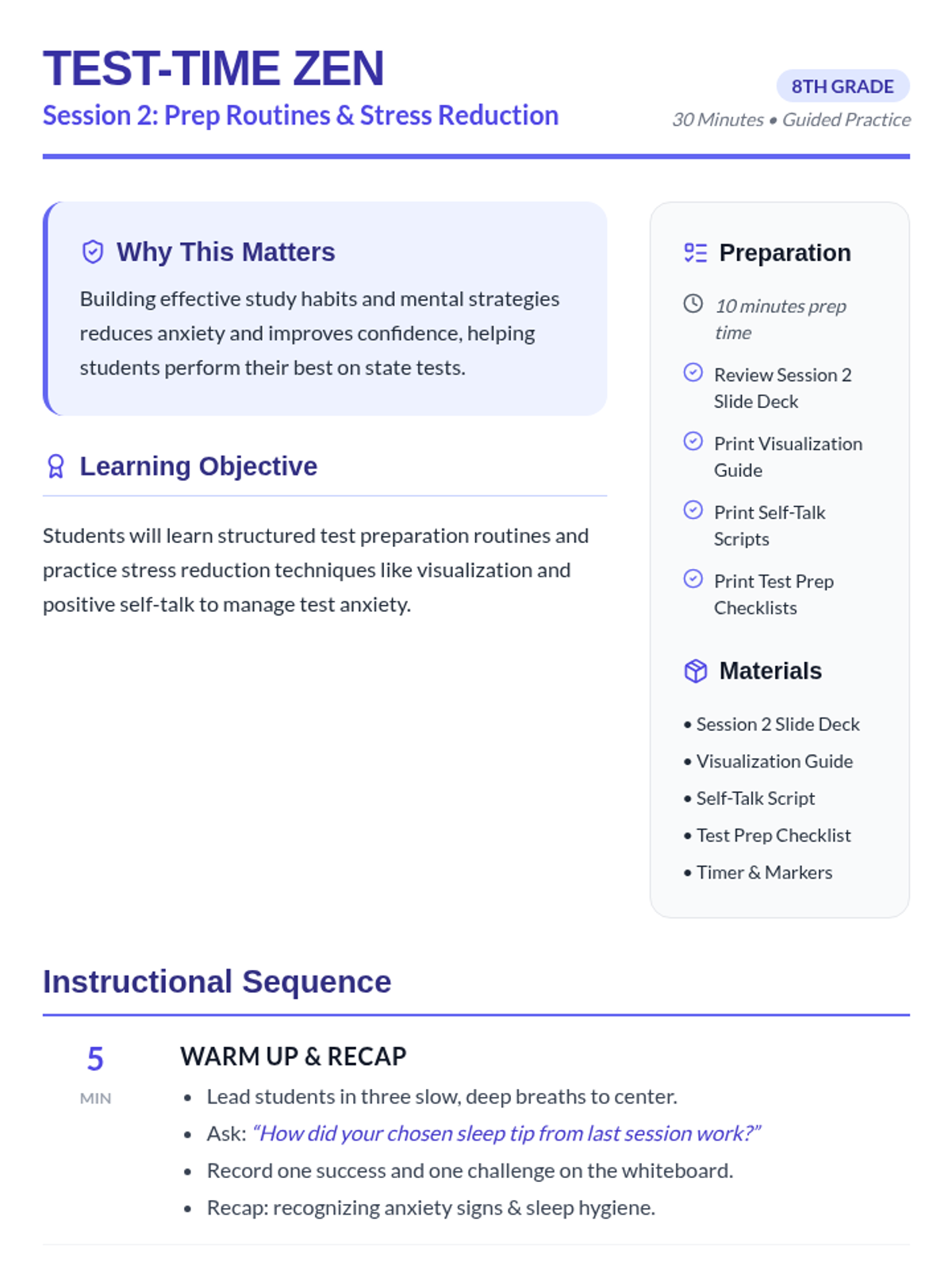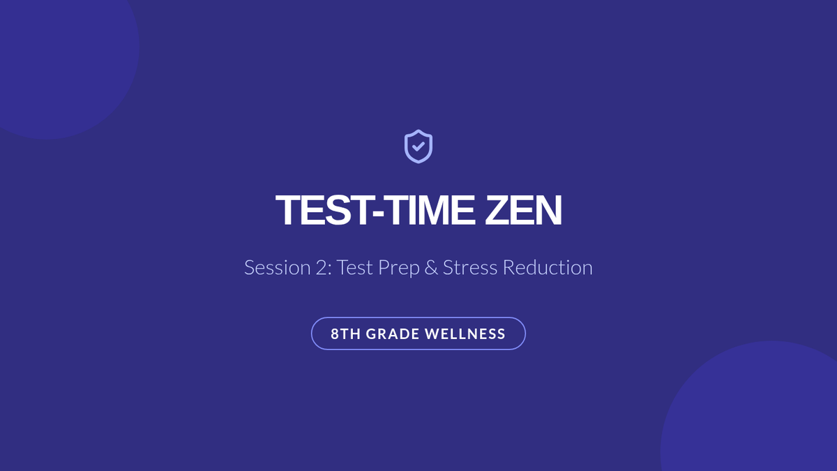 A 2-session series for 8th graders focused on managing state test anxiety through sleep hygiene, stress reduction, and structured prep routines.