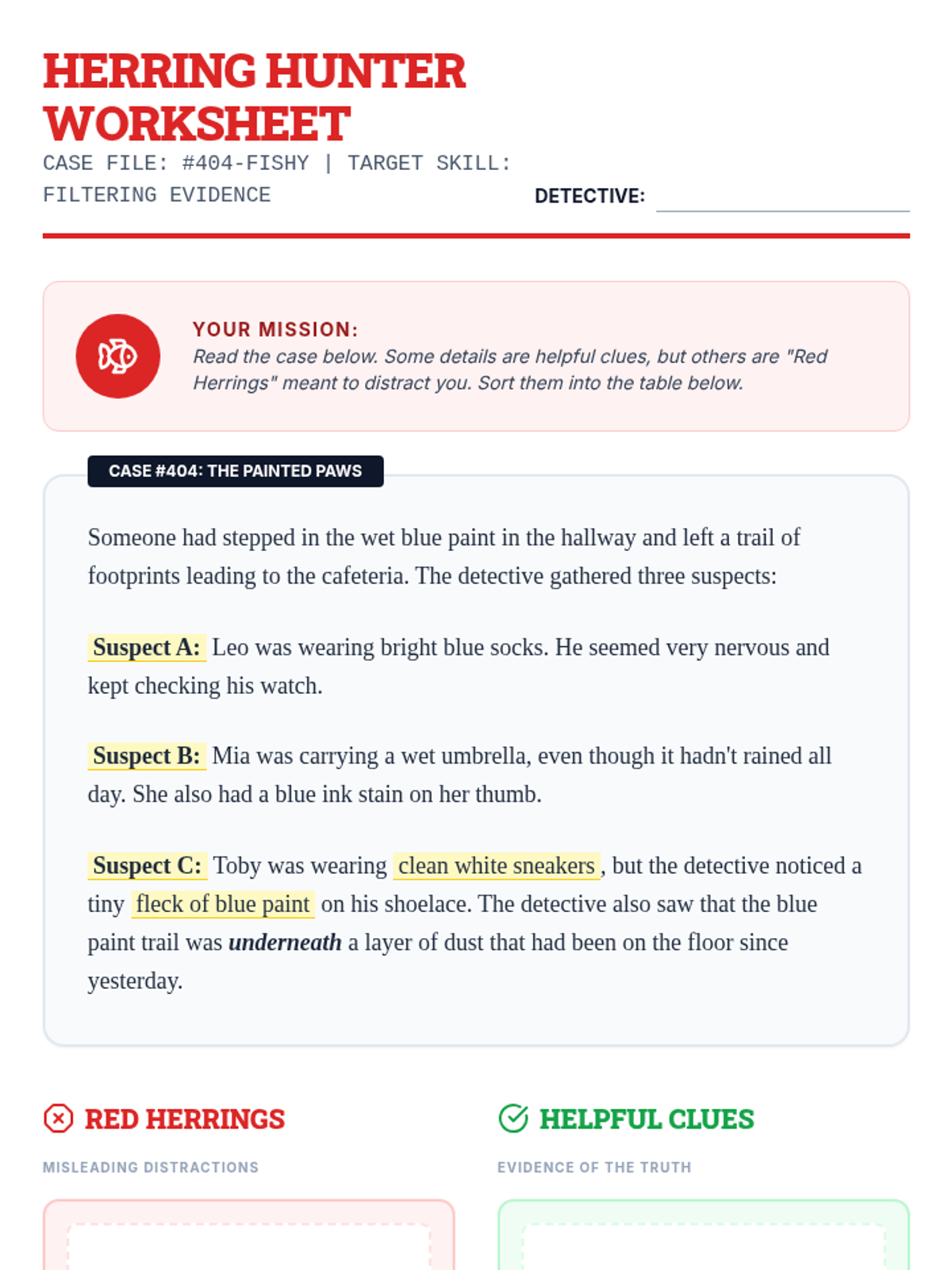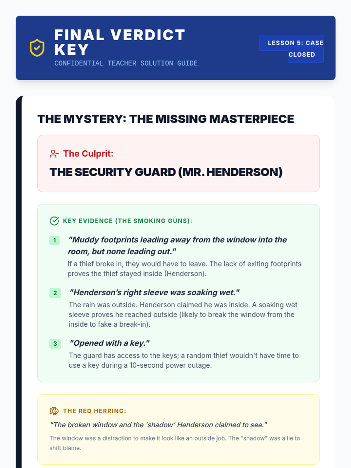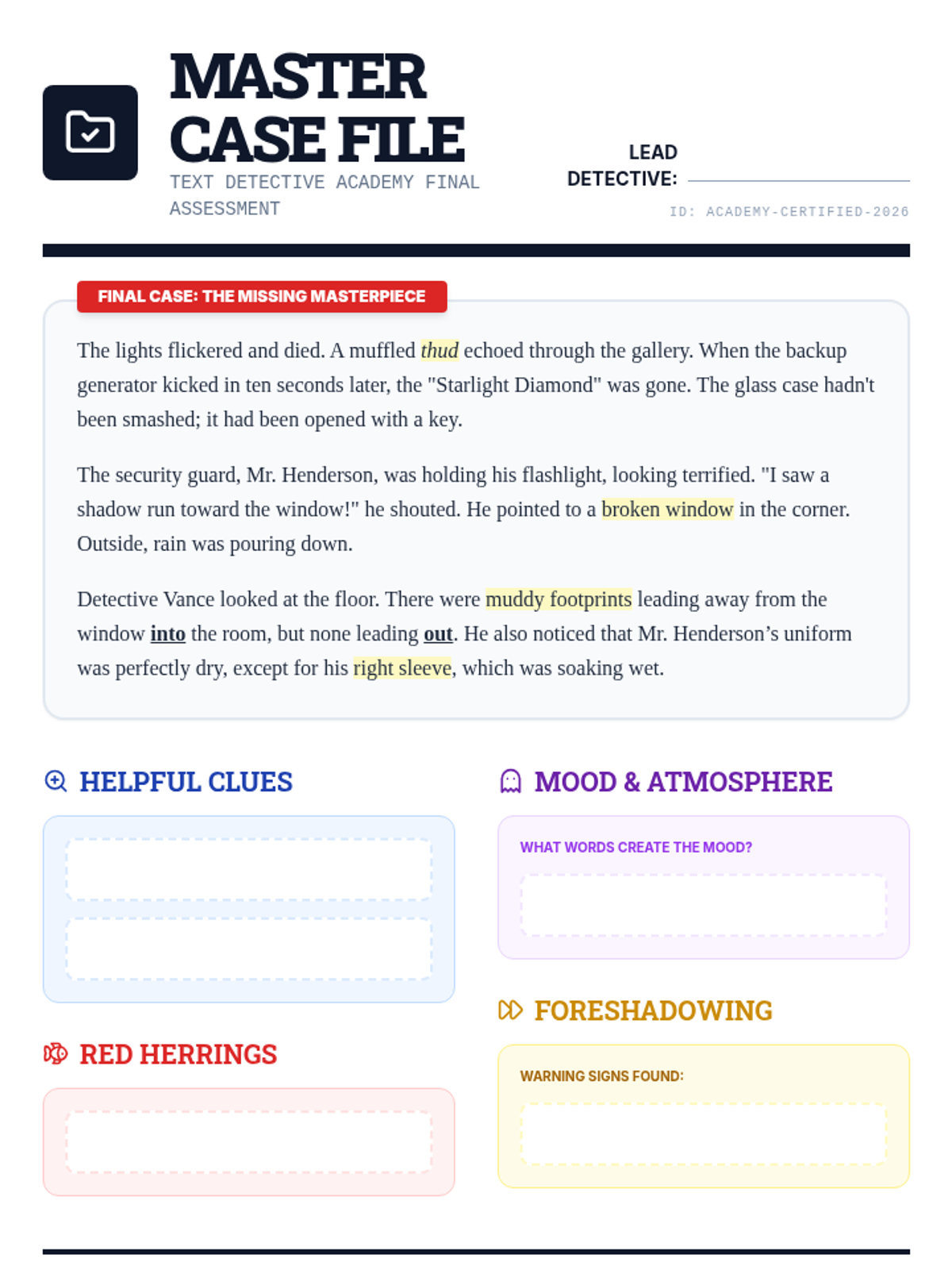 A mystery-themed sequence designed for 7th-grade students to master the art of making predictions and drawing inferences from text. Students act as 'text detectives,' analyzing clues, filtering out red herrings, and citing textual evidence to solve narrative and informational mysteries.