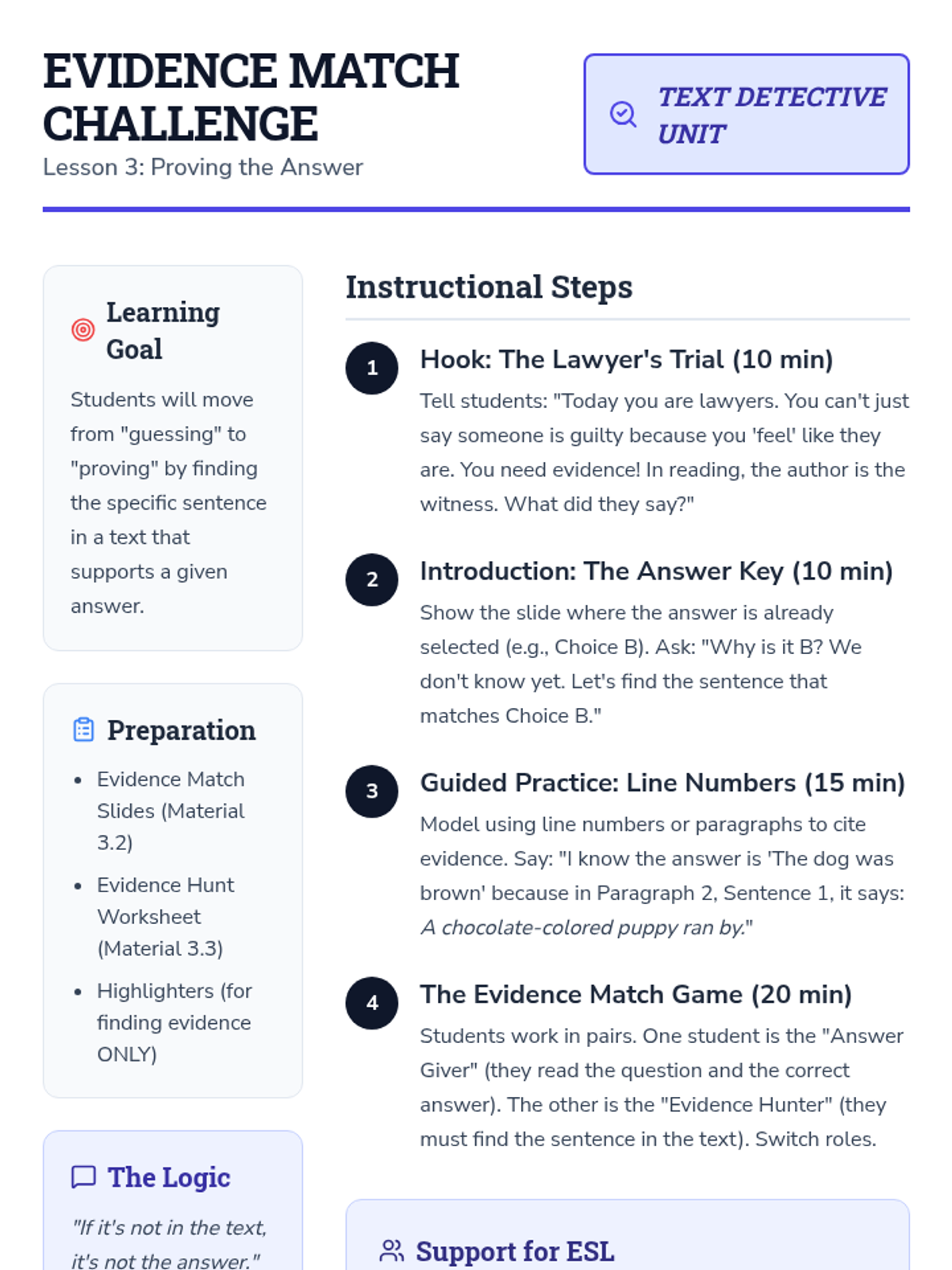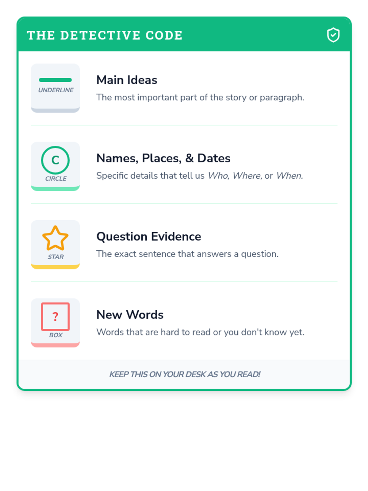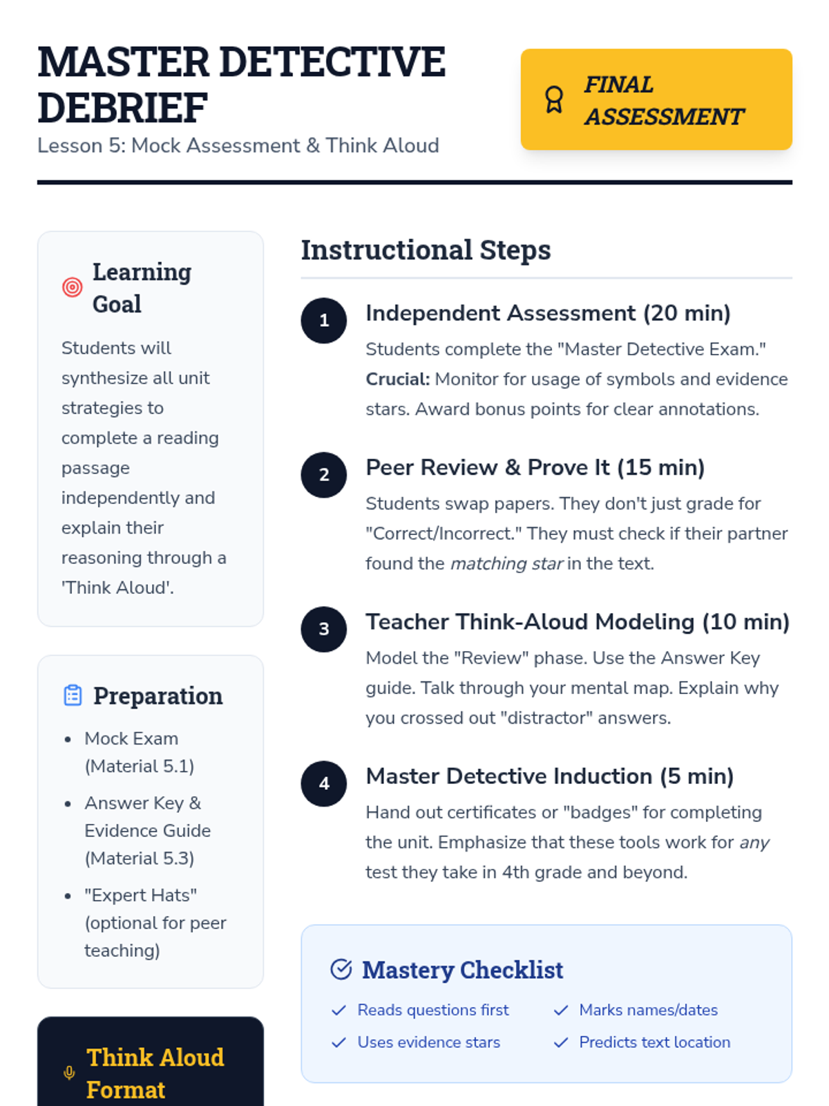 A 5-lesson unit for 4th Grade ESL students focusing on test-taking strategies for reading comprehension. Students learn to use their 'detective tools' to find evidence, annotate effectively, and navigate passages with a focus on 'proving' their answers rather than guessing.
