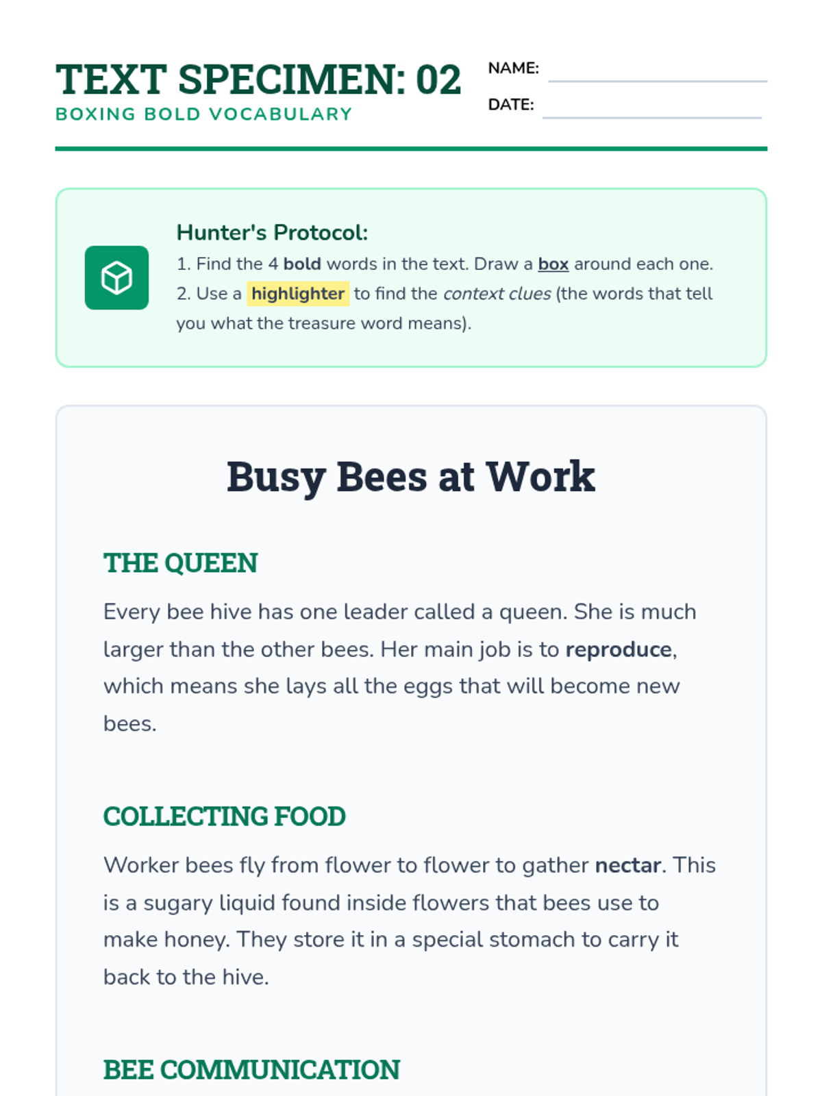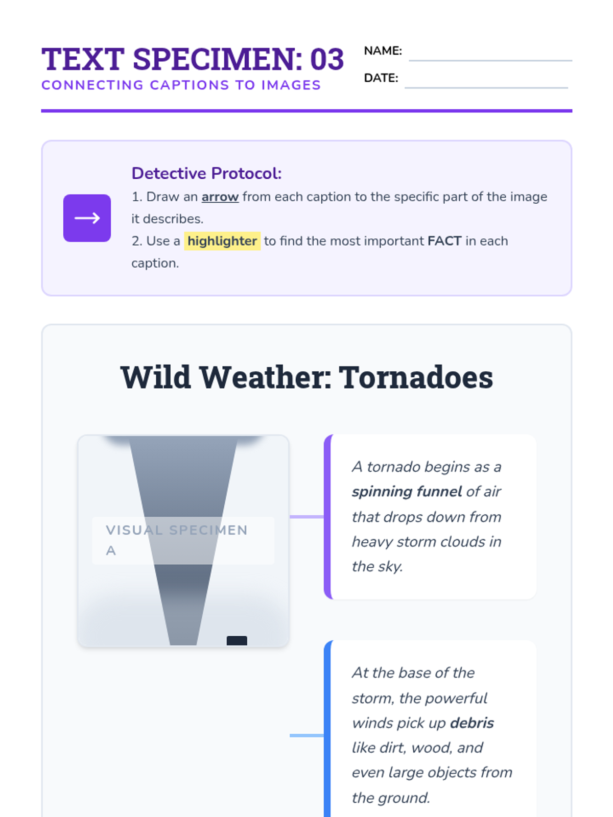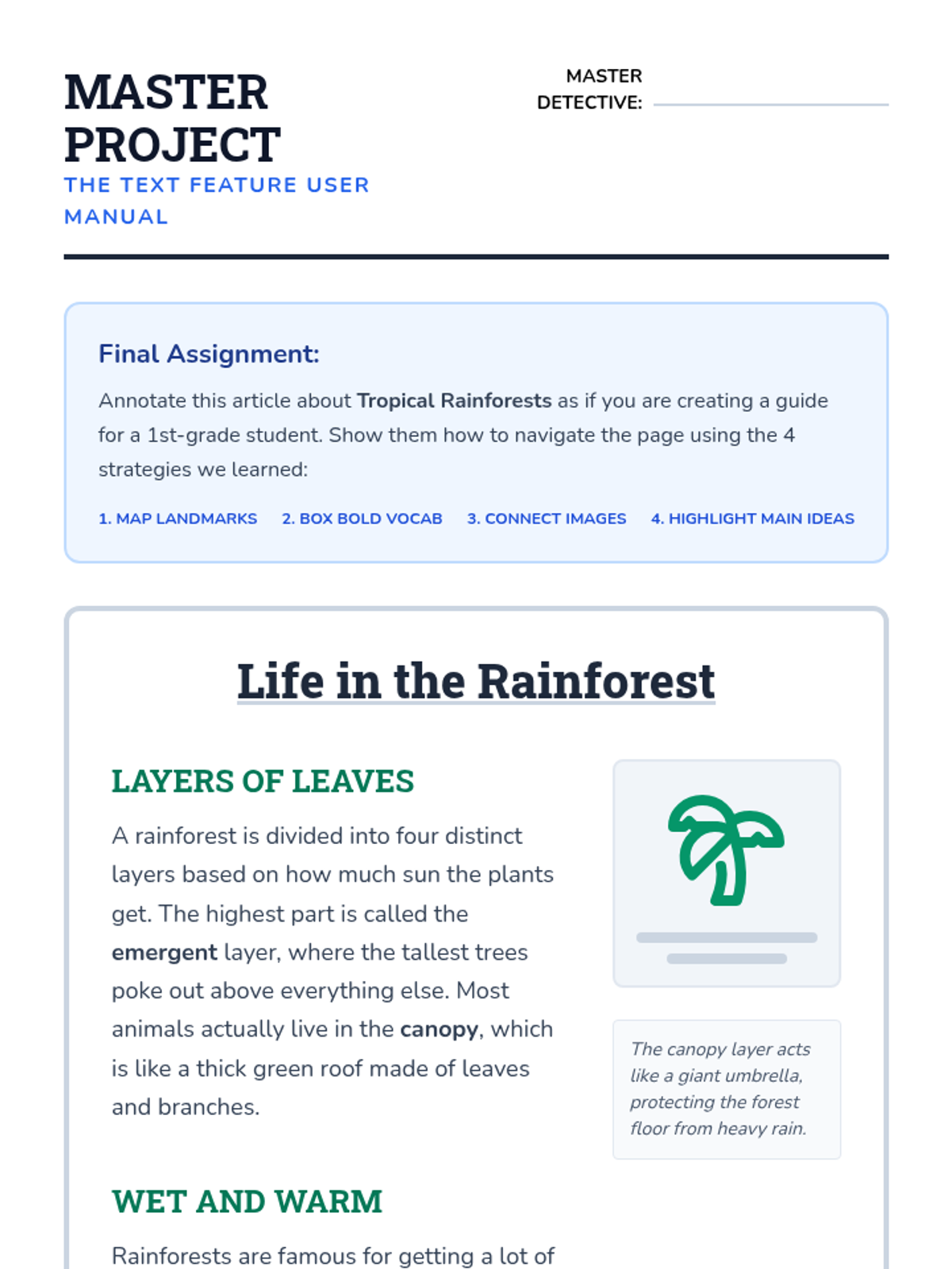 A 3rd-grade sequence focused on teaching students with processing difficulties how to navigate informational texts using annotation and highlighting techniques. Through a 'text detective' theme, students analyze informational articles as 'specimens' to identify features, vocabulary, and main ideas.