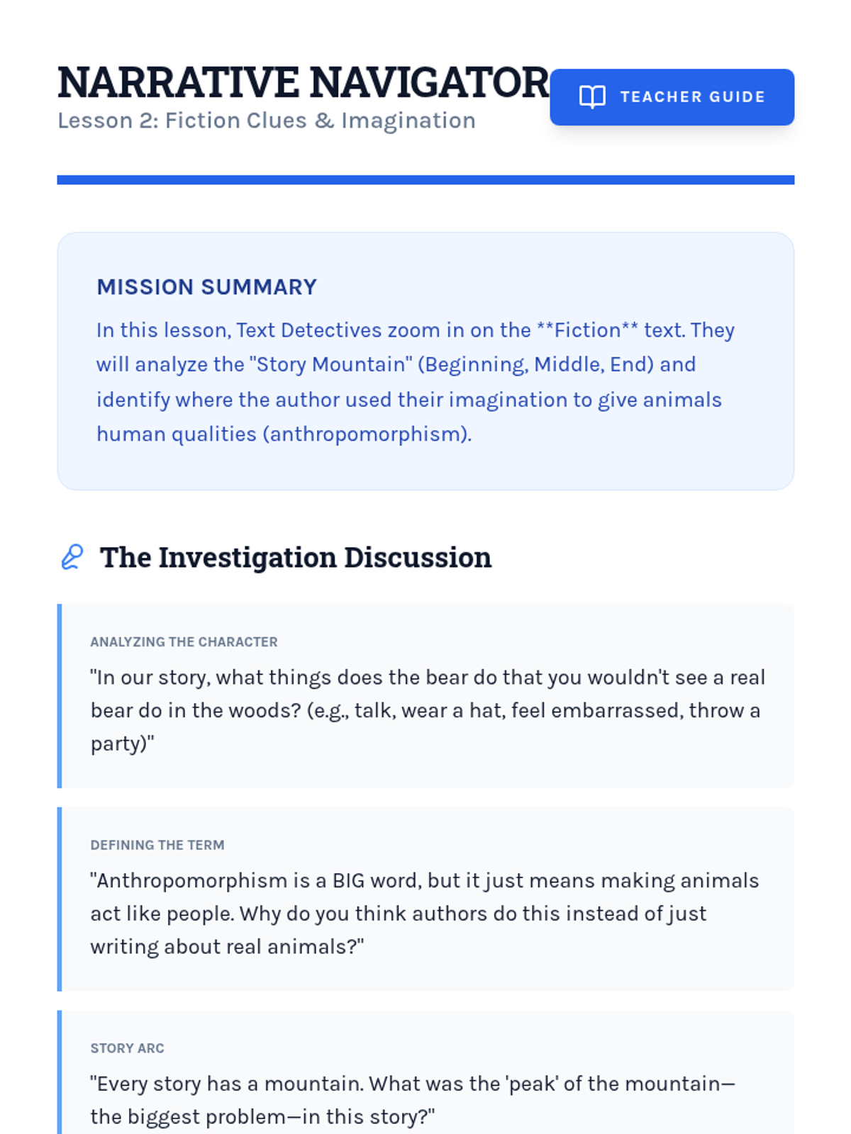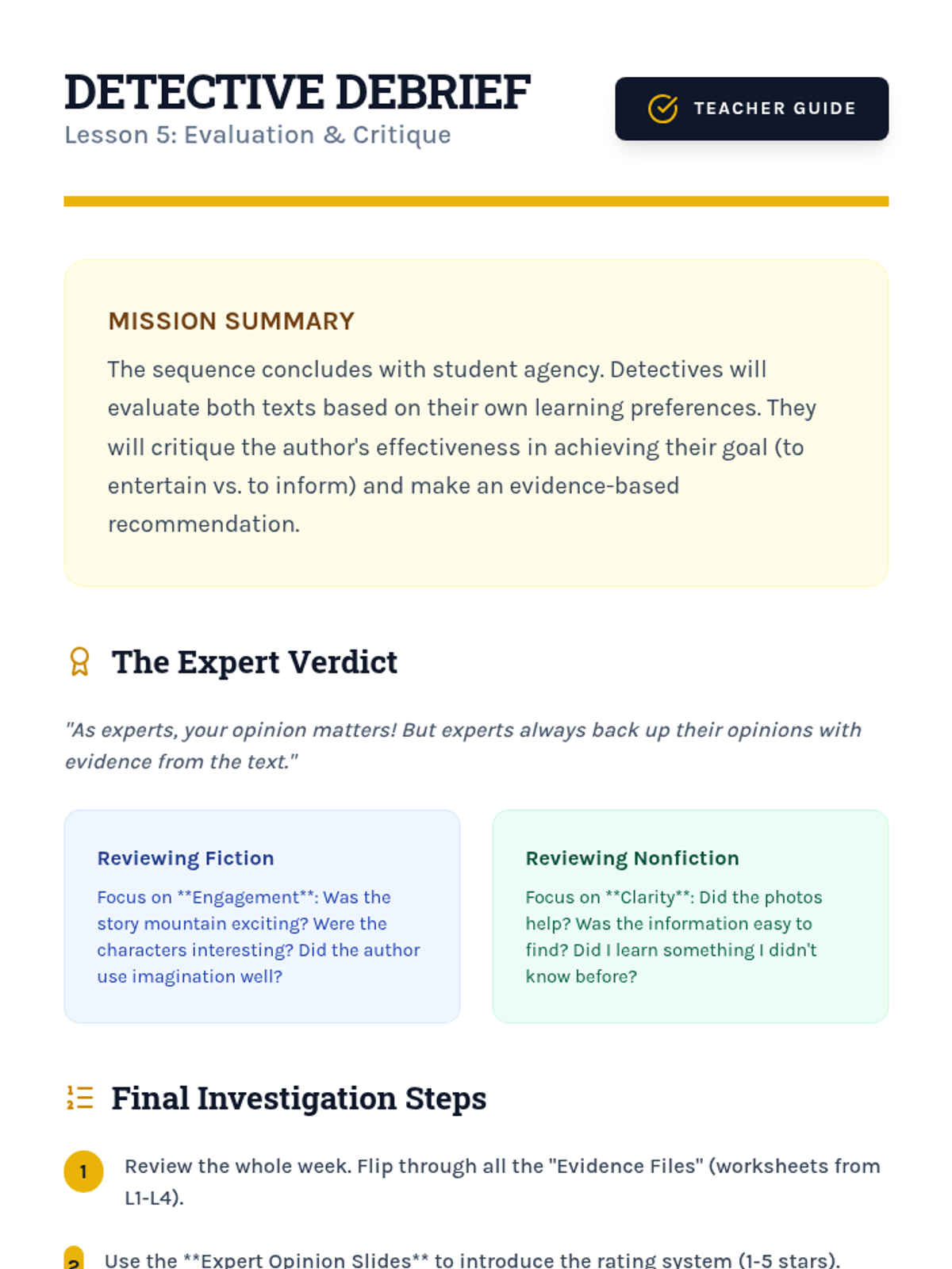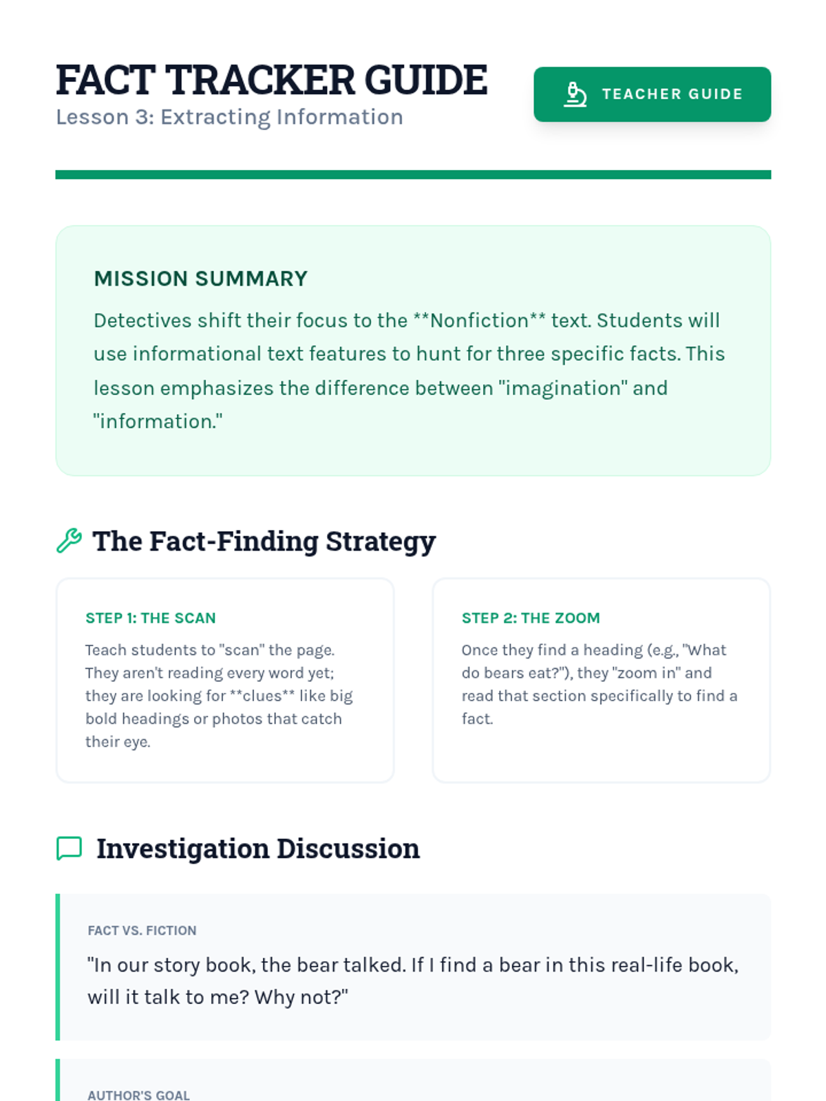 A 2nd Grade ELA sequence where students become 'Text Detectives' to distinguish between fiction and nonfiction texts. Through a series of 5 lessons, students learn to identify text features, analyze narrative elements, extract key facts, compare content across genres, and evaluate author approaches using paired texts on the same topic.